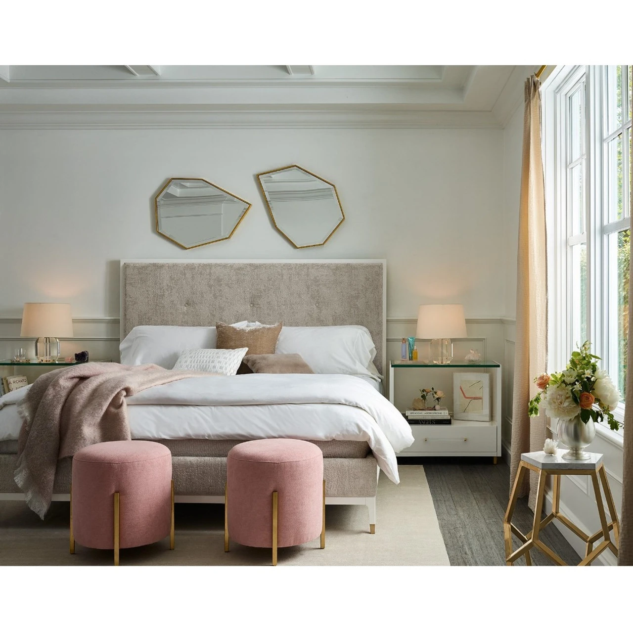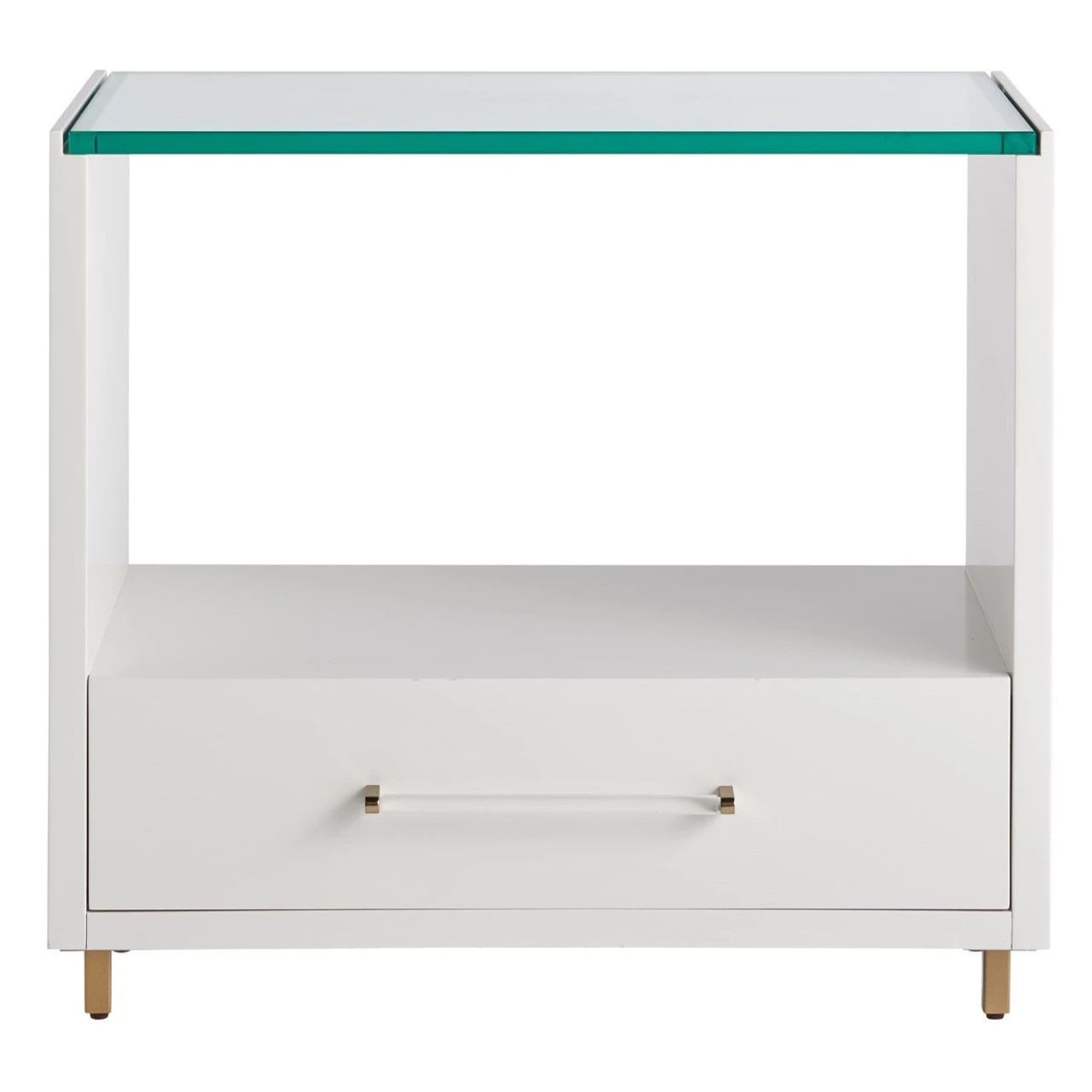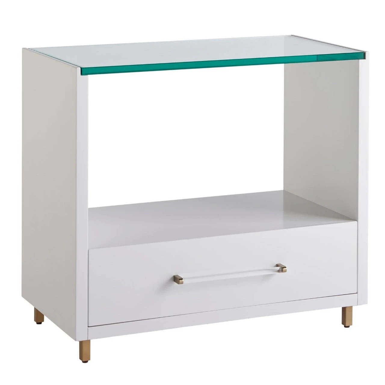 A charming juxtaposition of materials, the Peony Nightstand finds seamless balance between a glass top, soft gold and acrylic bar hardware and a chic White Lacquer finish. For added flair, the legs are also finished in soft gold.