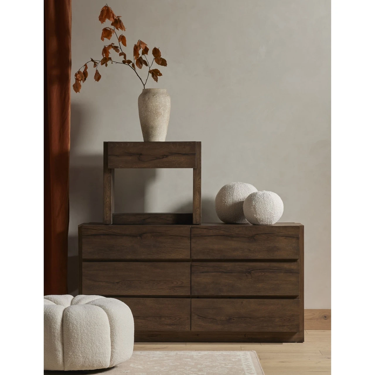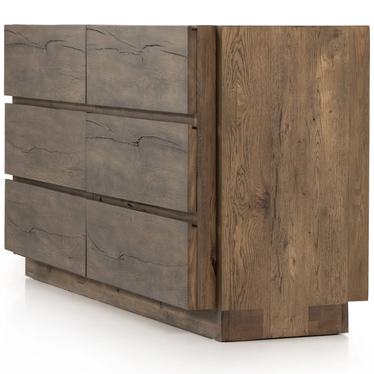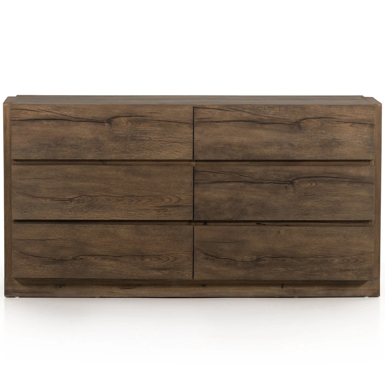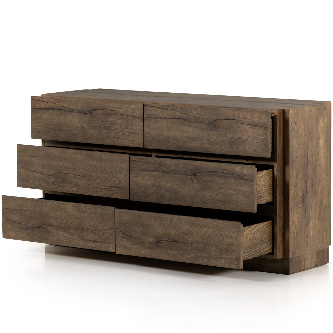 Made from solid oak and oak veneer, visible knots and graining play up the natural beauty of this spacious six-drawer dresser, with overscale joinery for extra heft.