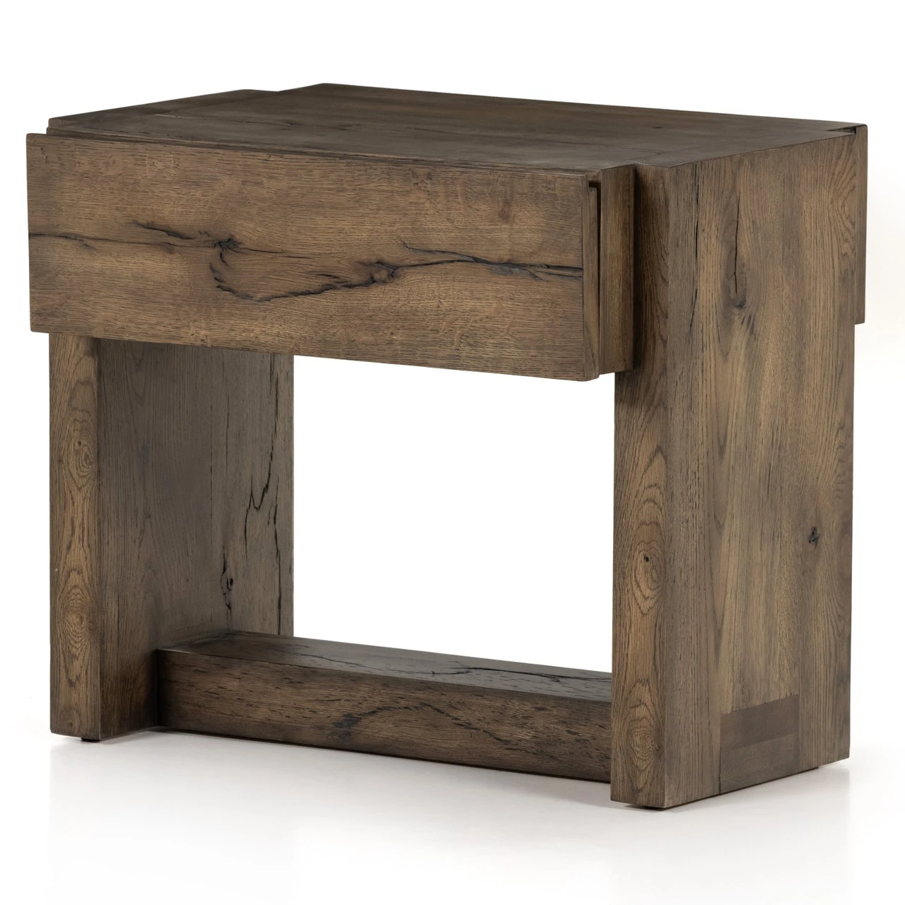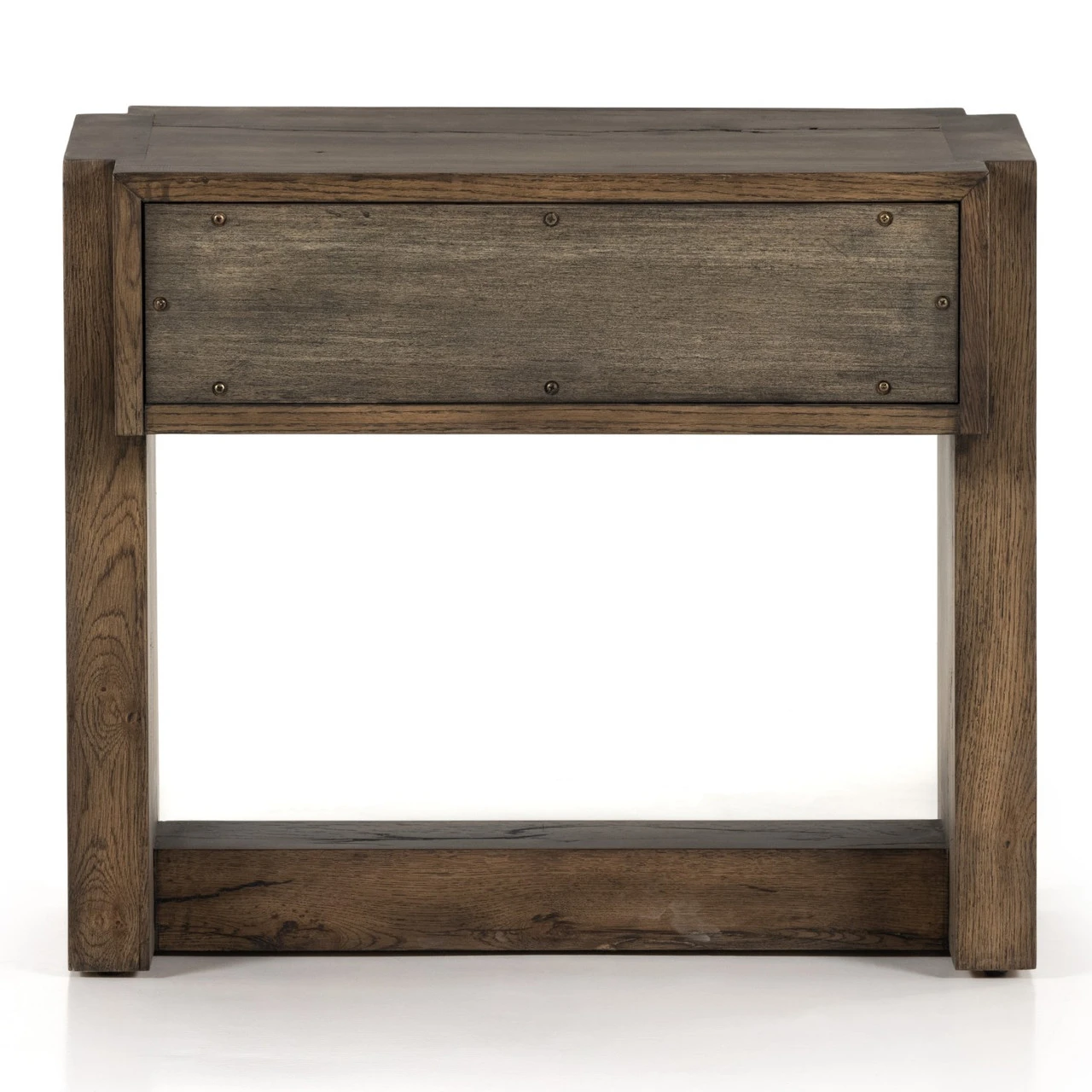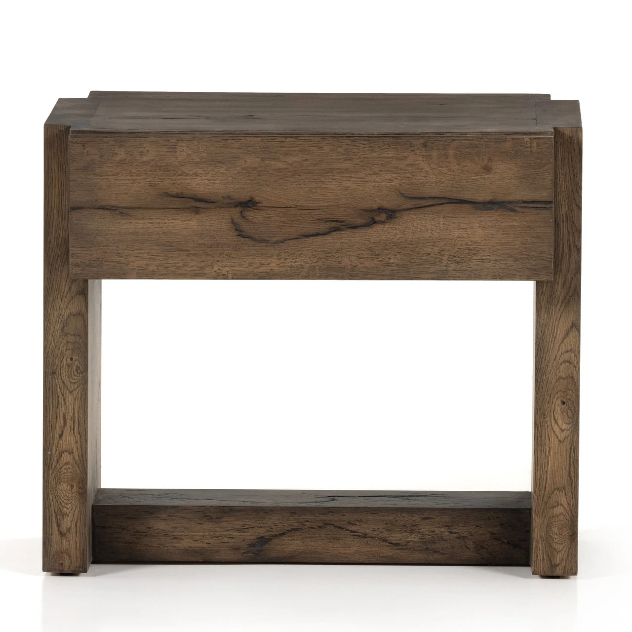 Made from solid oak and oak veneer, visible knots and graining play up the natural beauty of this stylish nightstand, with overscale joinery for extra heft.