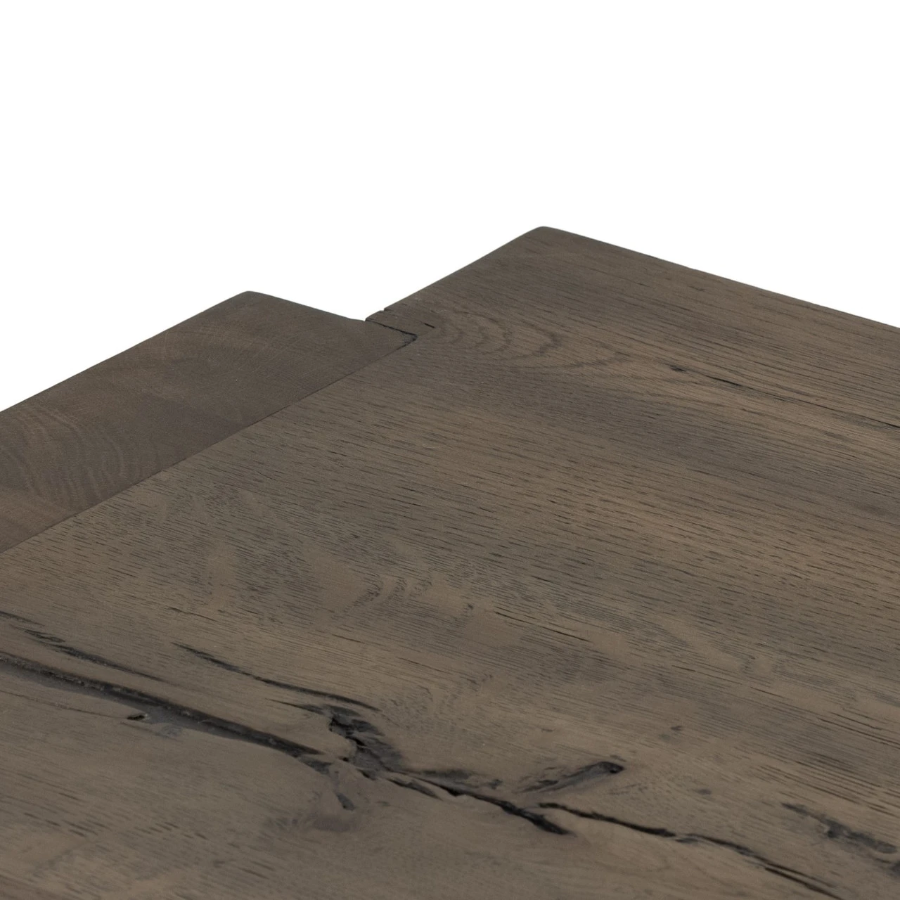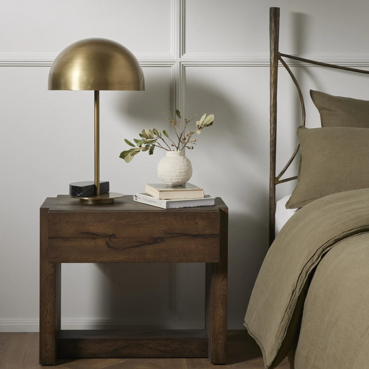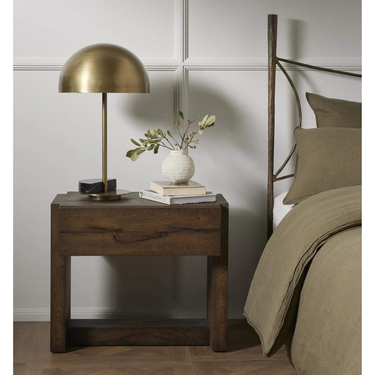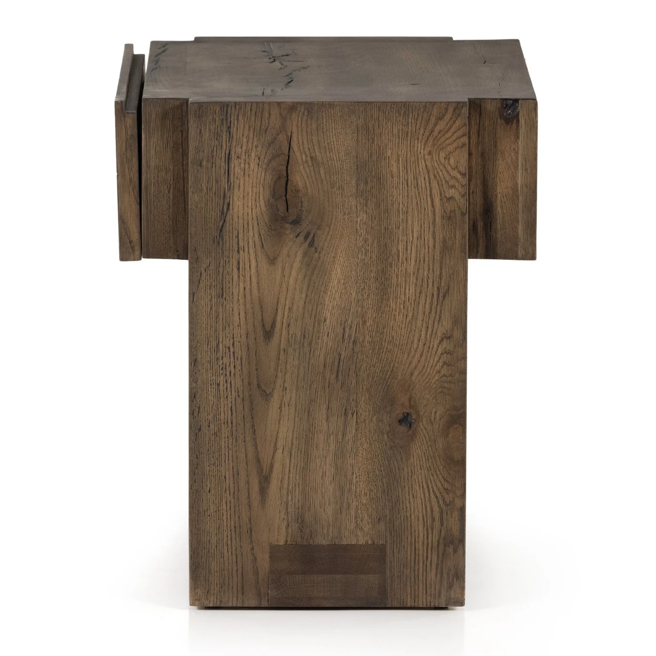 Made from solid oak and oak veneer, visible knots and graining play up the natural beauty of this stylish nightstand, with overscale joinery for extra heft.