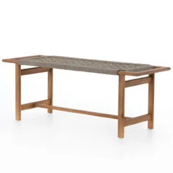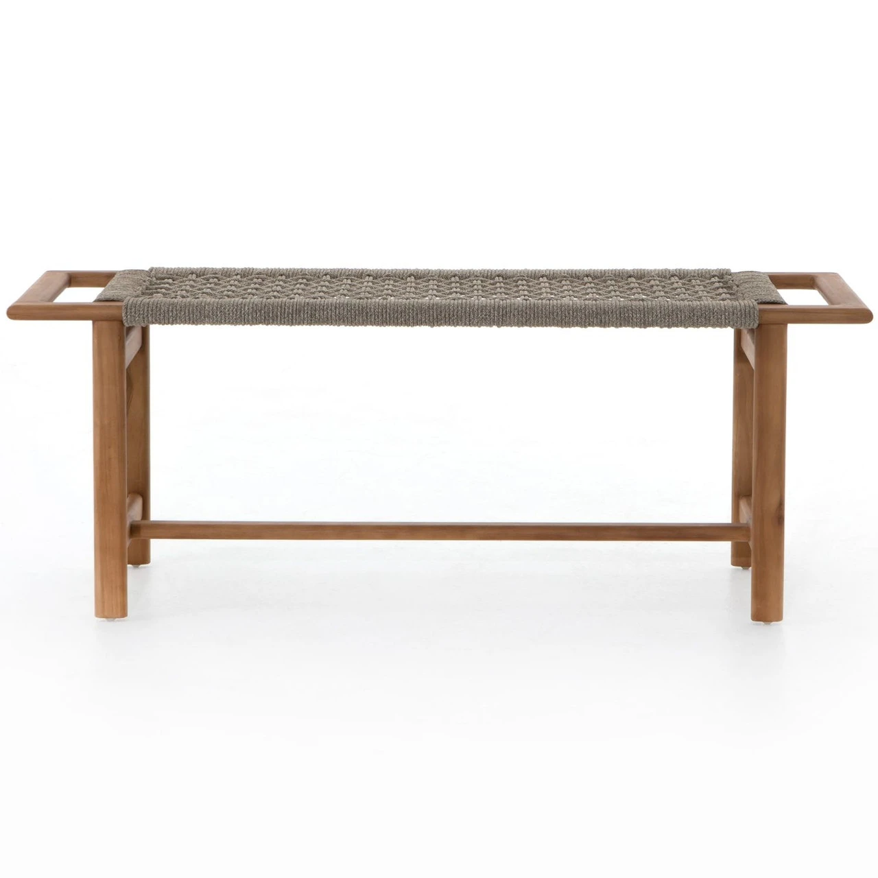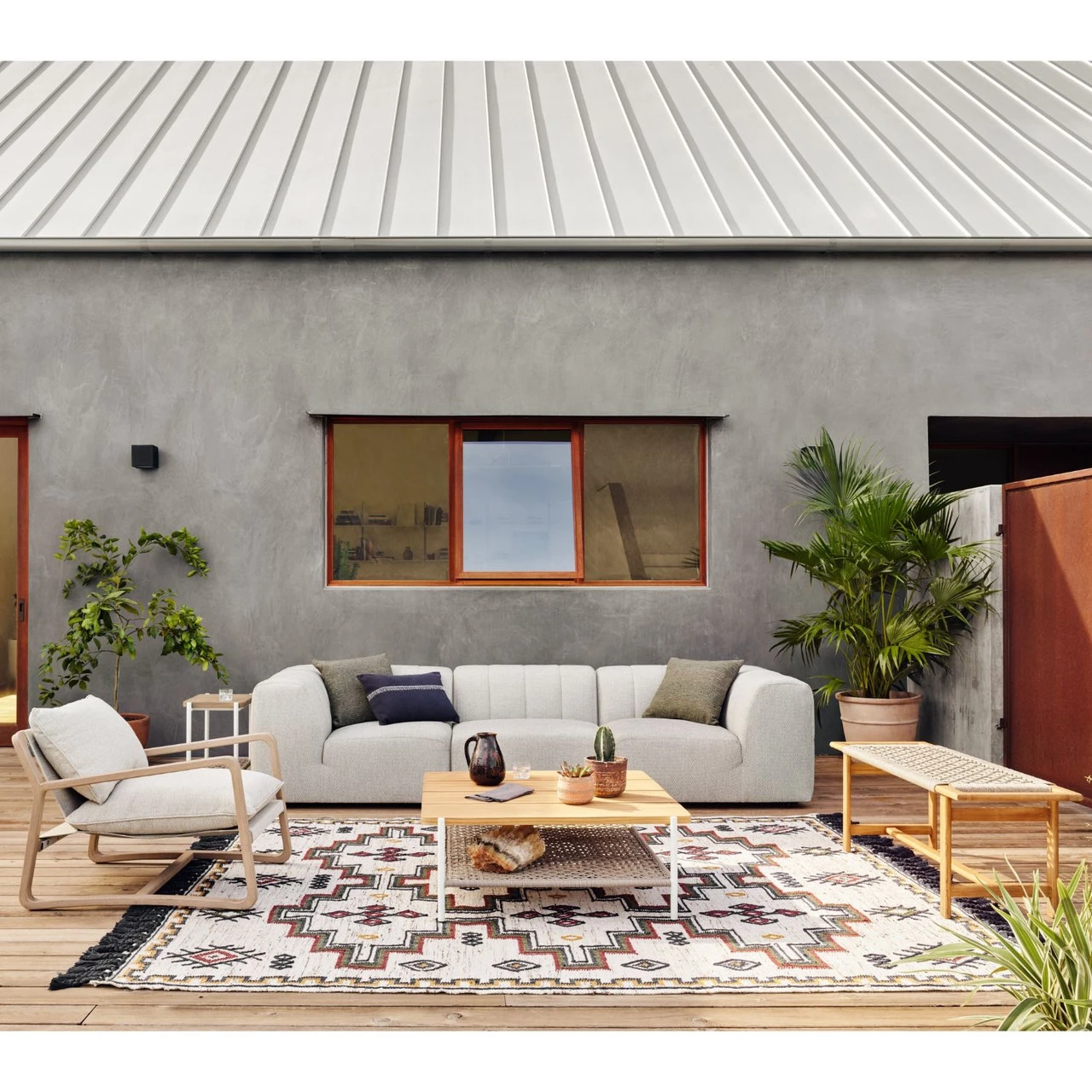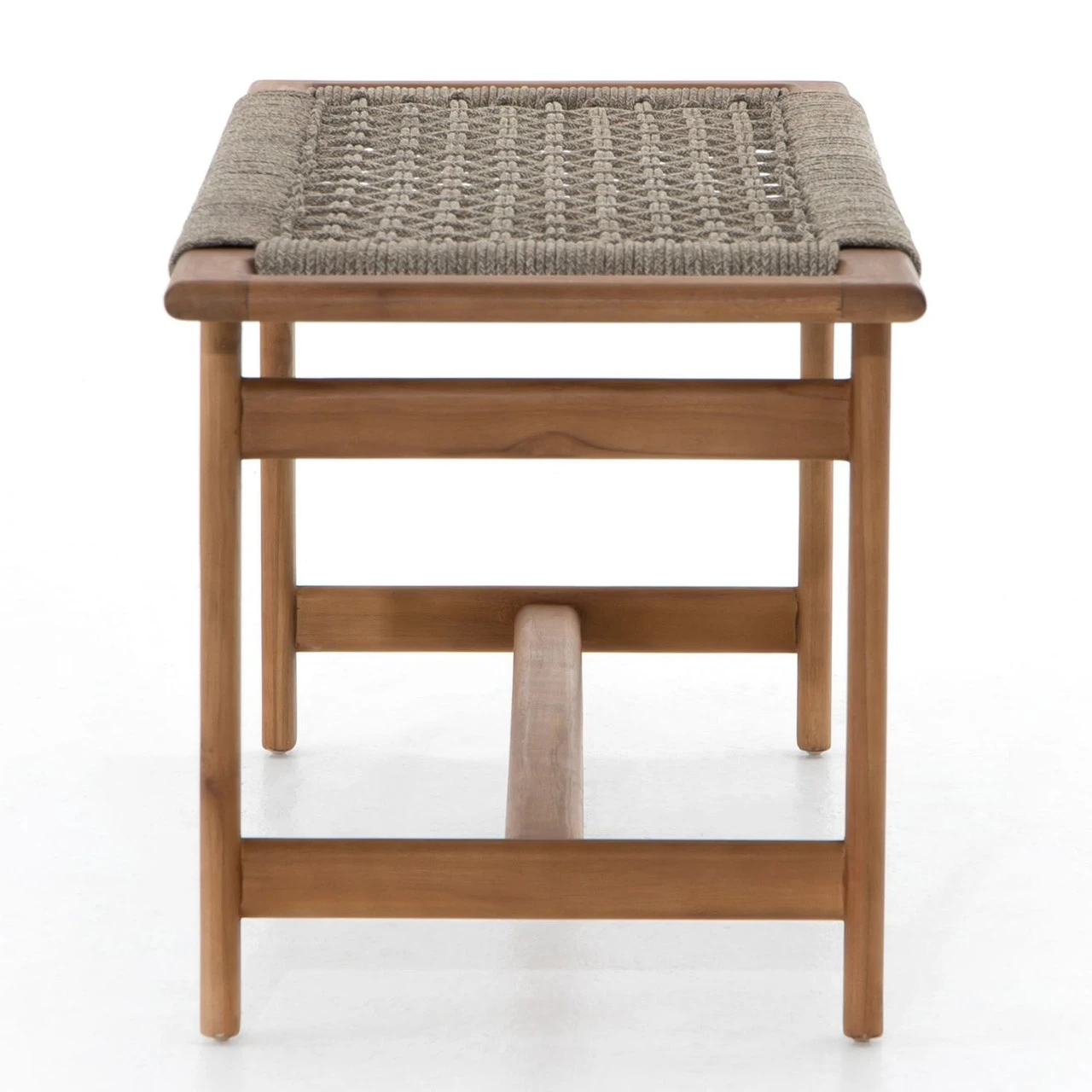 Inspired by the texture-driven nature of Indian design, natural teak forms a slim profile for woven taupe seating, bolstered by a discreet aluminum support. Cover or store indoors during inclement weather.