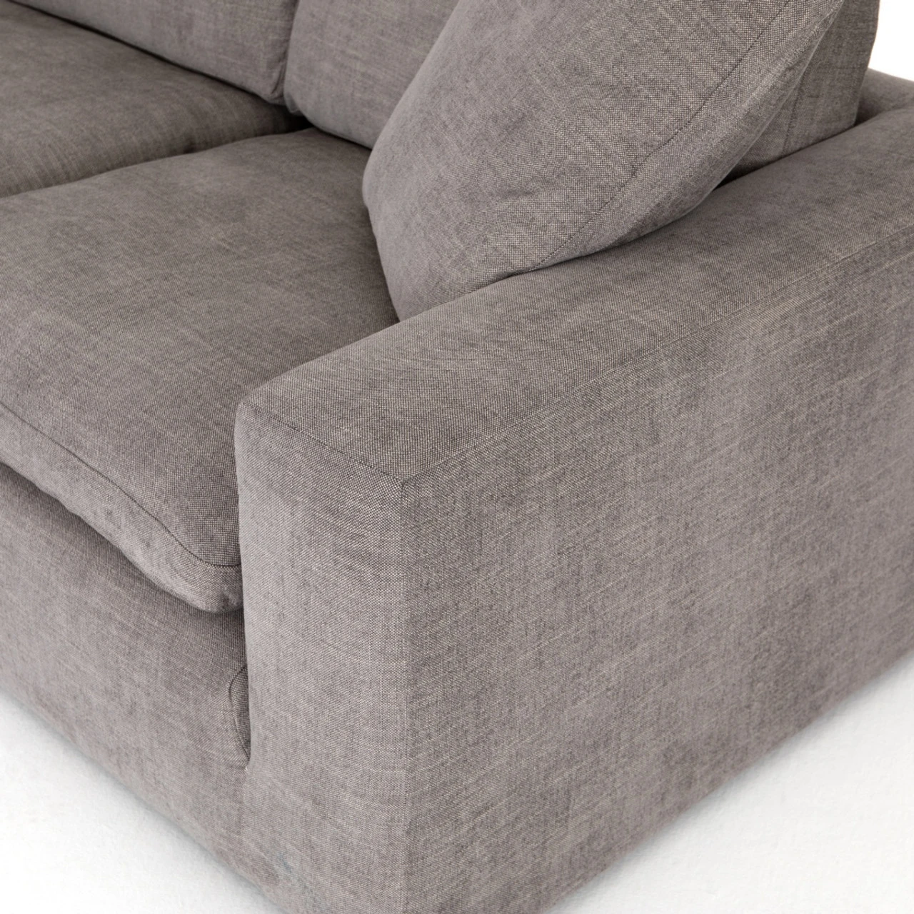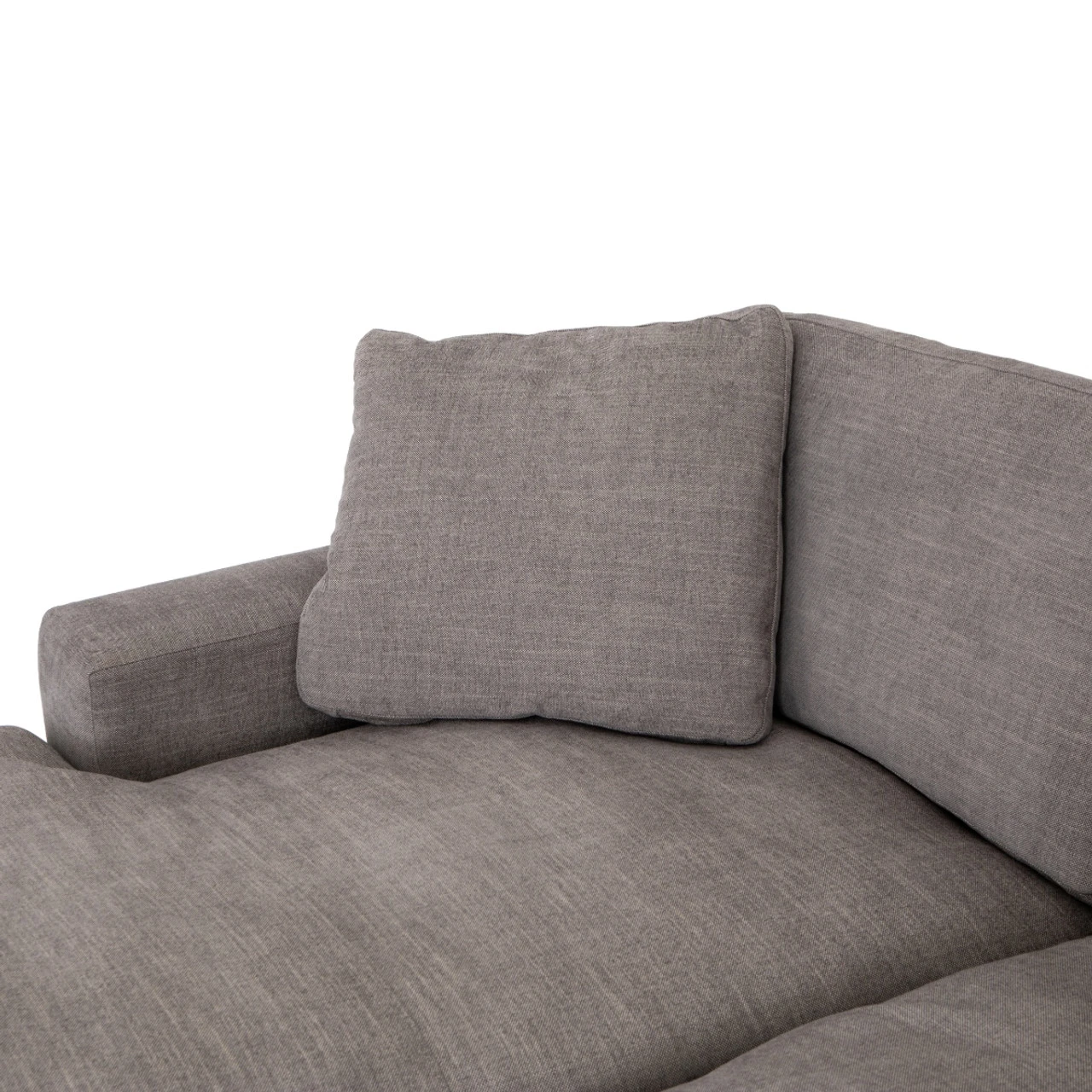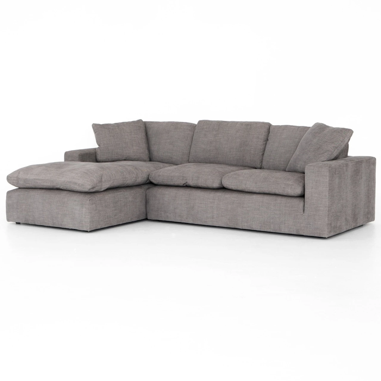 Simple elegance, modern design and luxurious comfort defines our Plume Upholstered Block Arm Pewter Grey Large Sectional Sofa. Sink-in luxury, squared. Block arms hold invitingly ample feather-and-down cushioning. Left arm facing chaise to two-piece sectional, stylishly oversized for cool lounging comfort.