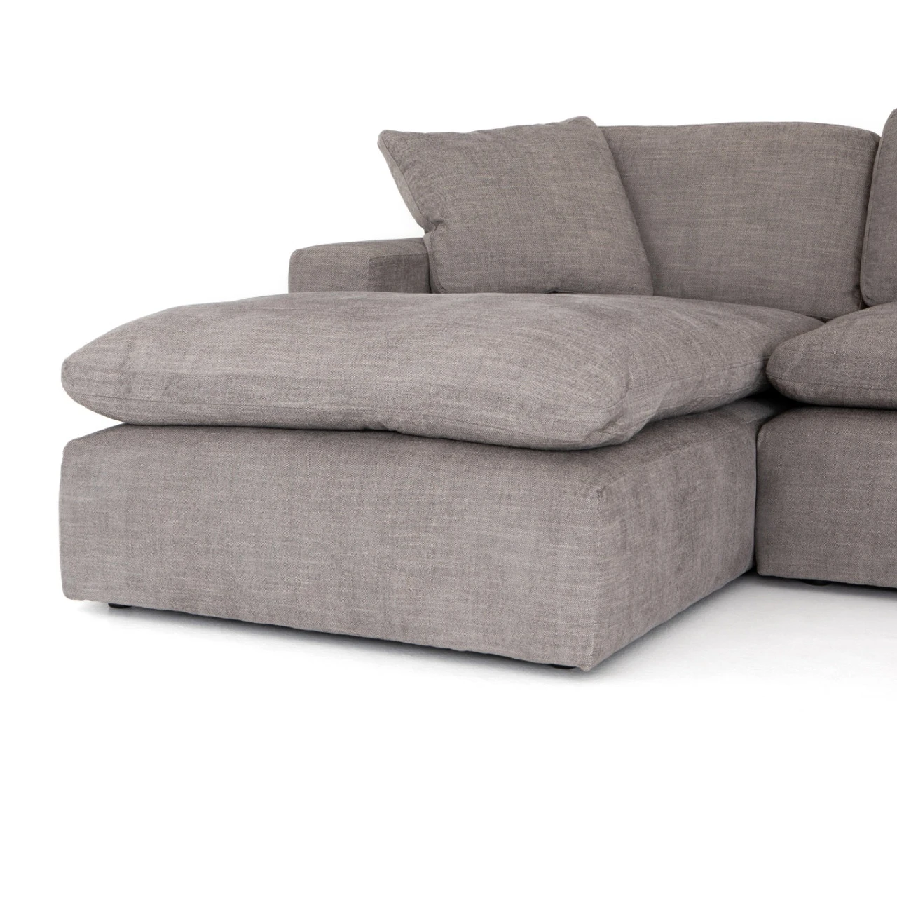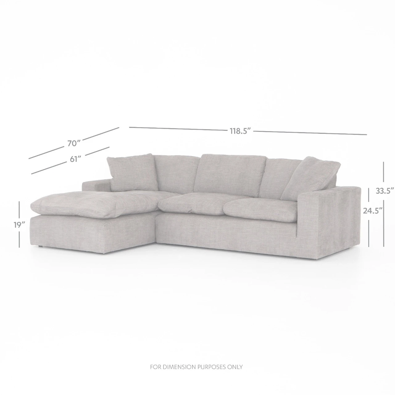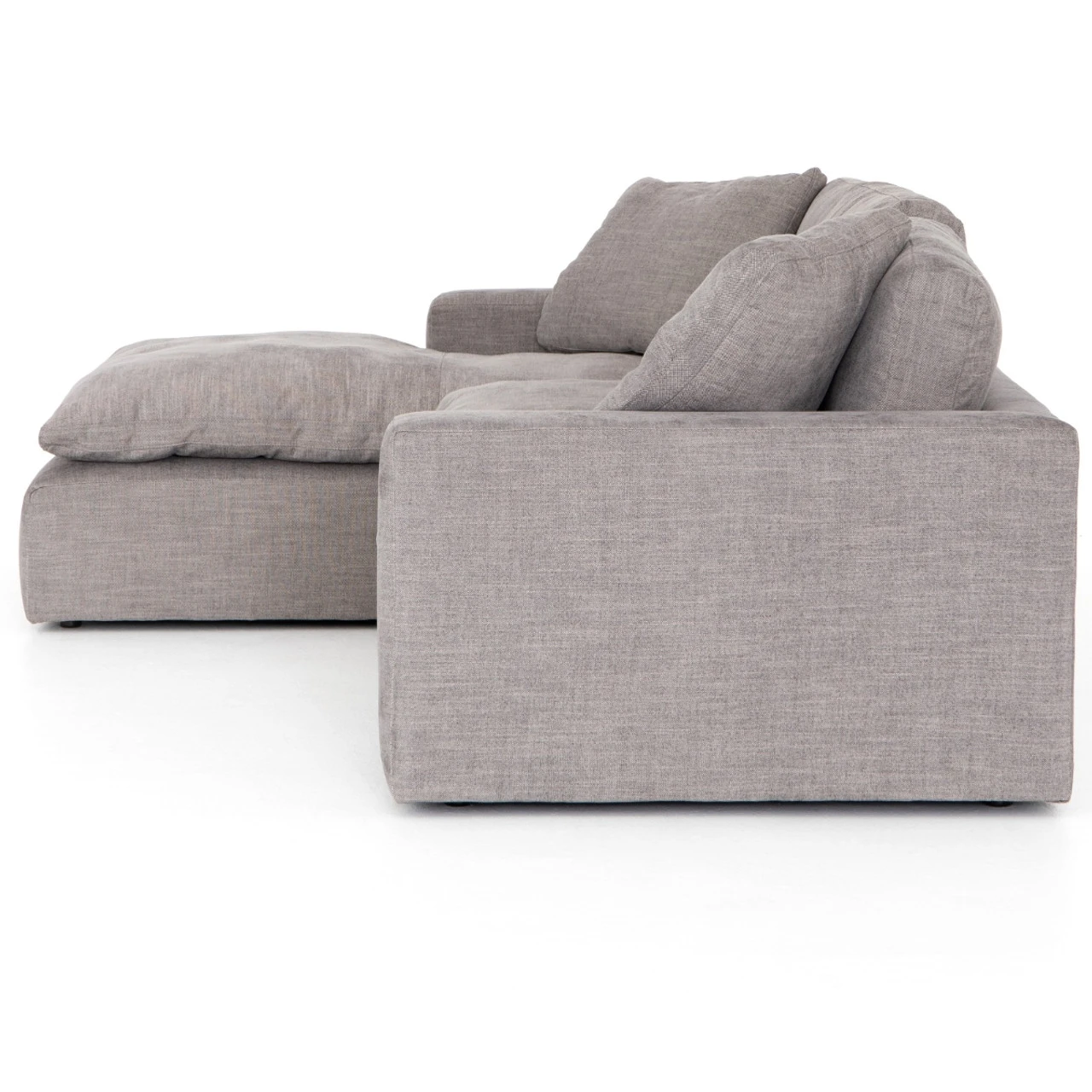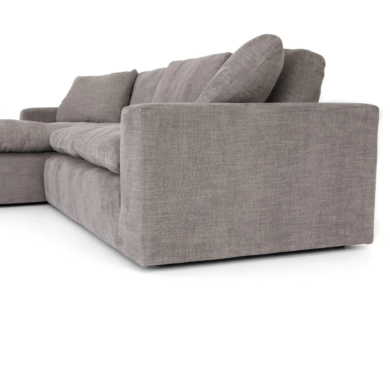 Simple elegance, modern design and luxurious comfort defines our Plume Upholstered Block Arm Pewter Grey Large Sectional Sofa. Sink-in luxury, squared. Block arms hold invitingly ample feather-and-down cushioning. Left arm facing chaise to two-piece sectional, stylishly oversized for cool lounging comfort.