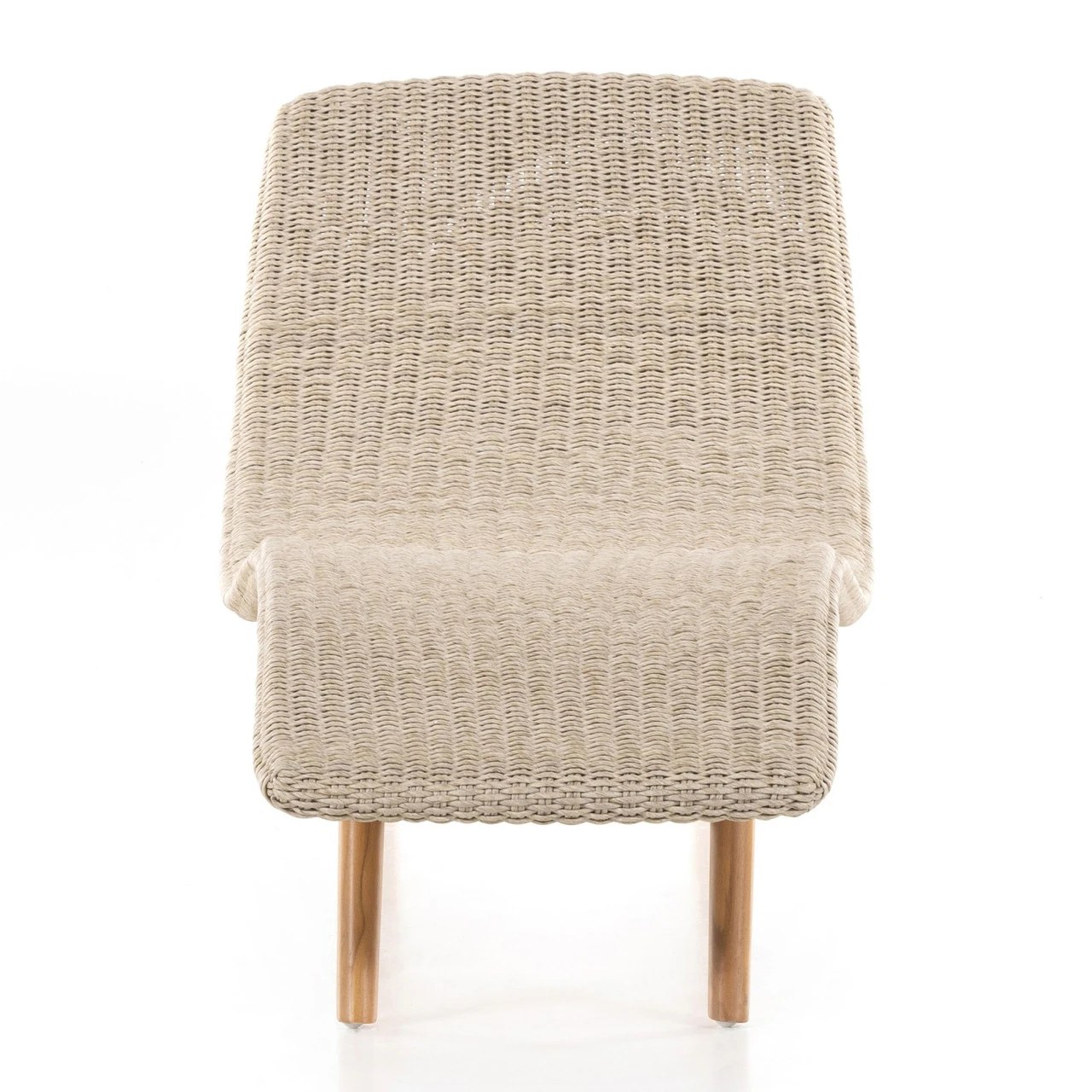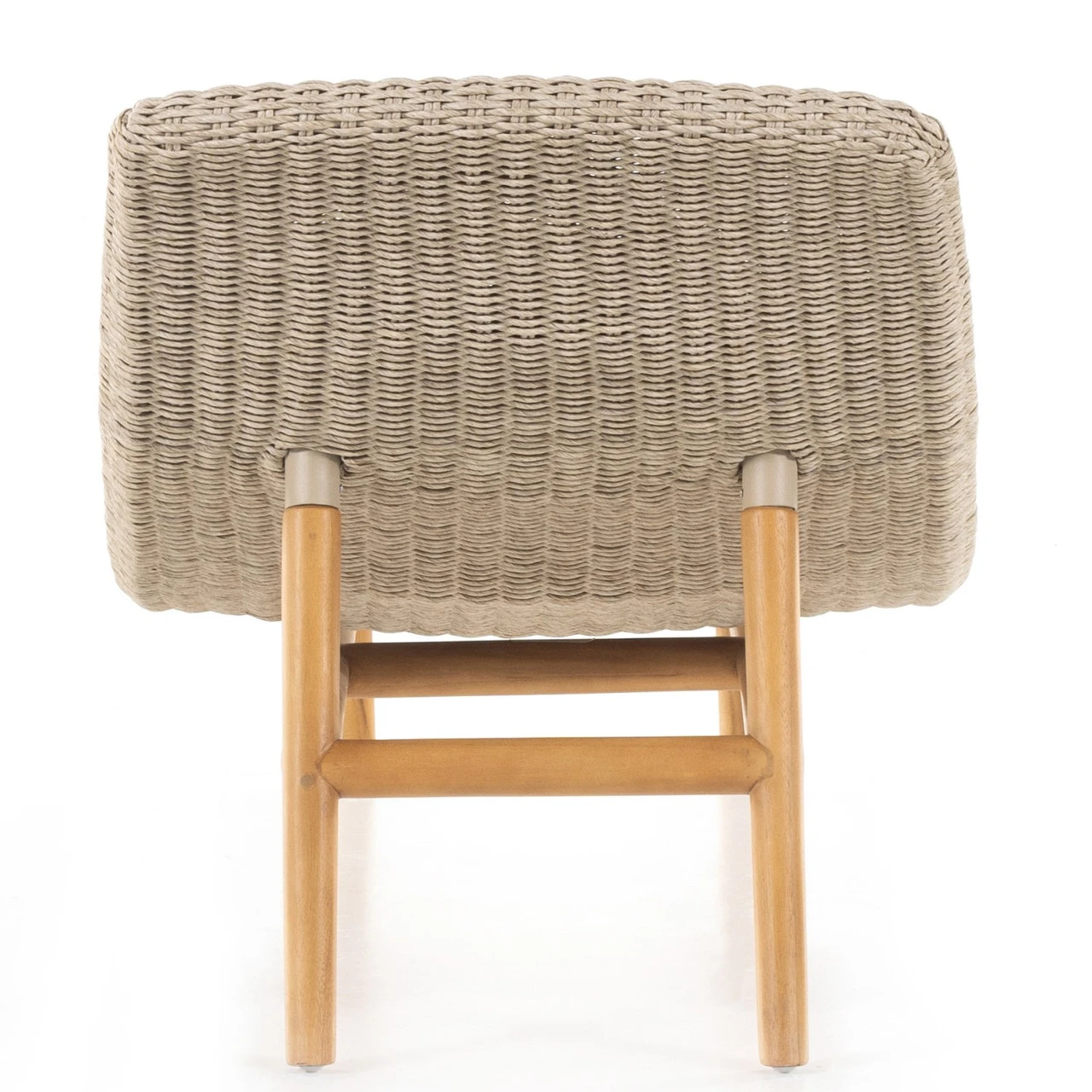 Strike a pose. Based off a vintage shape, all-weather wicker is subtly curved and set atop a minimal frame made of solid teak. A stylish statement piece and seating option for both indoors and out. Cover or store inside during inclement weather and when not in use.