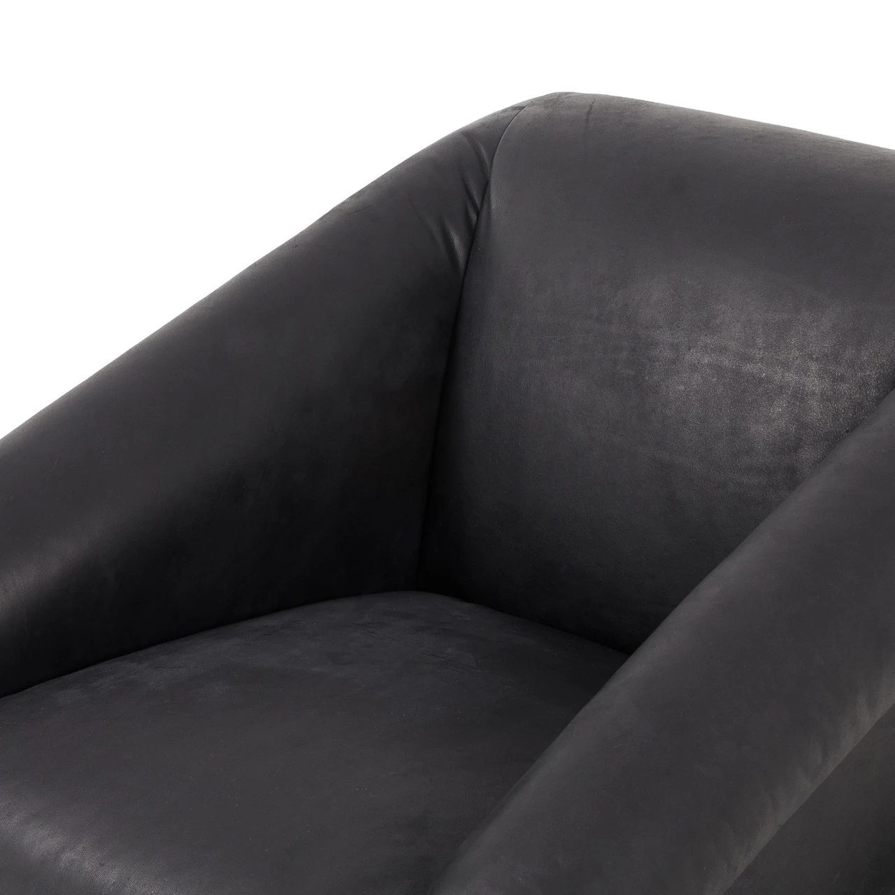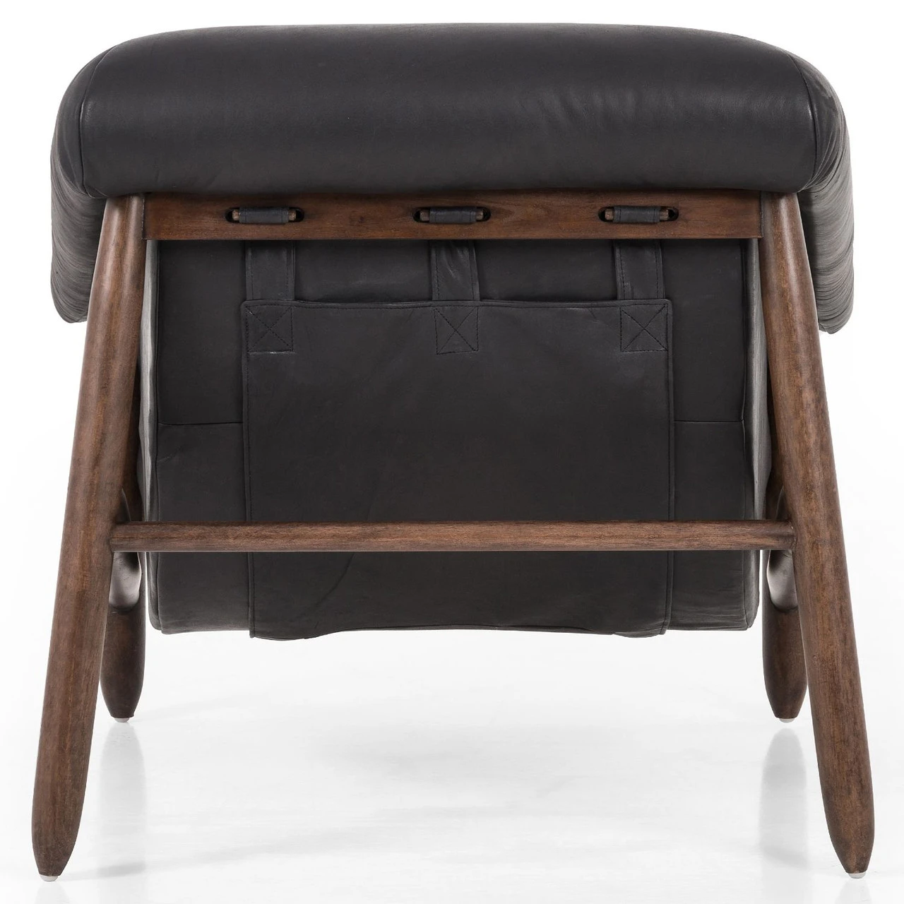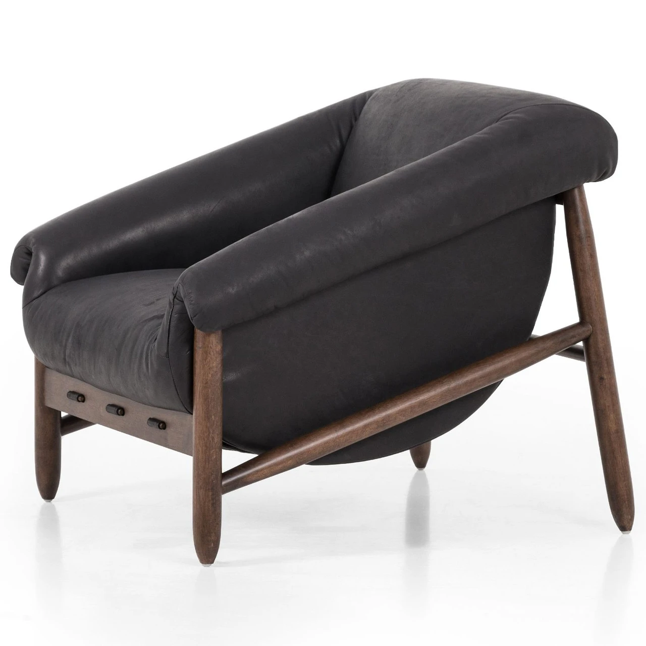 Oversized cushioning brings a Brazilian midcentury feel to this vintage-inspired chair. Designed with cushion-wrapped slanted arms, fixed cushioning with a deep sit and narrow legs reminiscent of midcentury style. Upholstered in heirloom leather. Sourced from one of the oldest family-owned tanneries in Italy’s Bassano del Grappa, heirloom leather is salvaged and processed from upcycled hides featuring an abundance of natural markings, scars and color variations. The result? Beautifully supple, buttery soft hides with an unmatched depth of color and richness, and an authentic lived-in look.
