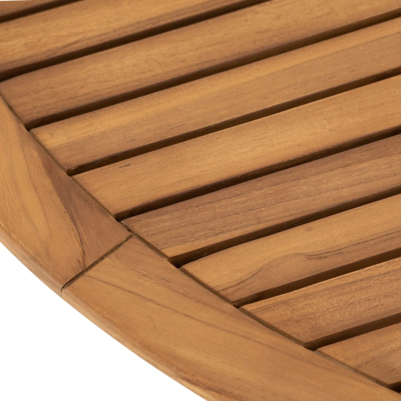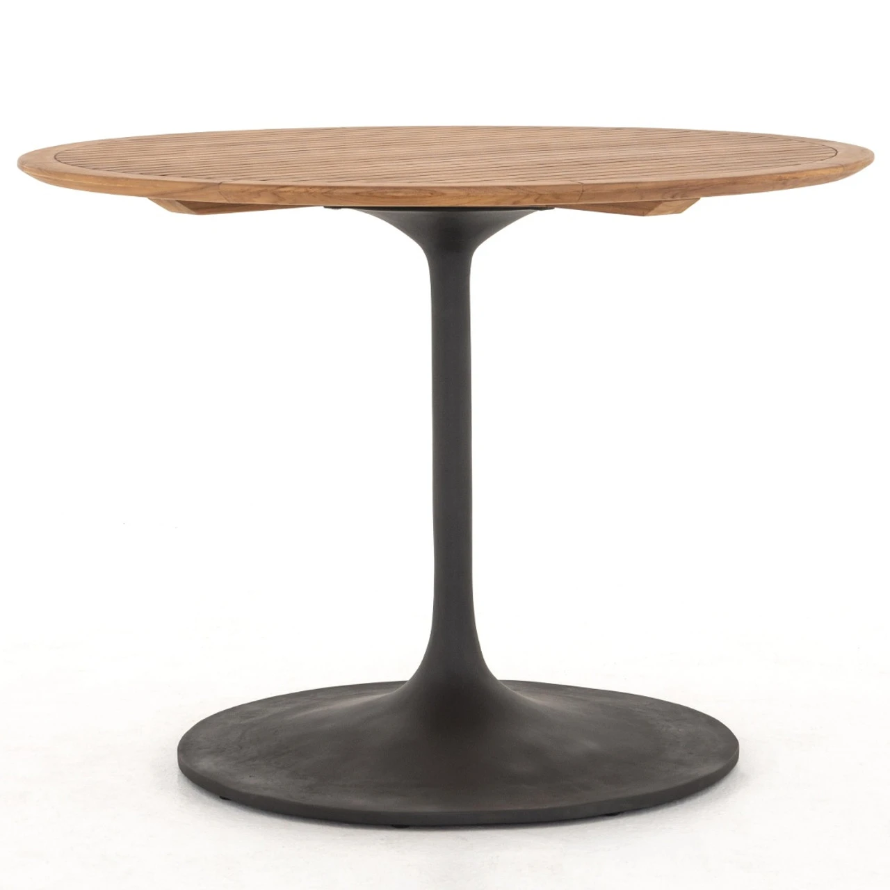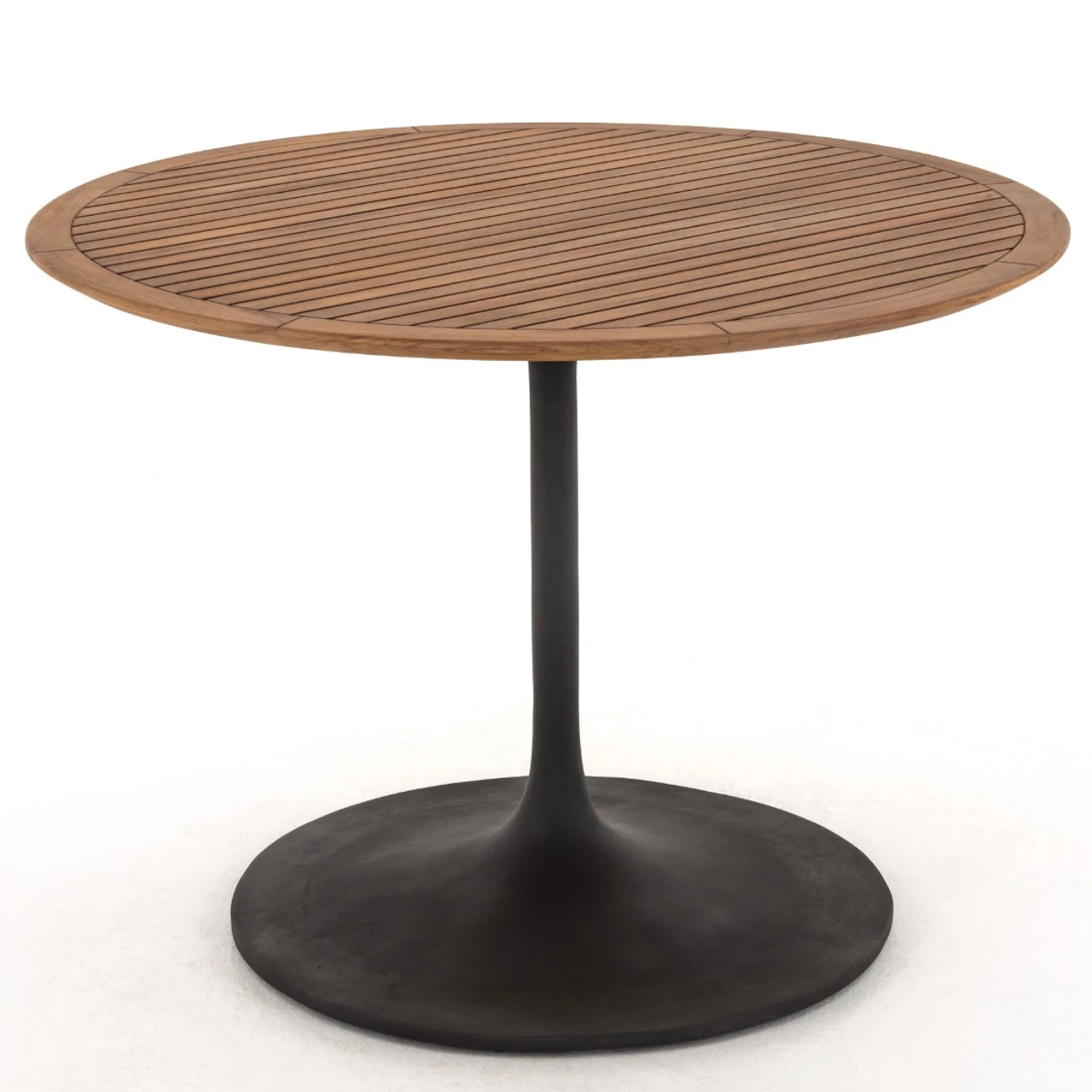 Classic shaping and modern materials spur a smart bistro-scale dining style. A tulip base of bronzed aluminum supports a rounded tabletop of natural teak, with inset slats. The teak wood isย FSCยฎ-certified. Your purchase of this product helps support forests and ecosystems worldwide.ย Cover or store indoors during inclement weather and when not in use.