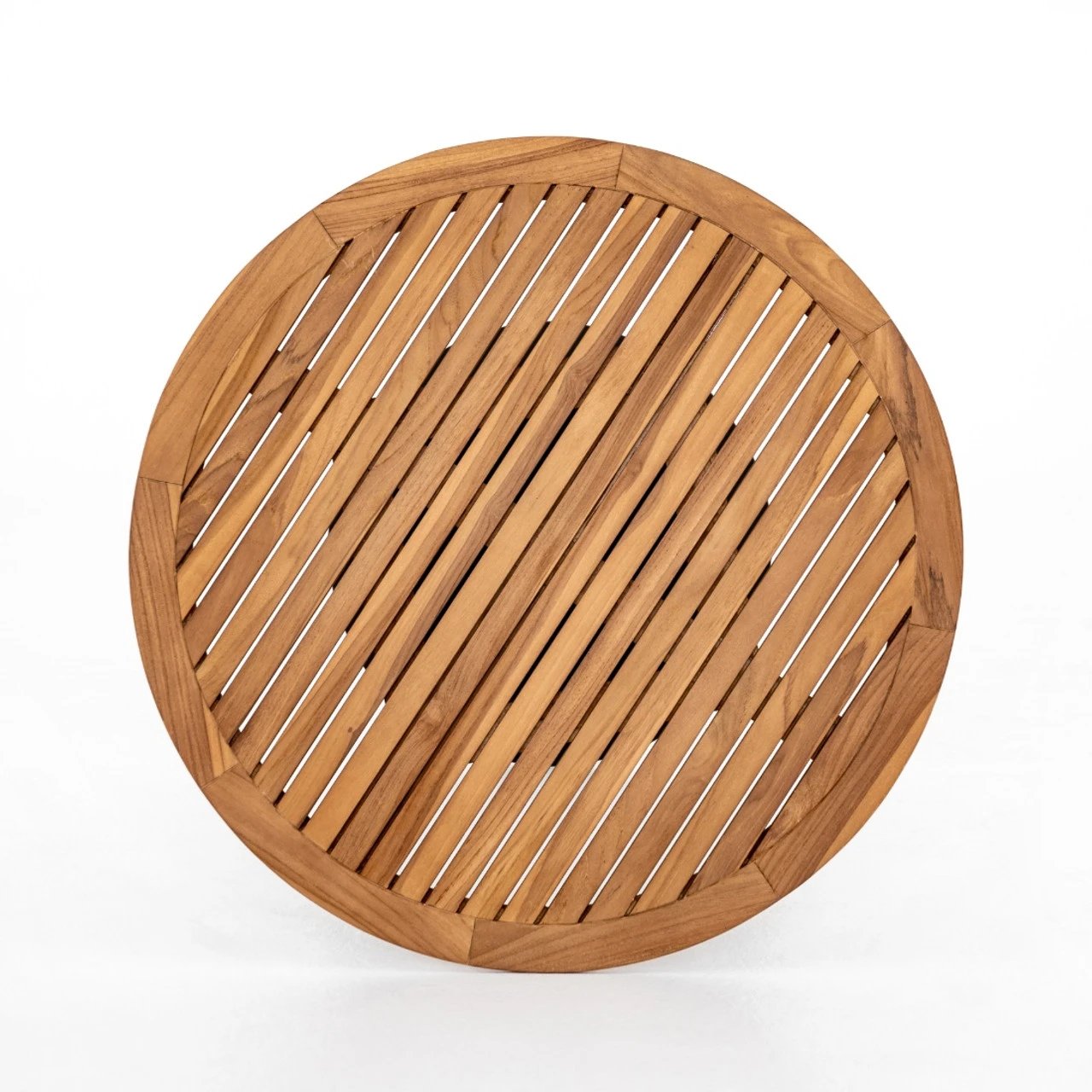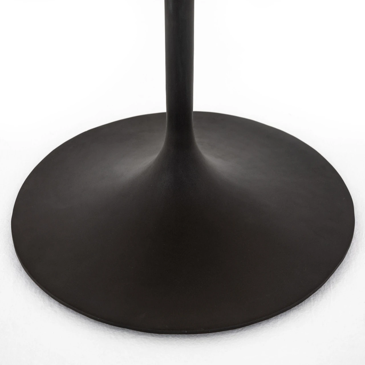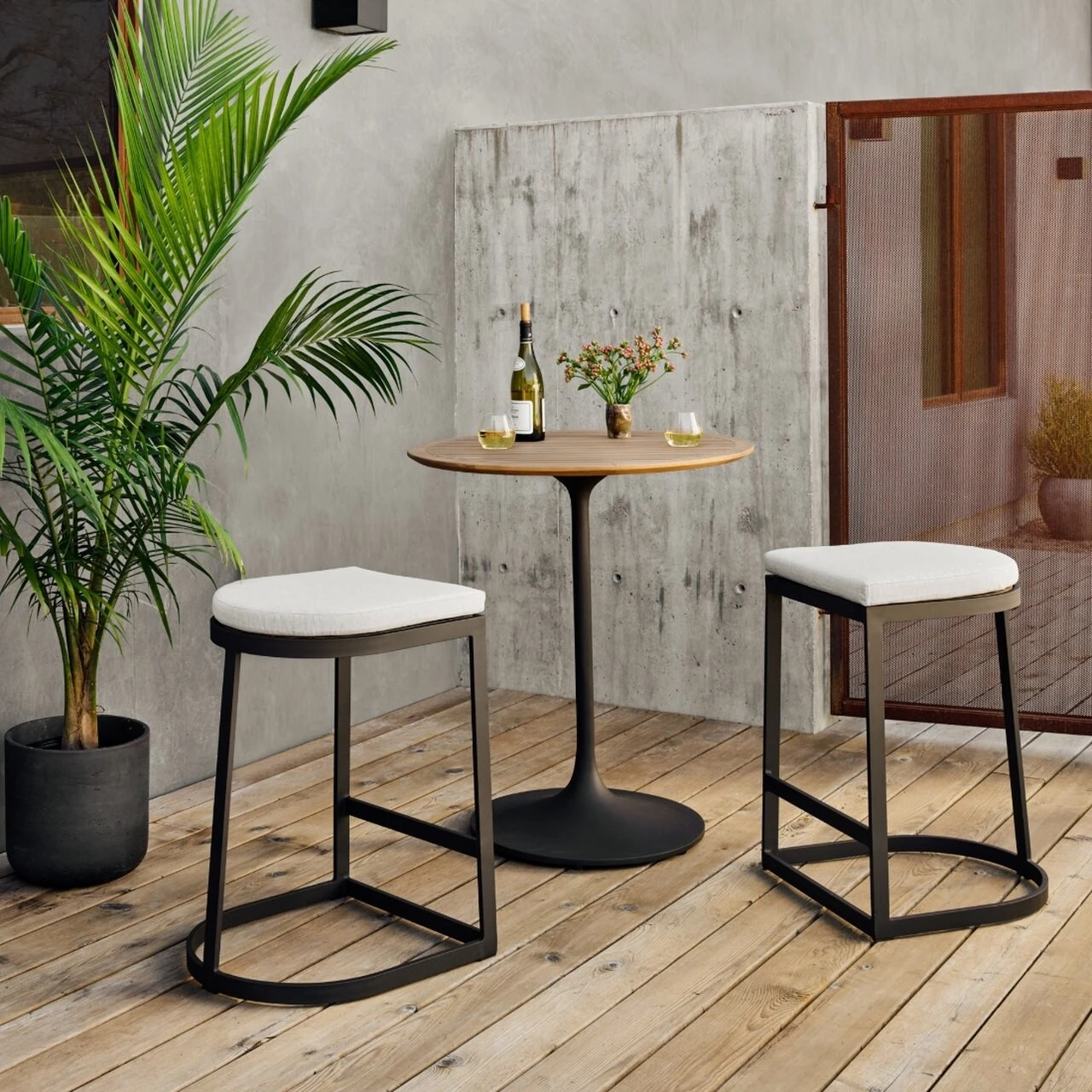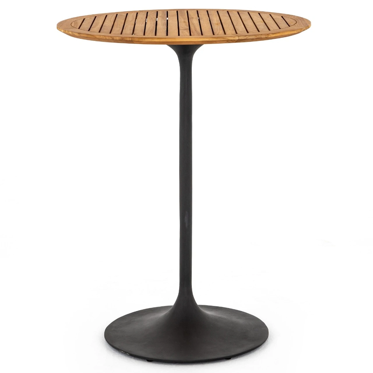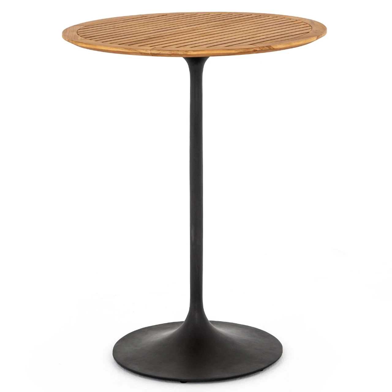 Classic shaping plus modern materials makes for a smart outdoor bar style. A tulip base of bronzed aluminum supports a rounded tabletop of natural teak, with inset slats. The teak wood is FSC®-certified. Your purchase of this product helps support forests and ecosystems worldwide. Cover or store indoors during inclement weather and when not in use.