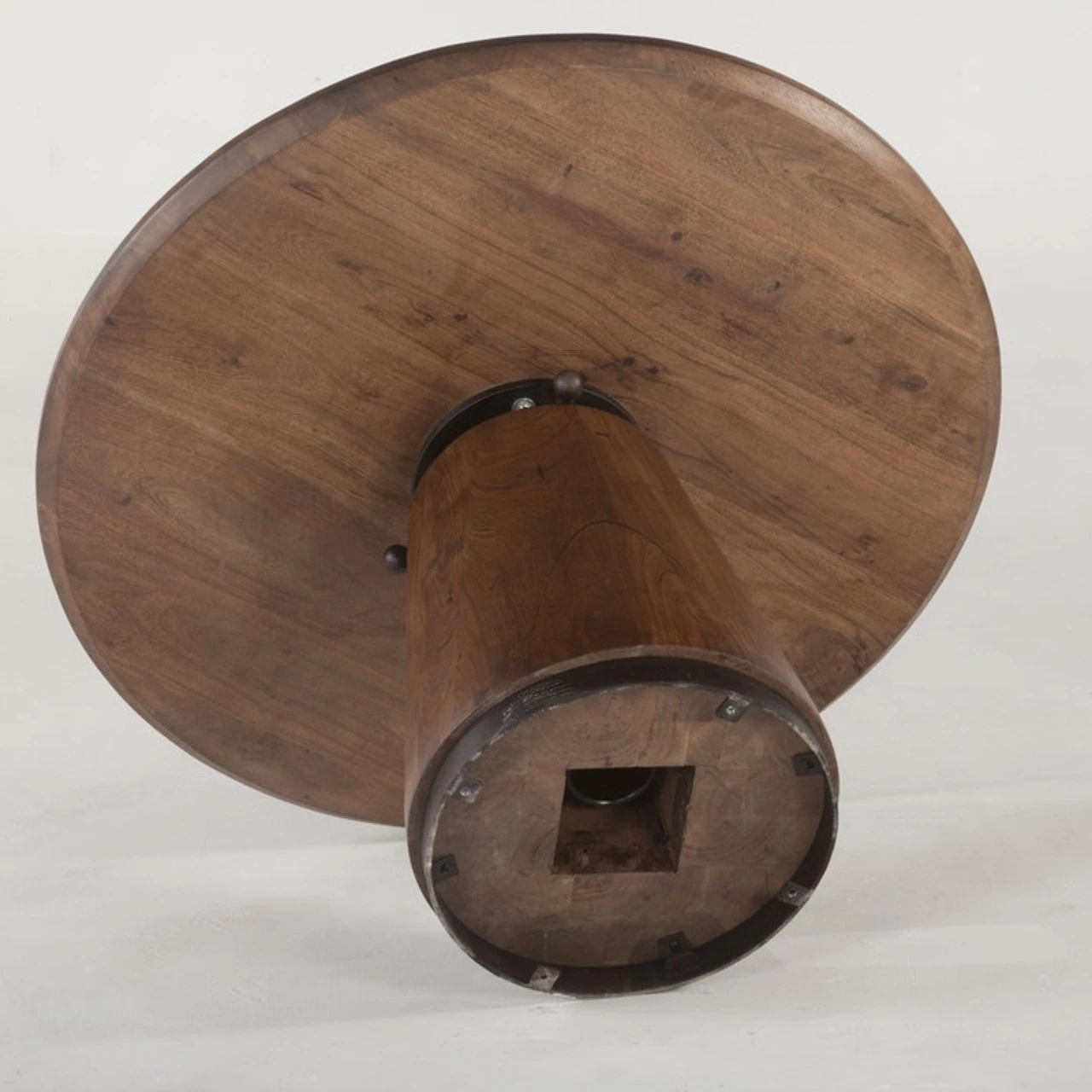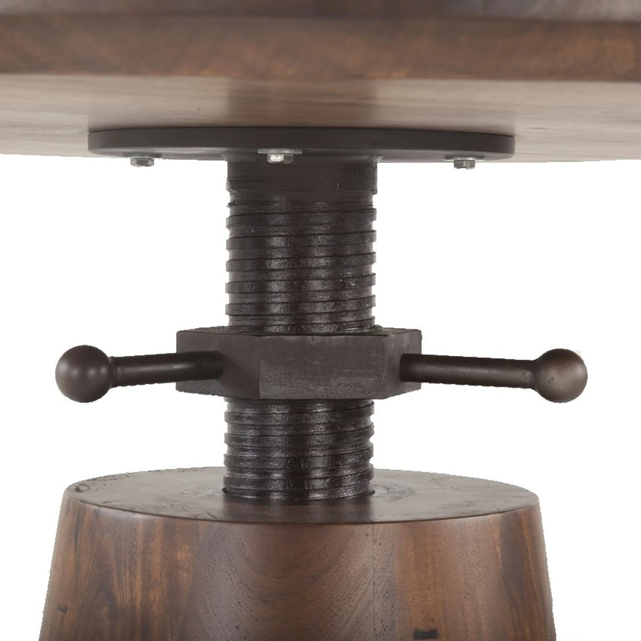 Rustic, Industrial and modern elements meet in our Revolve Round Adjustable Height Dining Table. Crafted of Solid Acacia wood and Reclaimed Cast Iron in a deep dark walnut finish, Our Revolve Round Adjustable Height Dining Tables puts a new spin on versatility, adjusting in height with a few turns to accommodate dining chairs, counter stools and bar stools.. The height easily adjust from dining table height of 30″to 42″ bar height with just a few cranks. Â