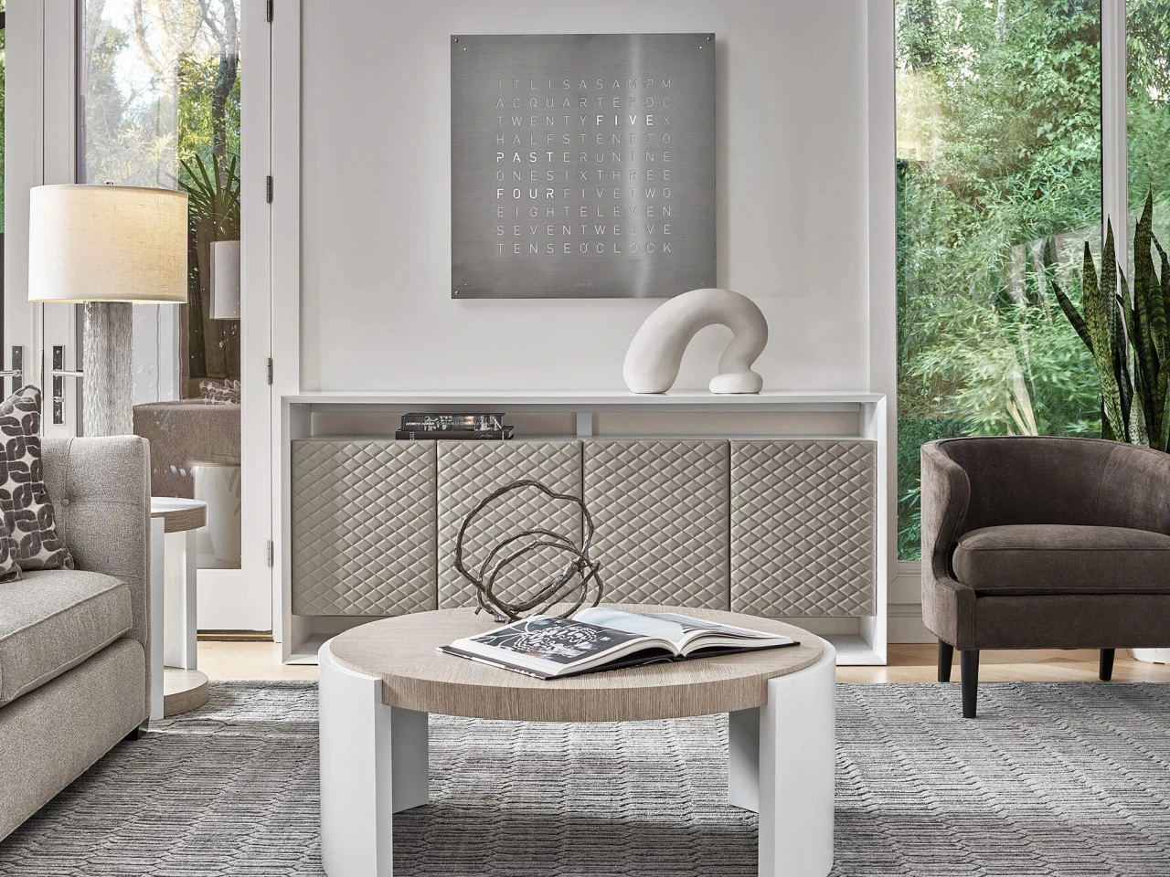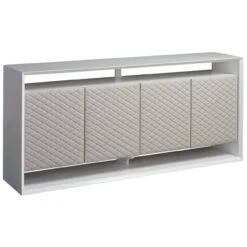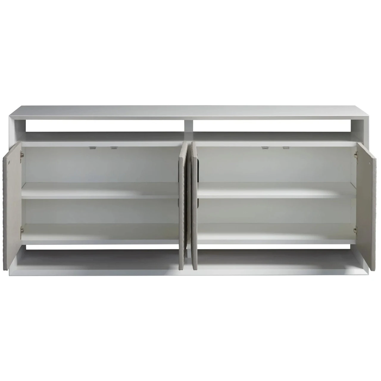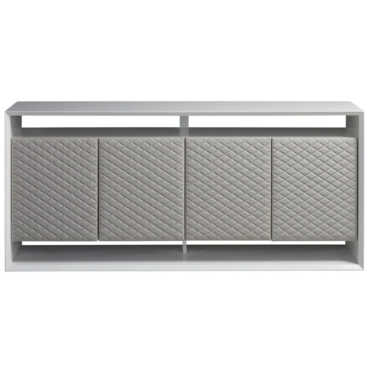 Enrich and invigorate living areas with the Reynolds Entertainment Console, a showstopping statement piece with four doors in a patterned faux leather, encased in an airy, white body.