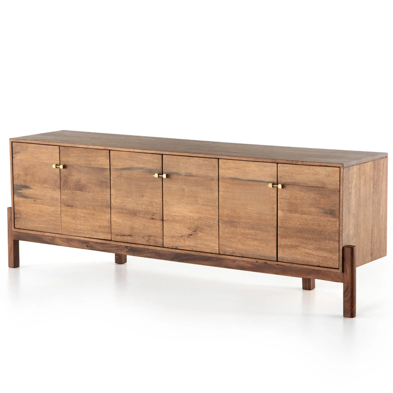 Mid-century styling with a Shaker spirit. Finished in a light, smoked honey, a clean-lined parawood console sits in an arched cradle base of toasted acacia, for fresh contrast. Twist-lock metal hardware adds a clever finishing touch. Rear cutouts for media cord management.