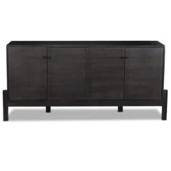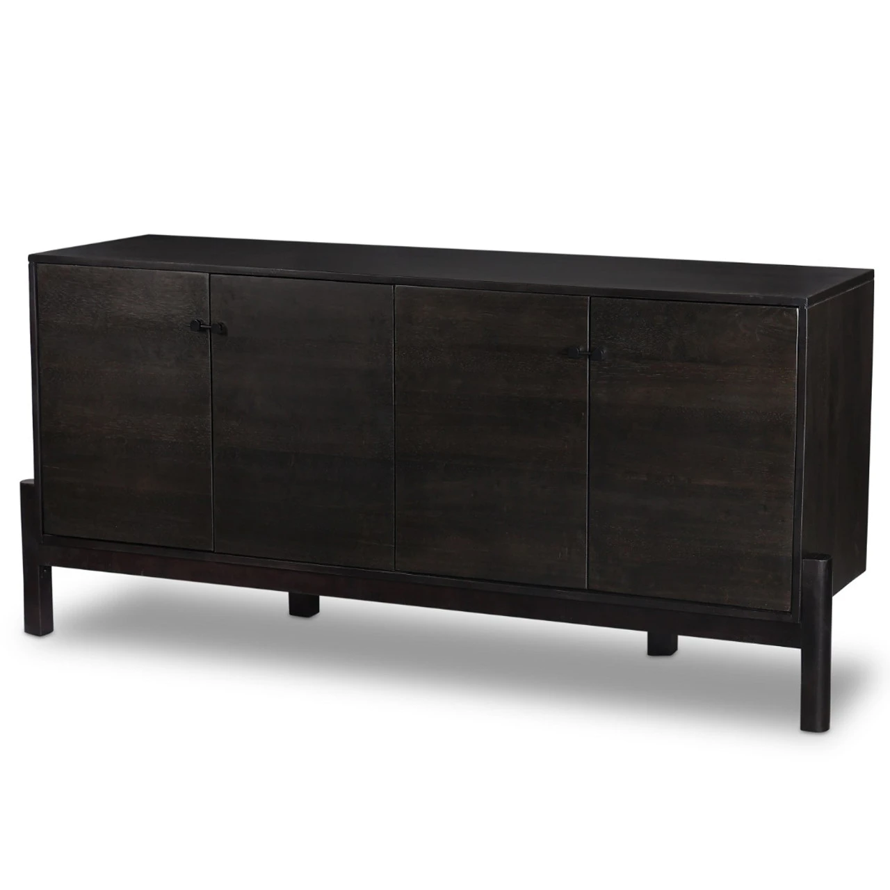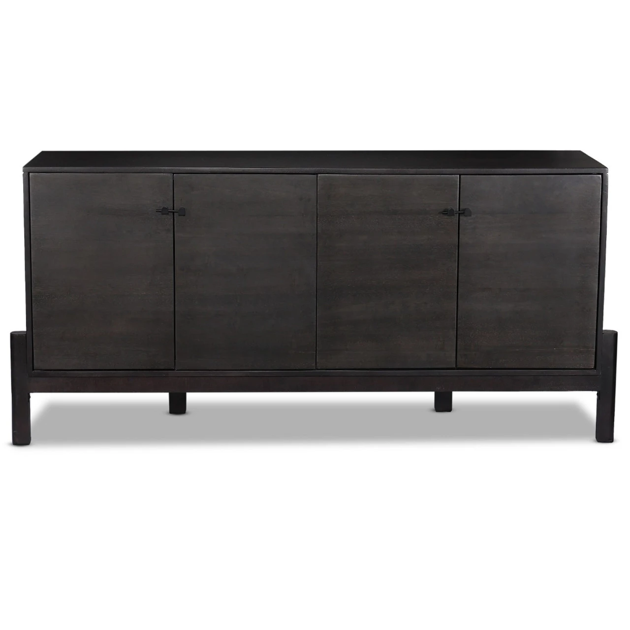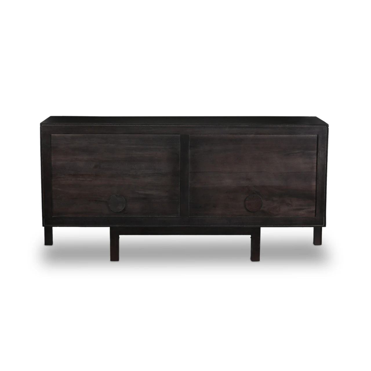 Midcentury with a Shaker spirit. Finished in a subtle two-toned distressed black, a clean-lined parawood console sits in an arched cradle base of matte black acacia. Twist-lock metal hardware adds a clever finishing touch. Rear cutouts for cord management.