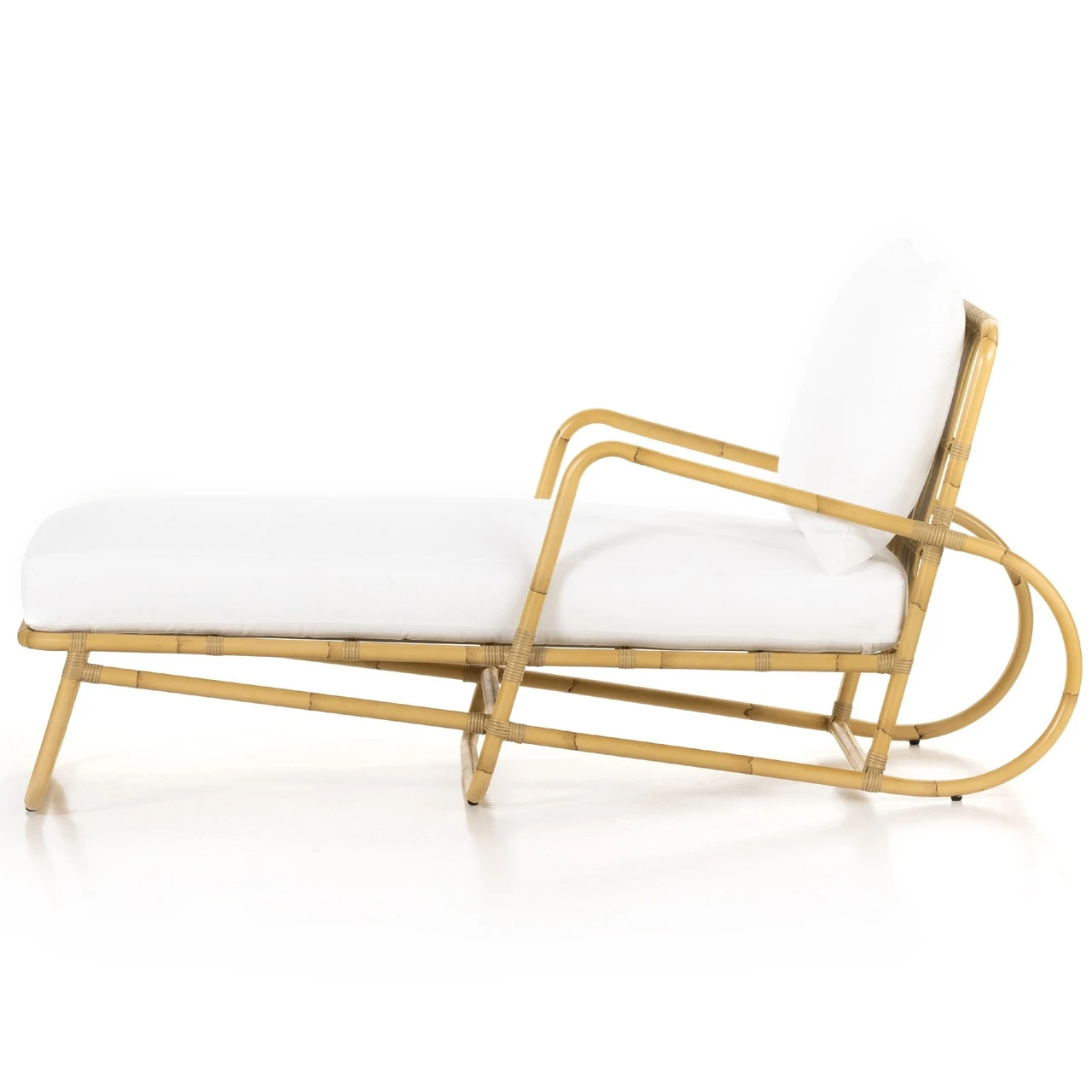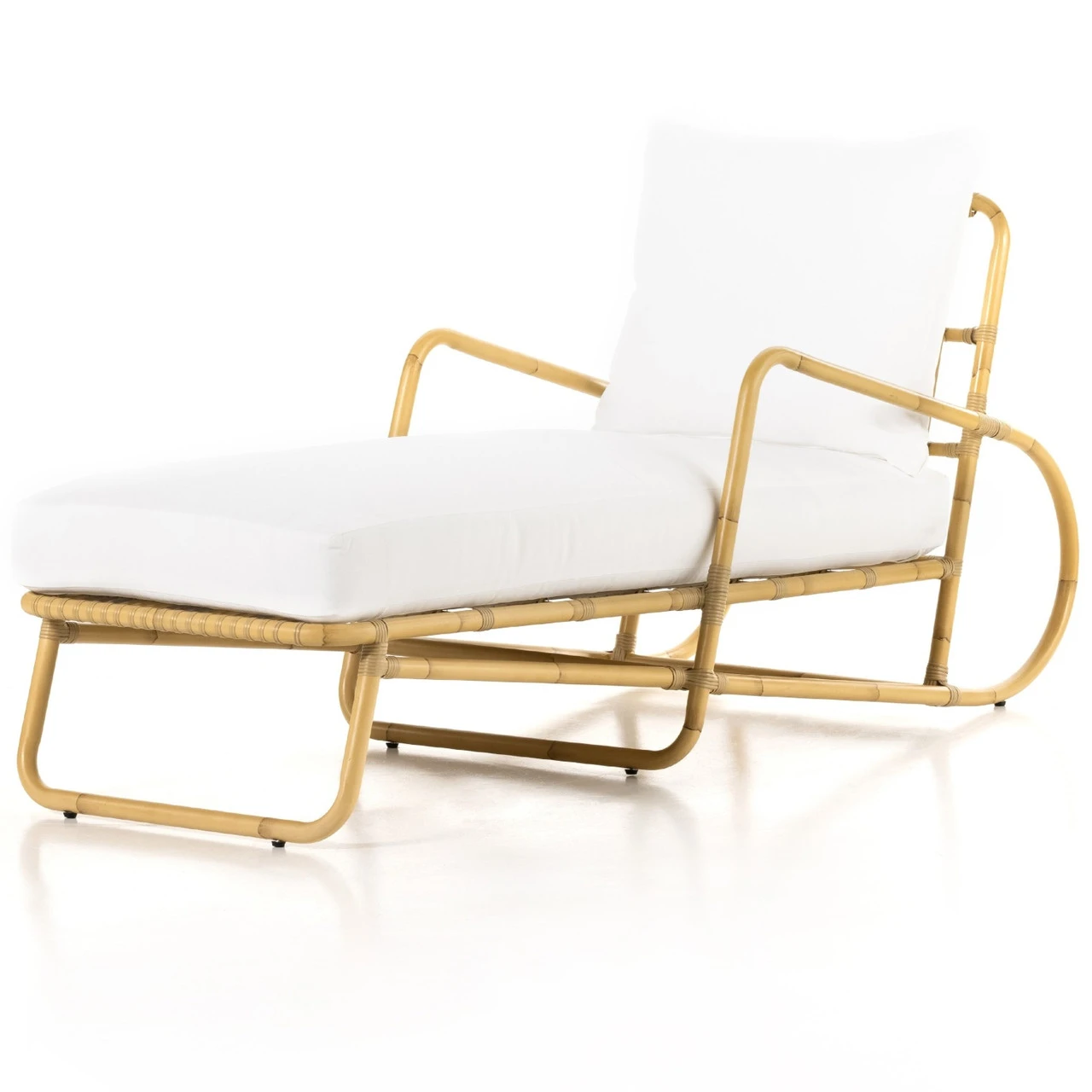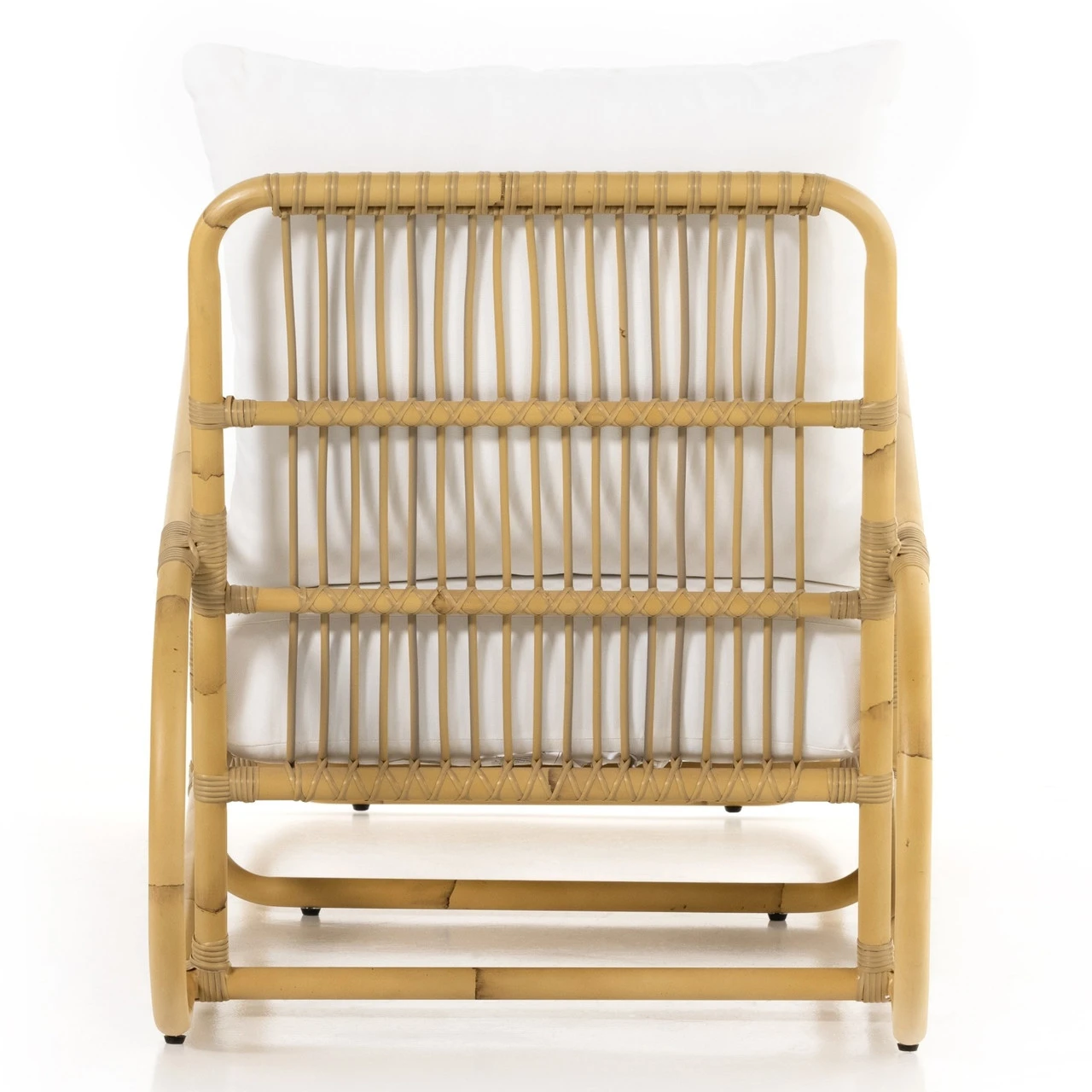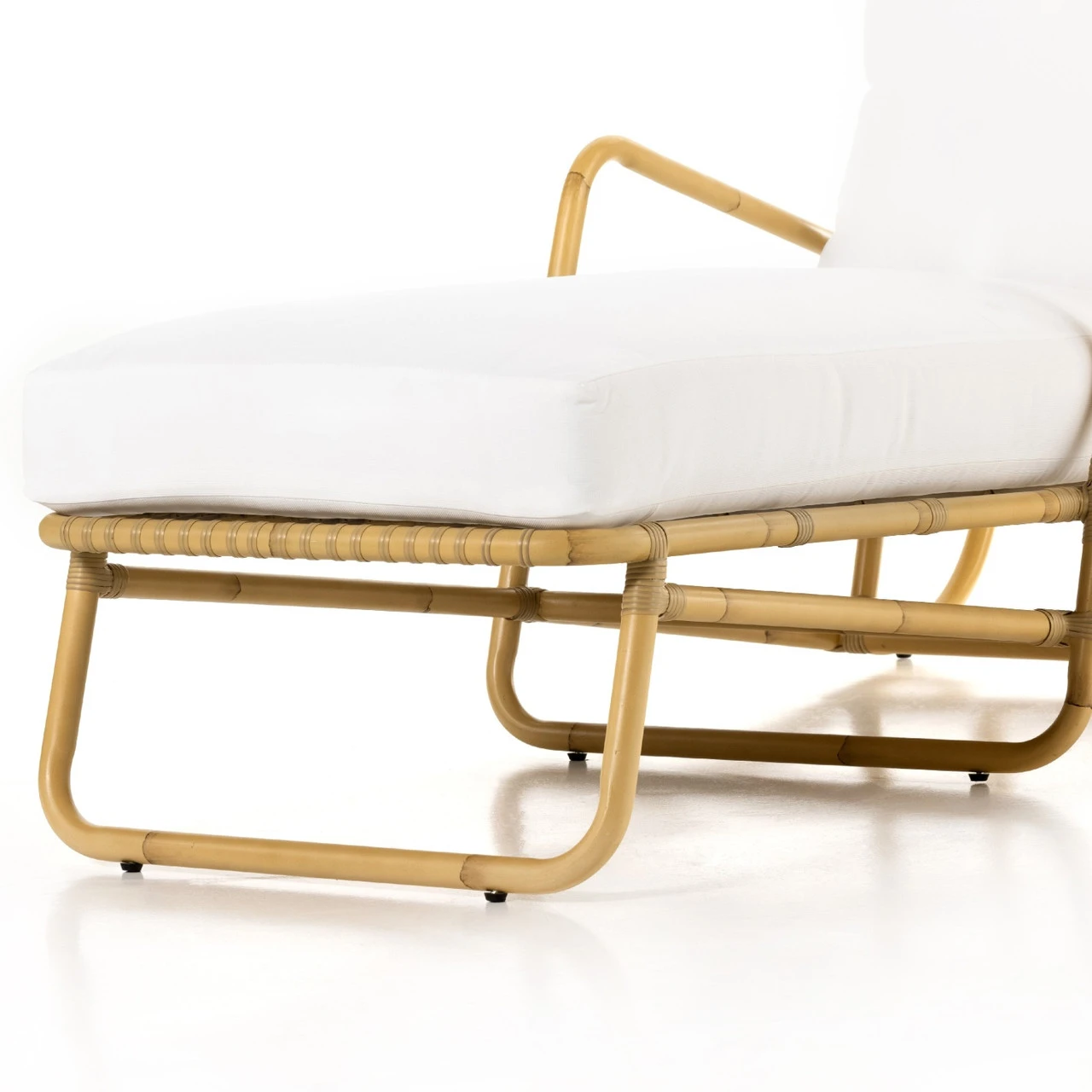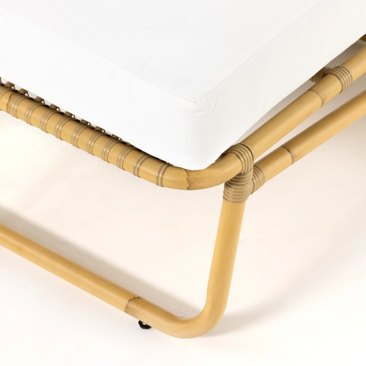 Texture on trend. Perfectly curved to reflect its 70s inspiration, aluminum framing is hand-painted with a rattan finish and features wicker-wrapped joints for an authentic touch. Durable, outdoor-friendly seat cushion for comfy al fresco lounging. Cover or store inside during inclement weather and when not in use.