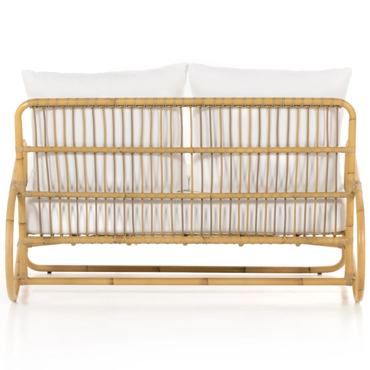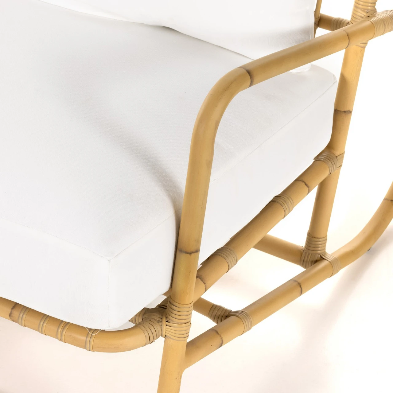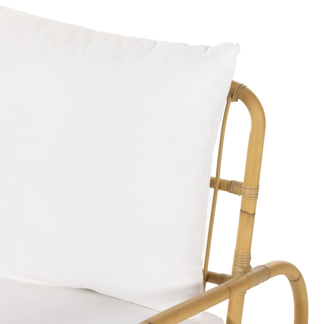 Texture on trend. Perfectly curved to reflect its Seventies inspiration, aluminum framing is hand-painted with a rattan finish and features wicker-wrapped joints for a fresh natural touch. Durable, outdoor-friendly seat cushion is covered in 100% Olefin, known for its UV-resistant, water-repellent and quick-drying abilities. Cover or store inside during inclement weather and when not in use.