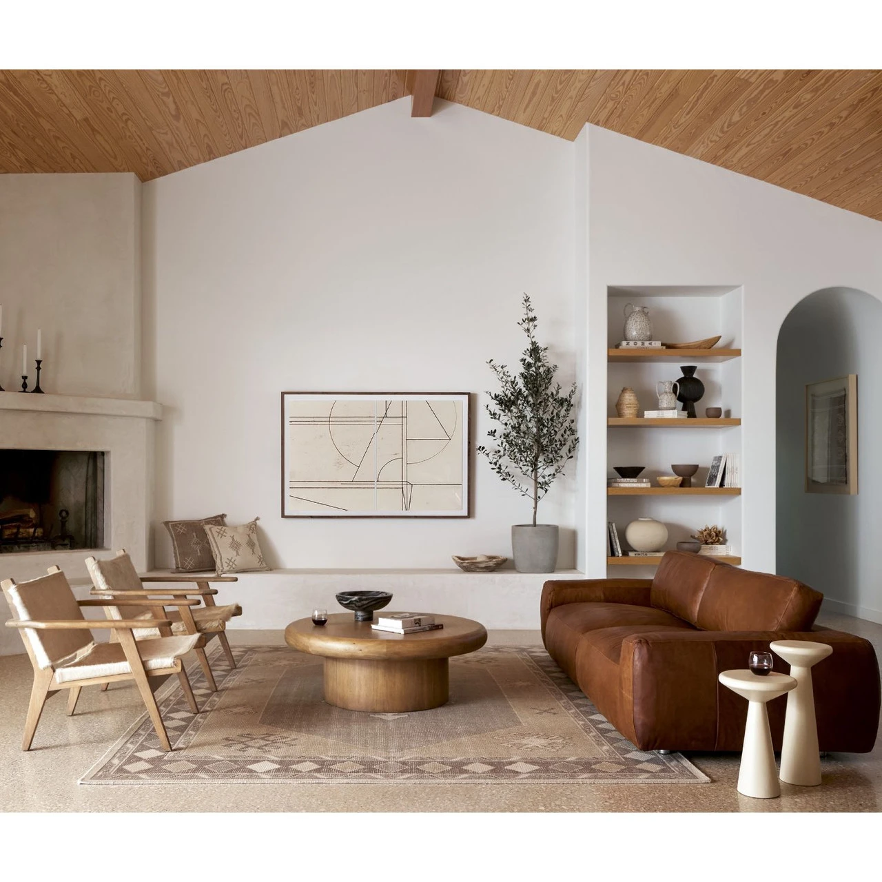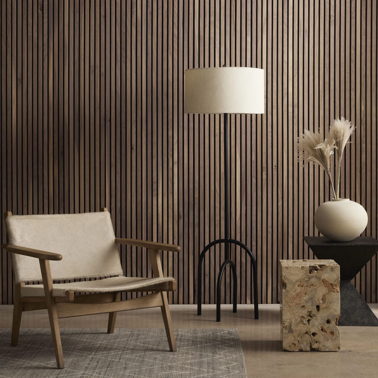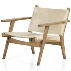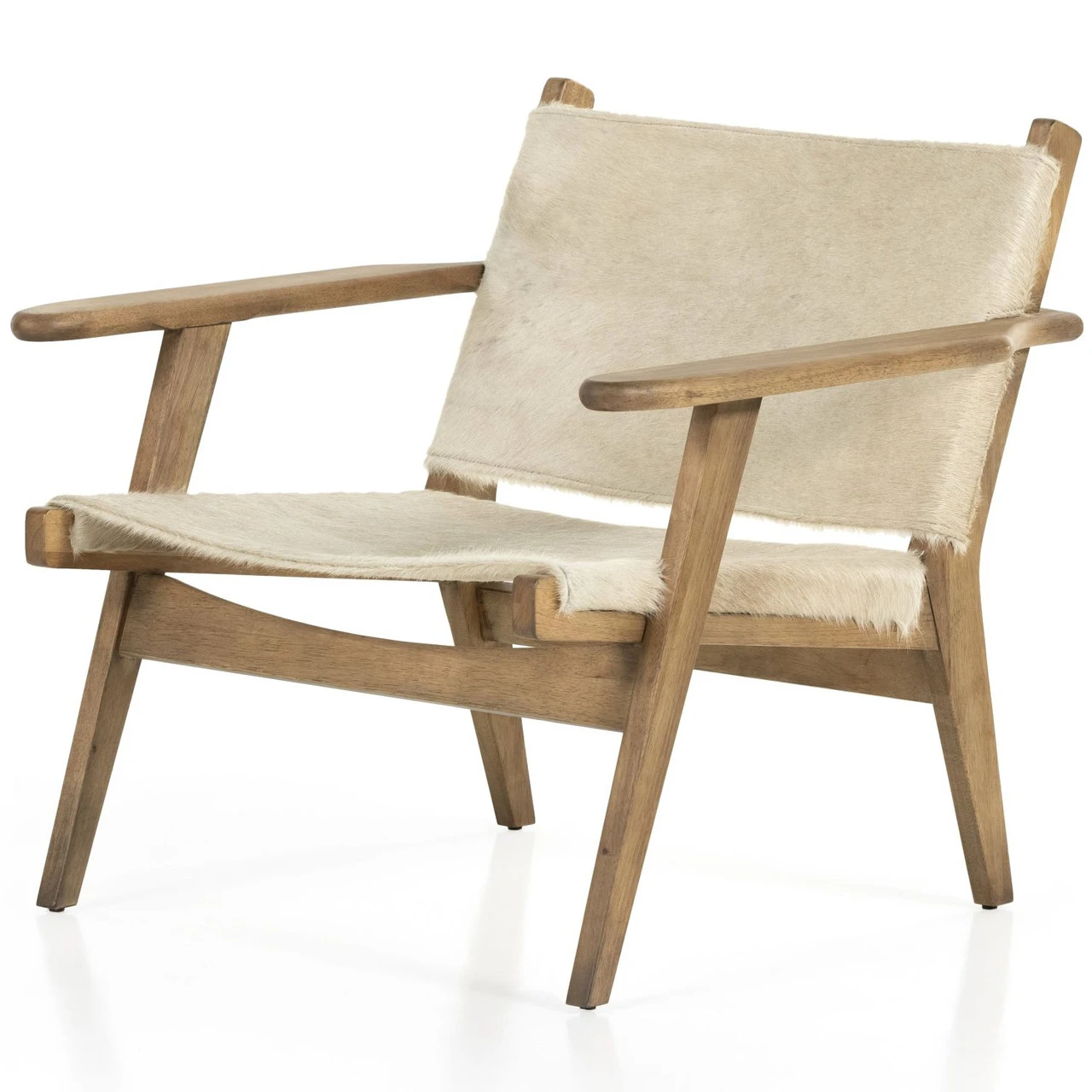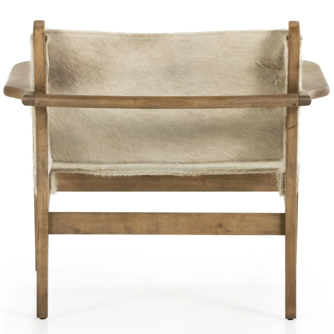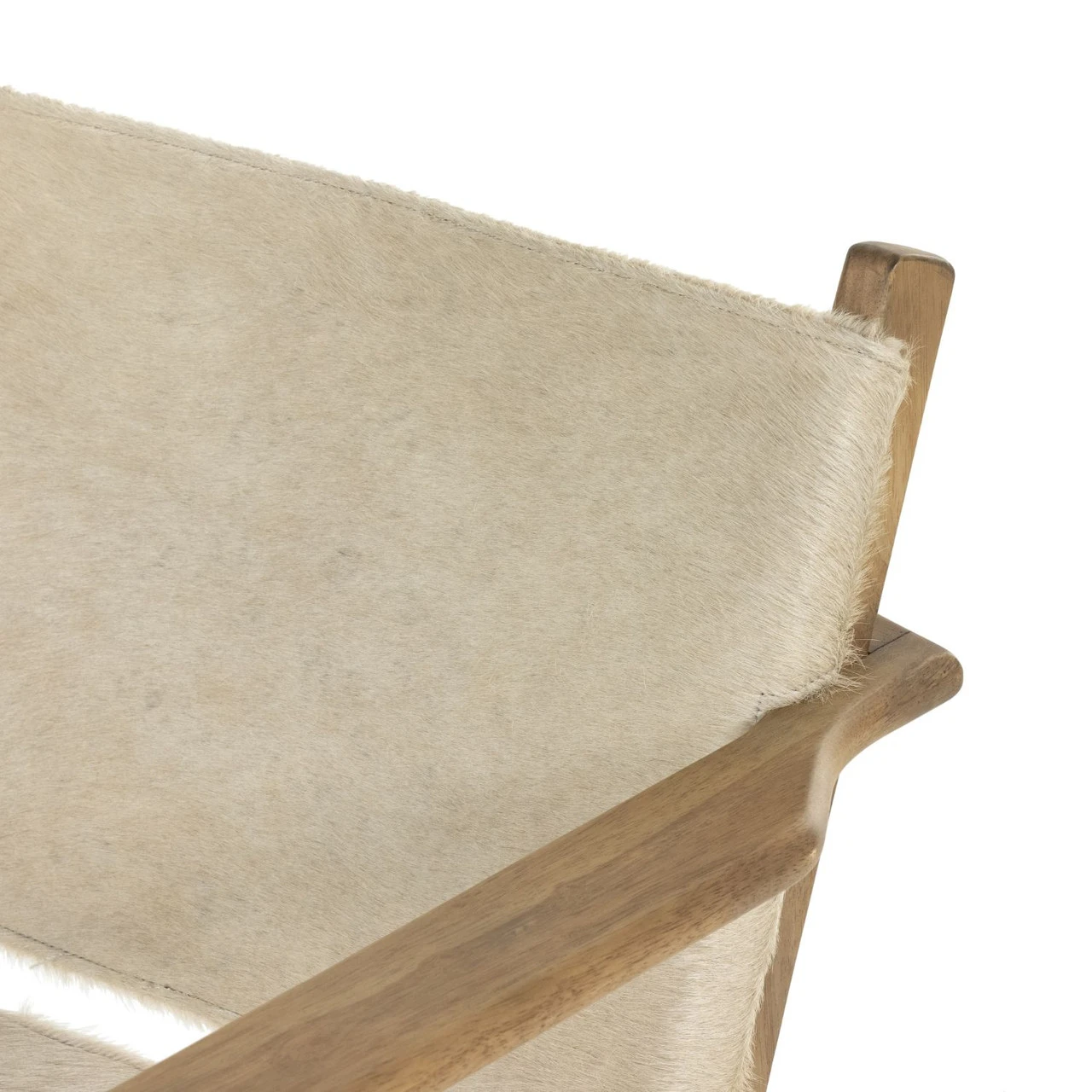 Vintage vibes, modernized. Sling seating shaped from a light buff hide is framed by solid oak for a clean, monochromatic look. A variance in coloring and pattern is to be expected, and speaks to hides’ one-of-a-kind nature.