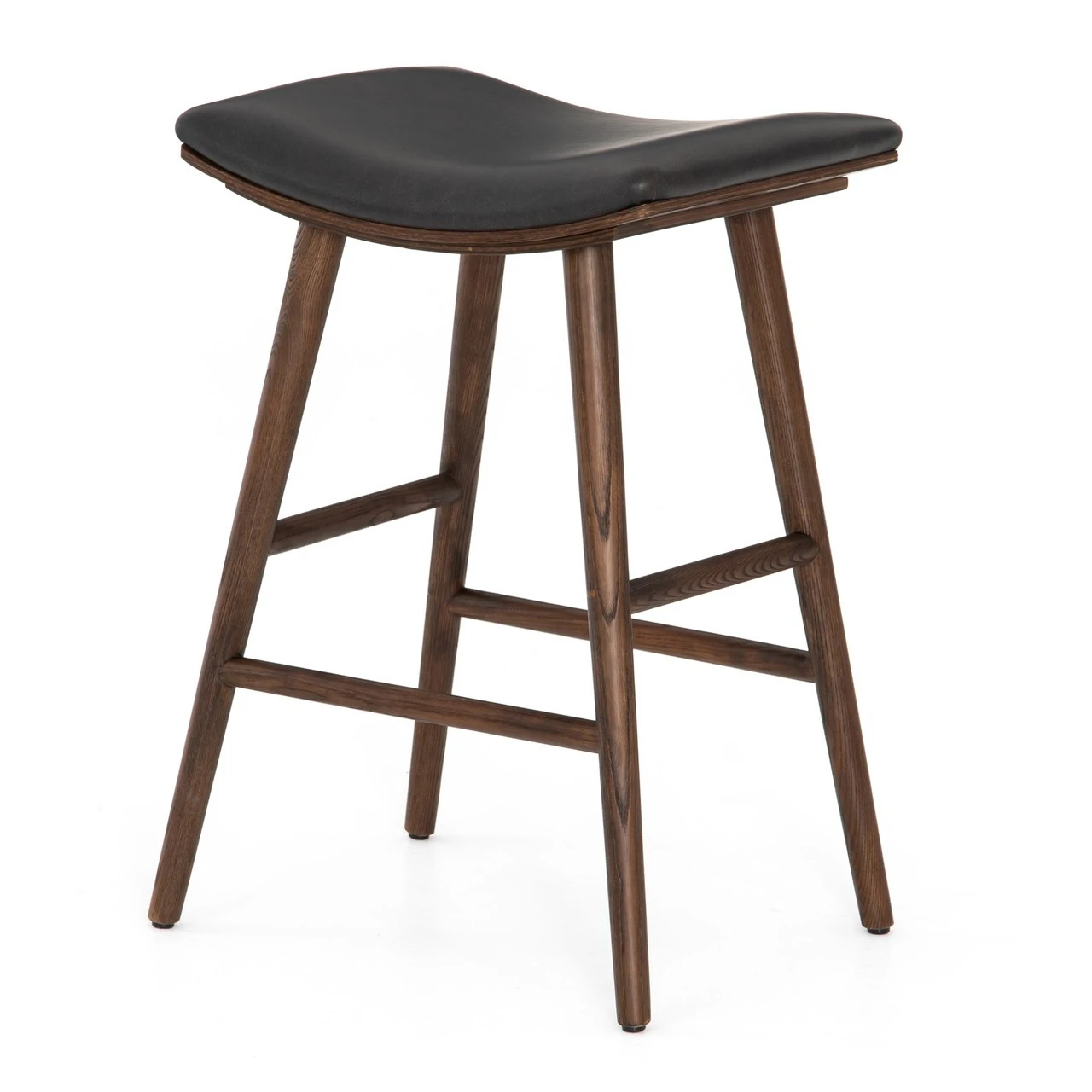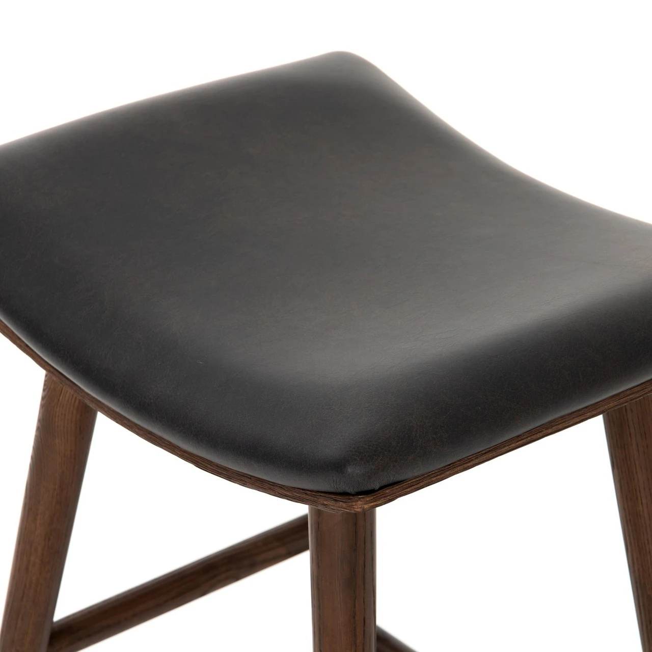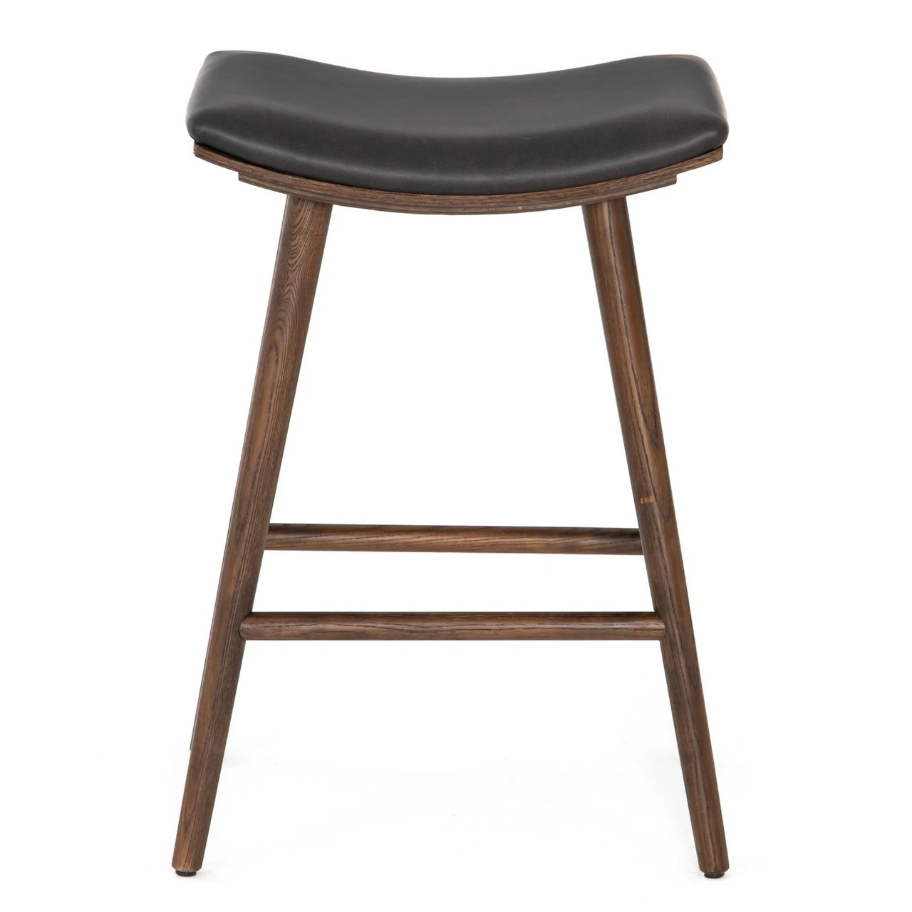 Slim styling meets color contrast for effortless impact. Light carbon-finished oak framing supports a saddle-style seat of natural-toned upholstery. Our Saddle Mid-Century Black Leather Counter Stools gives a fresh spin on any dining room or kitchen.