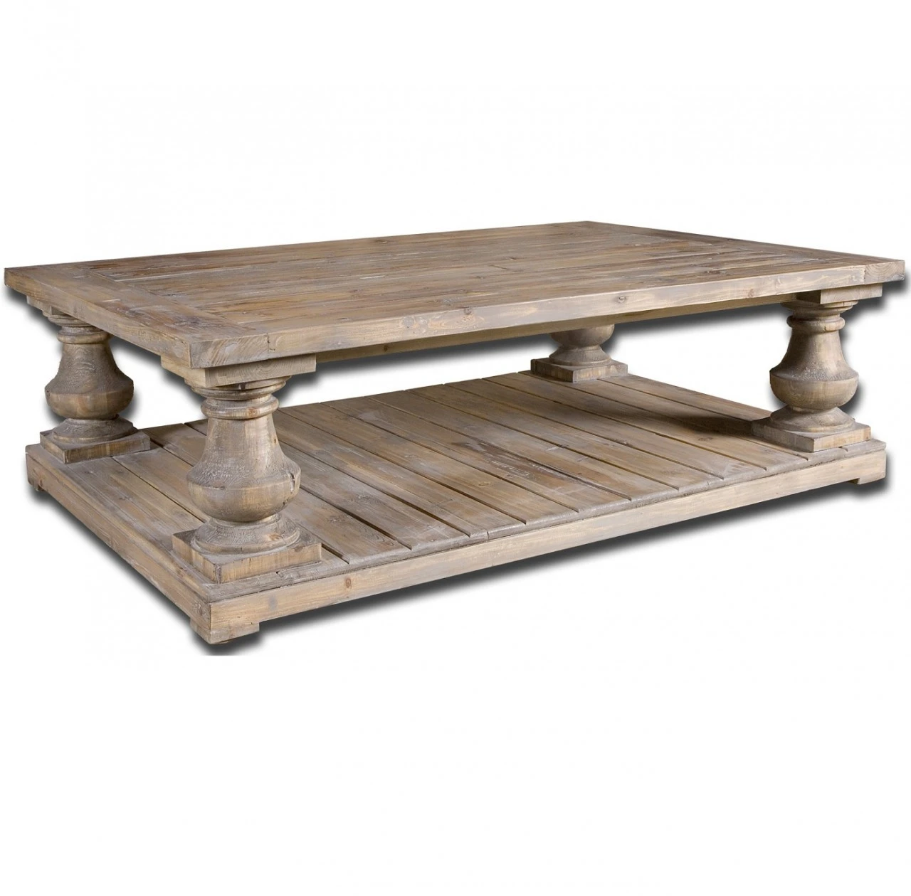 Rustic chic. Our reclaimed wood coffee table is solidly constructed of salvaged fir lumber and hand turned balusters. Sun faded, distressed patina is finished with a stony gray wash.Â