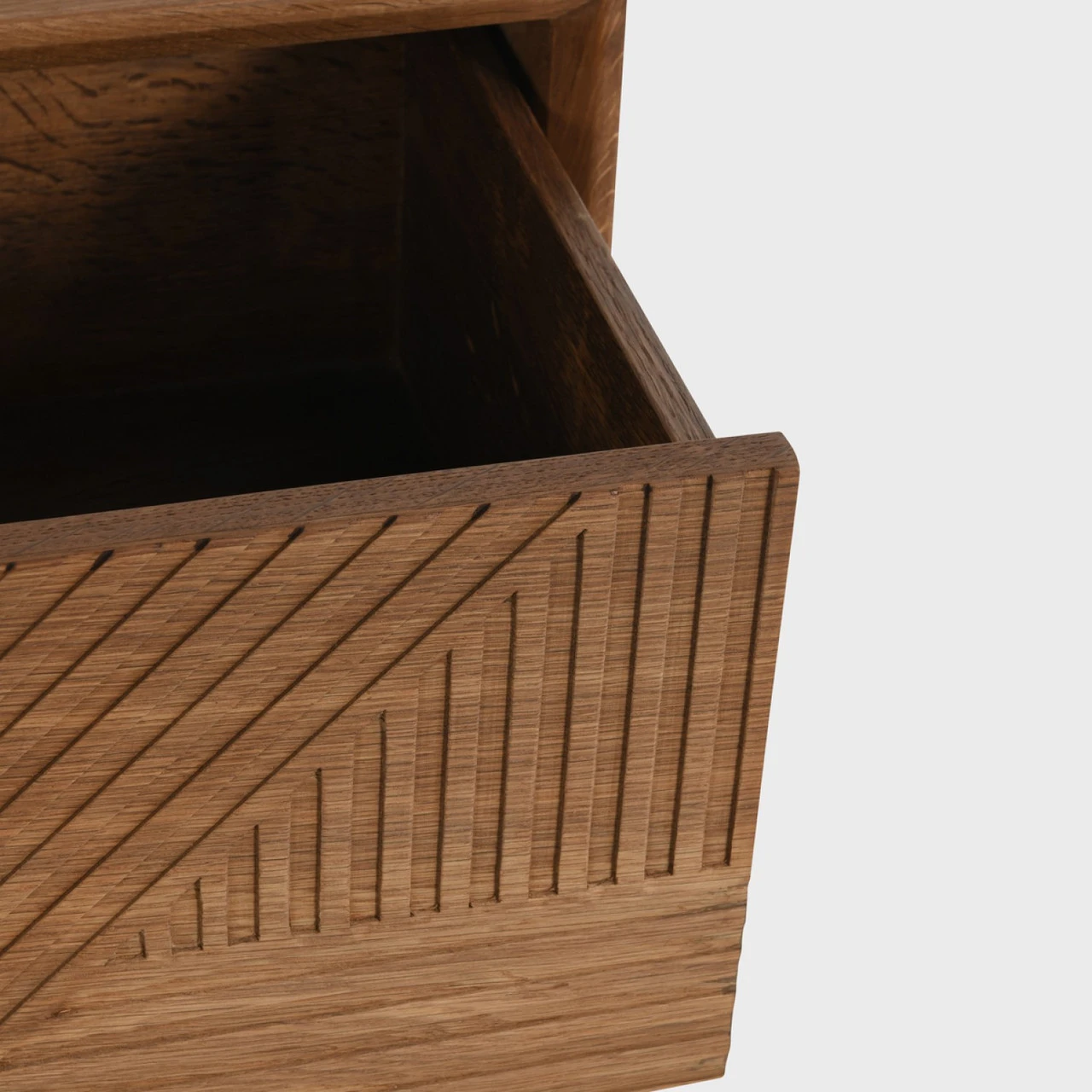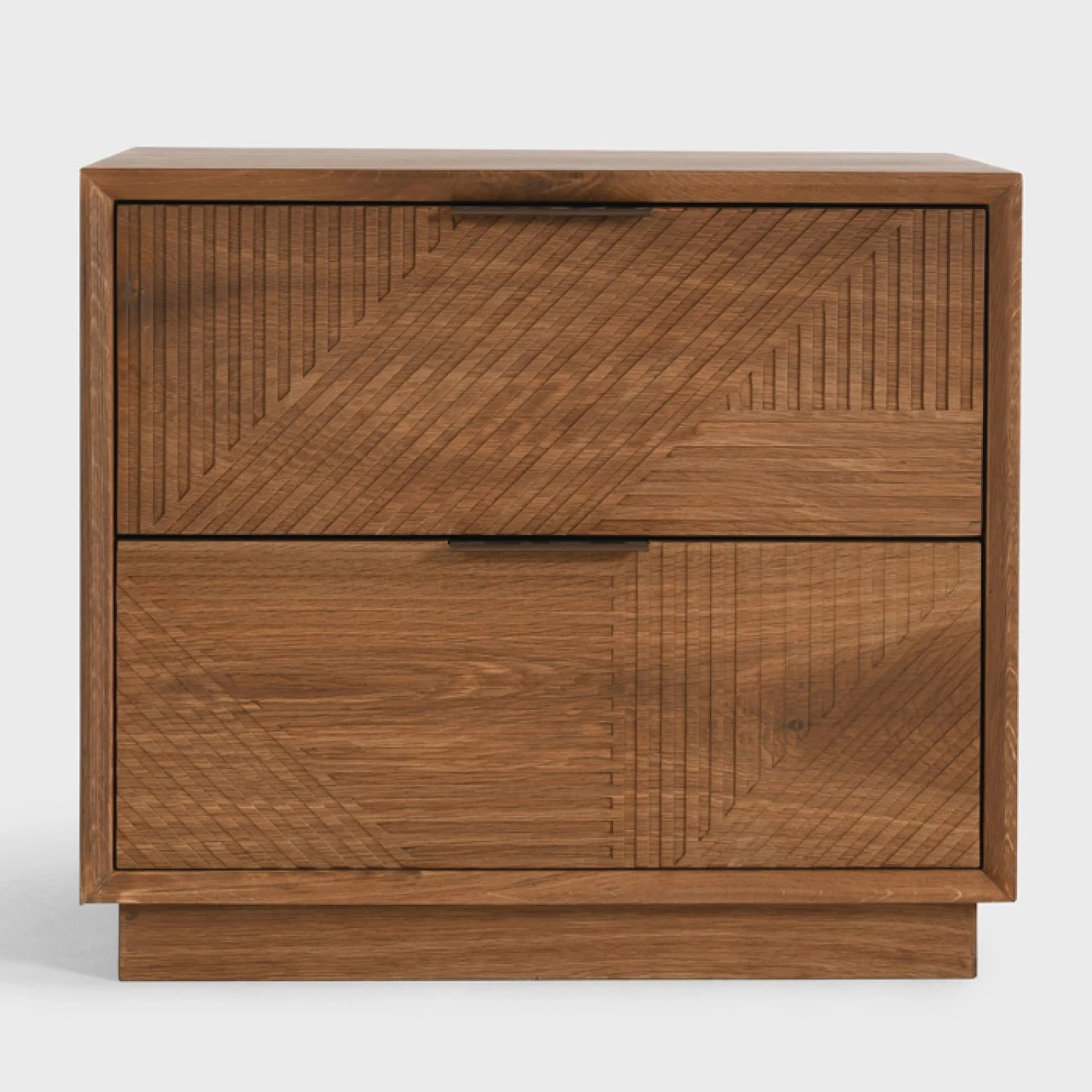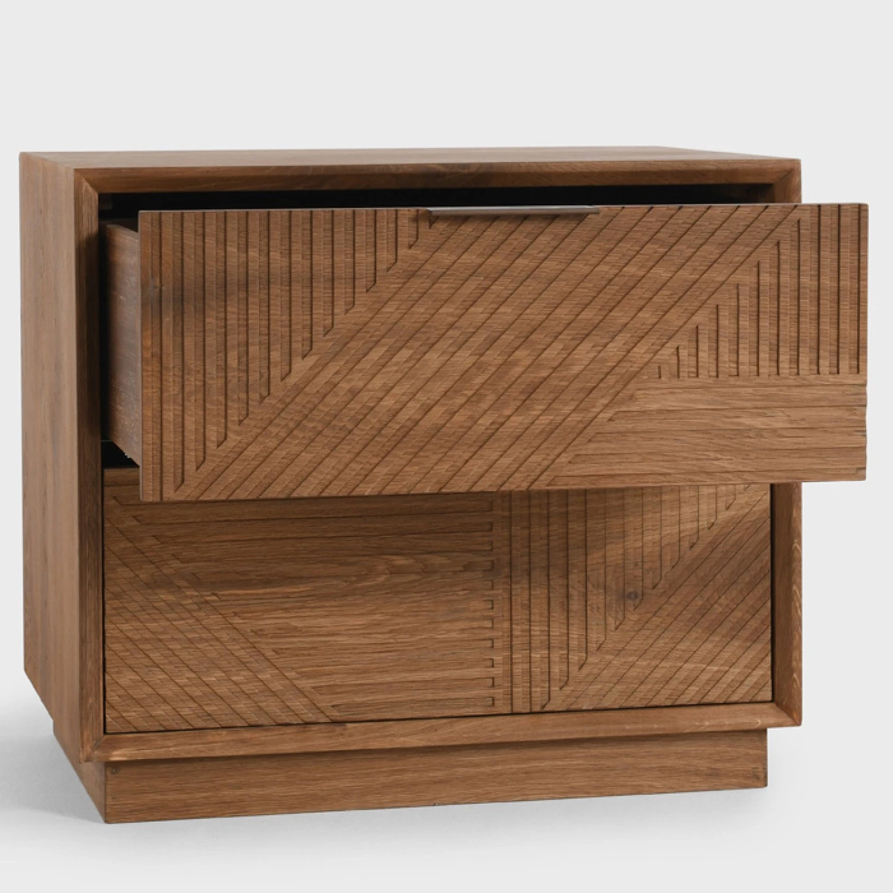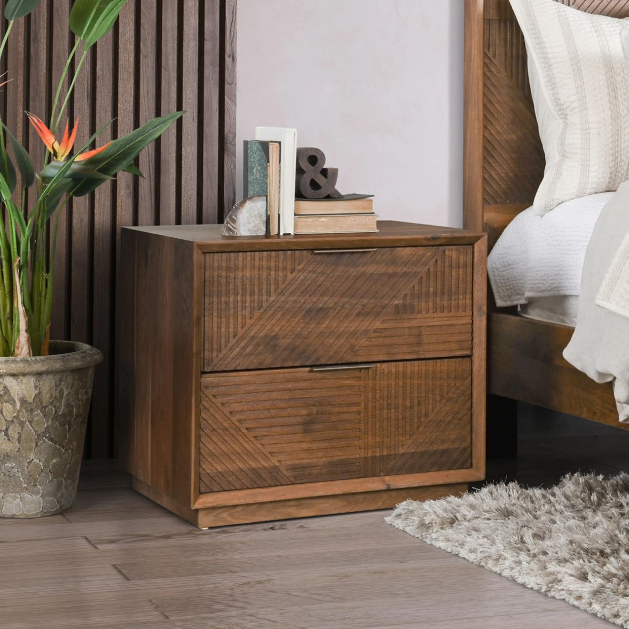 Designed as a modern showpiece, this nightstand features a sharp, linear pattern carved into its front. Two generously sized drawers keep items tucked neatly away. With its warm wood finish, this piece suits any color scheme.