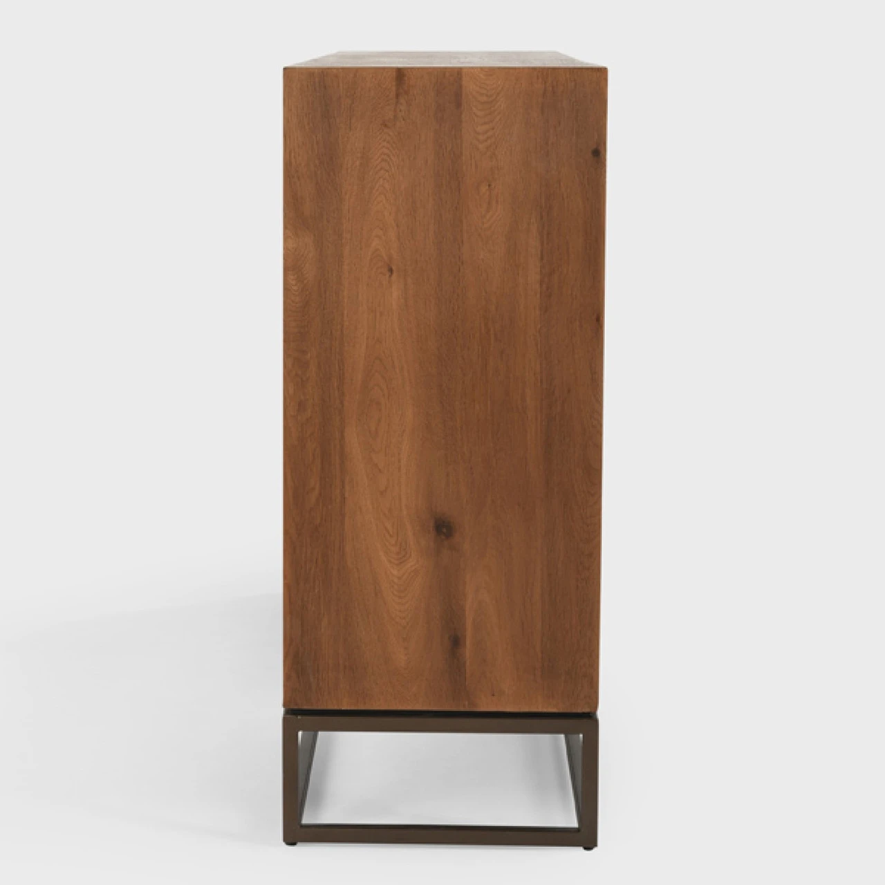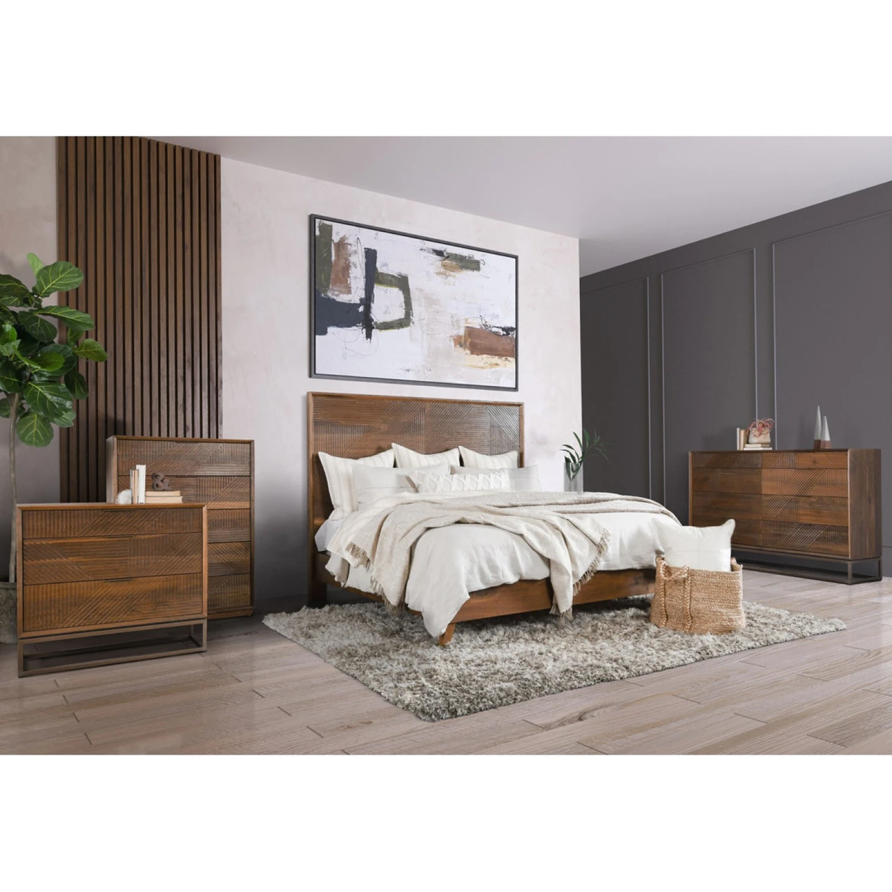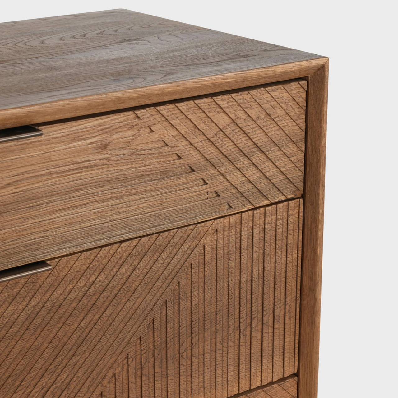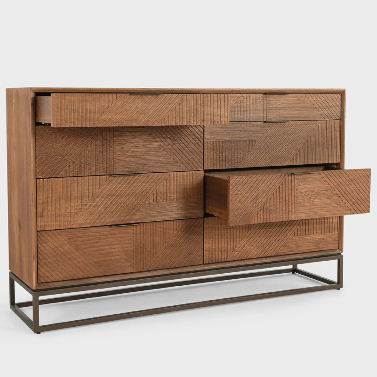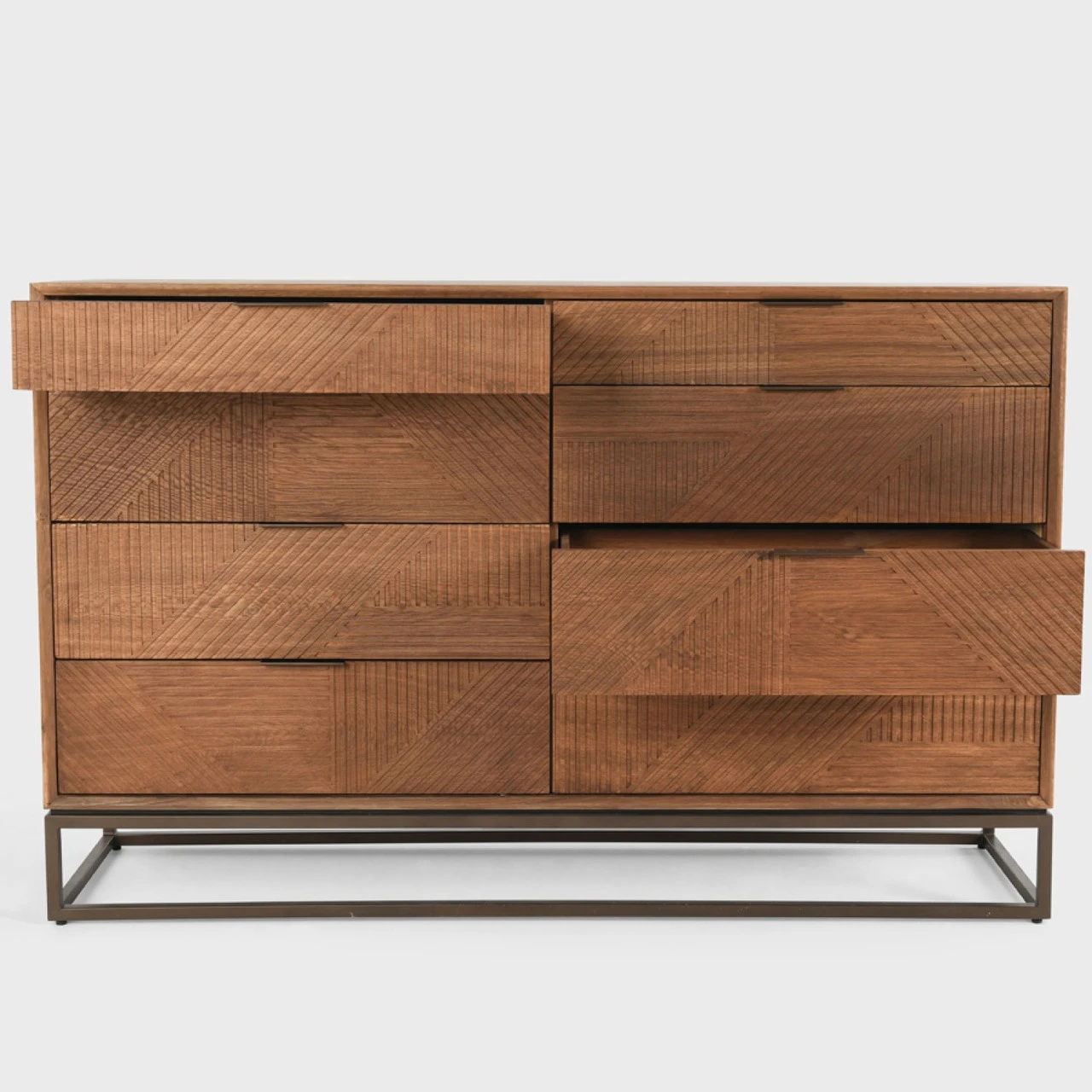 Designed as a modern showpiece, this dresser features a sharp, linear pattern carved into its front and a solid iron base. Eight generously sized drawers keep items tucked neatly away. With its warm finishes, this piece suits any color scheme.