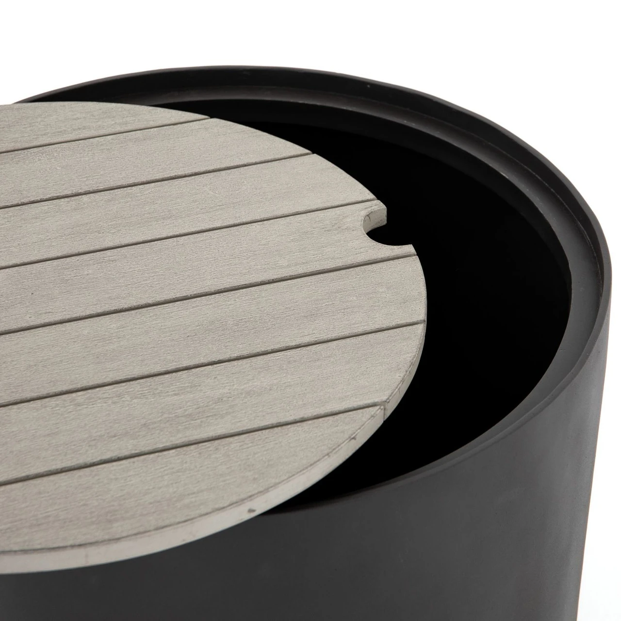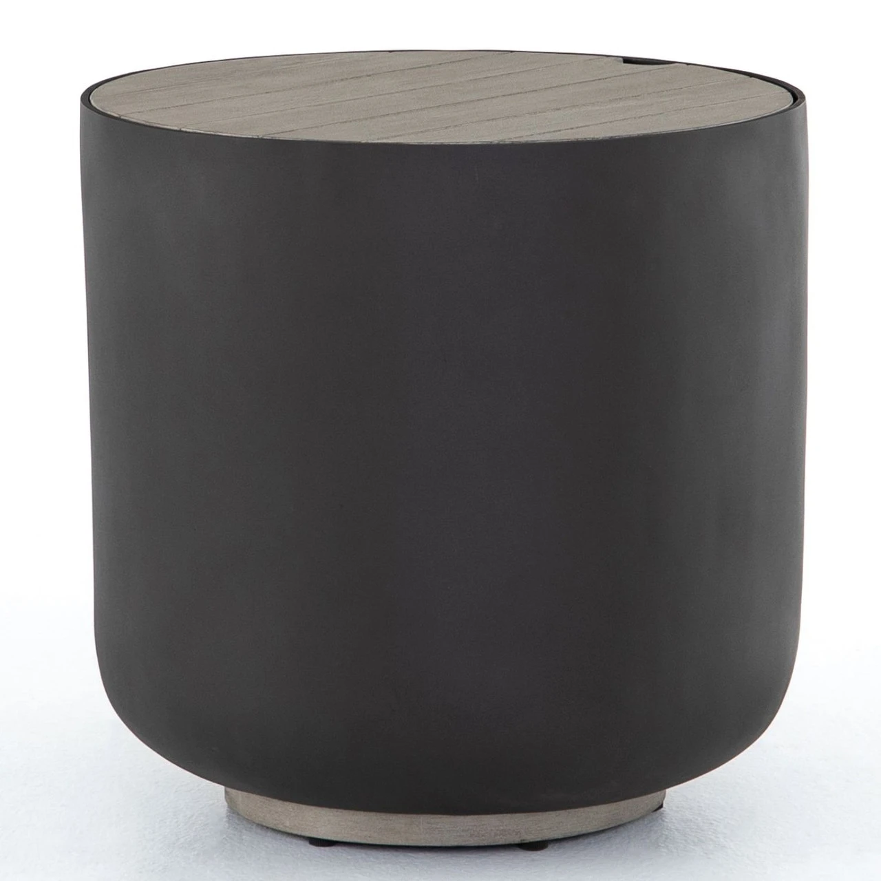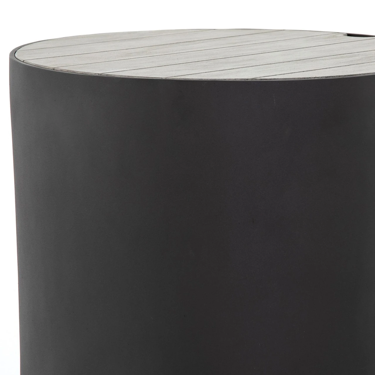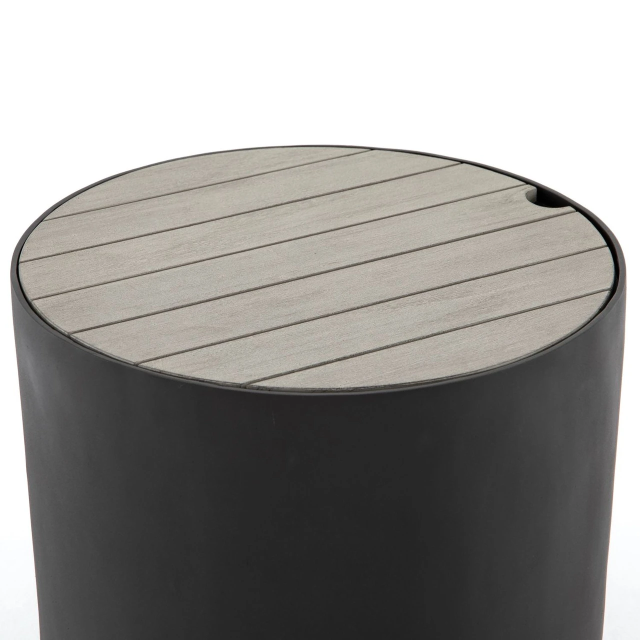 From handy surface to extra storage, a drum-style base of bronze-finished aluminum and removable grey teak top makes for a smart solution indoors or out. Single finger hole for easy top removal. Cover or store inside during inclement weather.