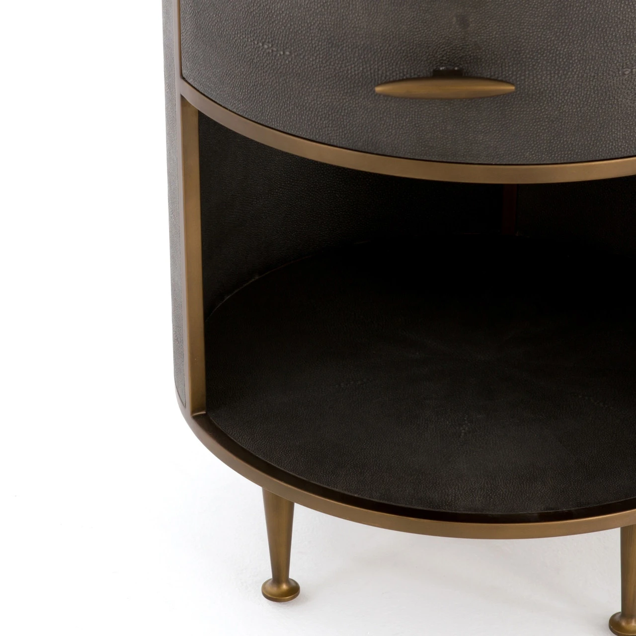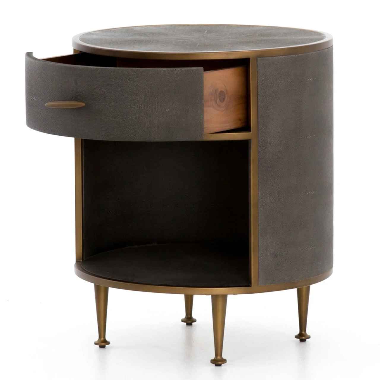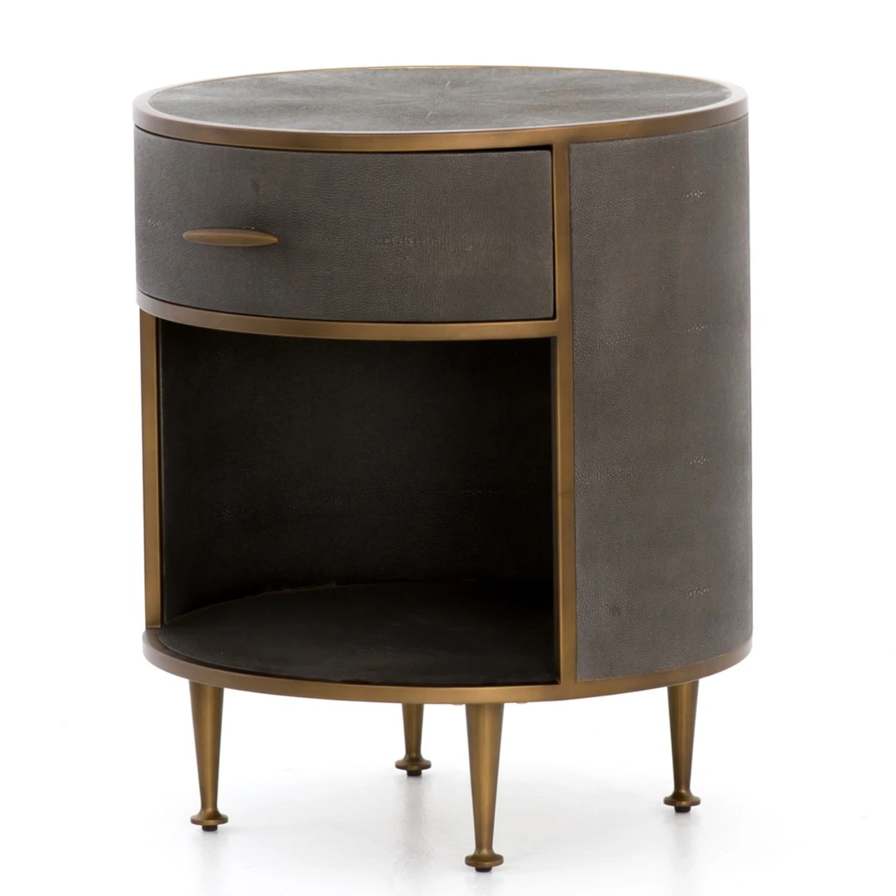Mid-century shaping takes on new intrigue in a fresh grey faux shagreen. A perfectly curved bedside table with stainless steel accents and handy drawer storage.