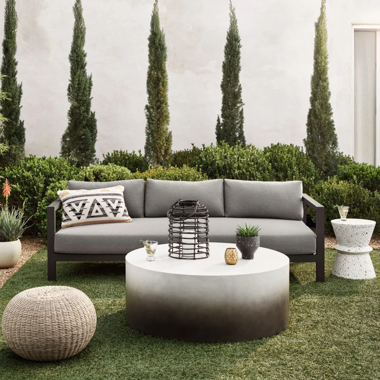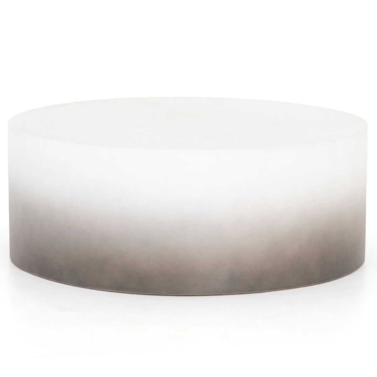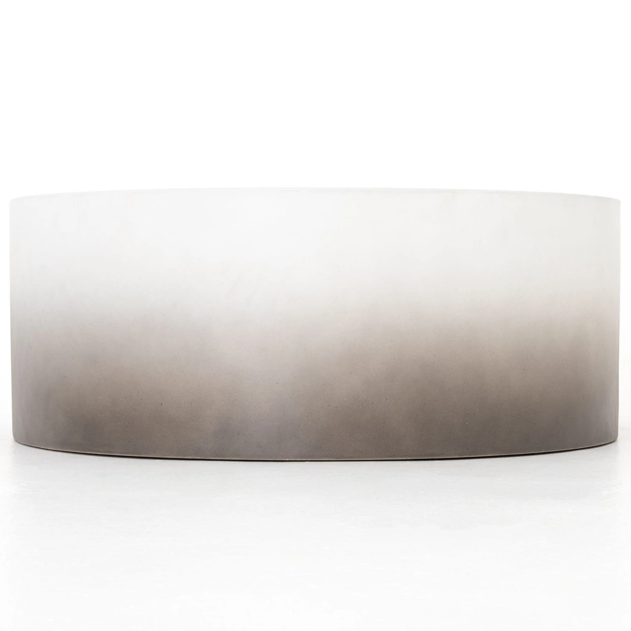 Ombre finishes transform industrial materials. Concrete takes on alluring shapes – rounded, polished, and finished in a slate grey. This coffee table makes a modern statement indoors or out. Cover or store indoors during inclement weather and when not in use.
