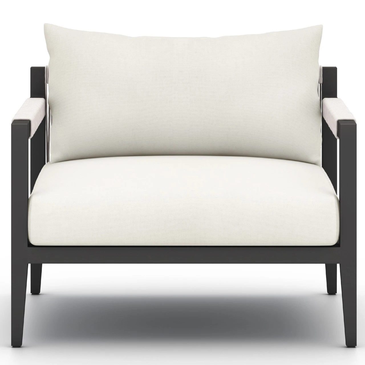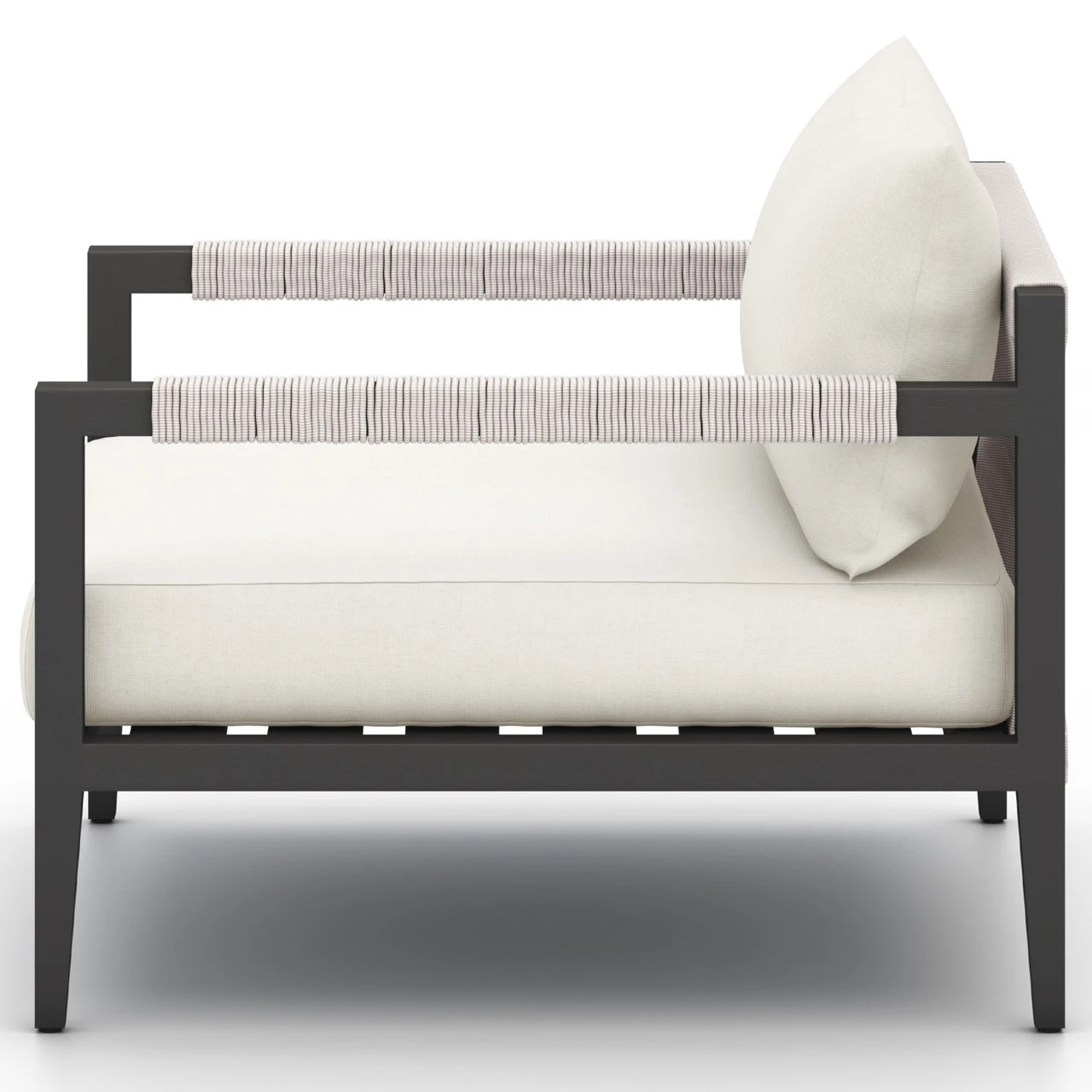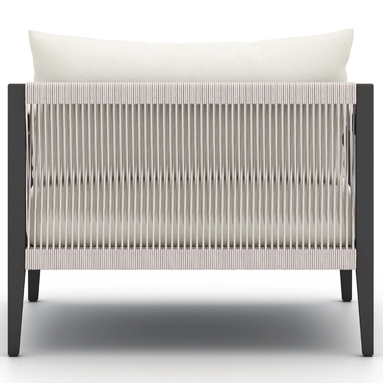 Modern materials ready a stylish silhouette for the outdoors. Sturdy aluminum forms a clean frame for UV-resistant, water-repellent Sunproof fabric on this outdoor chair. Rope-wrapped armrests and rear cotton weaving add a textured finishing touch. Cover or store indoors during inclement weather.