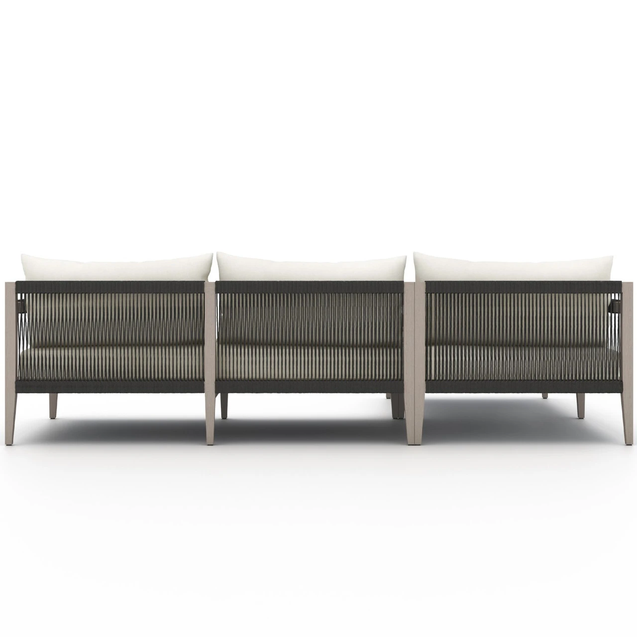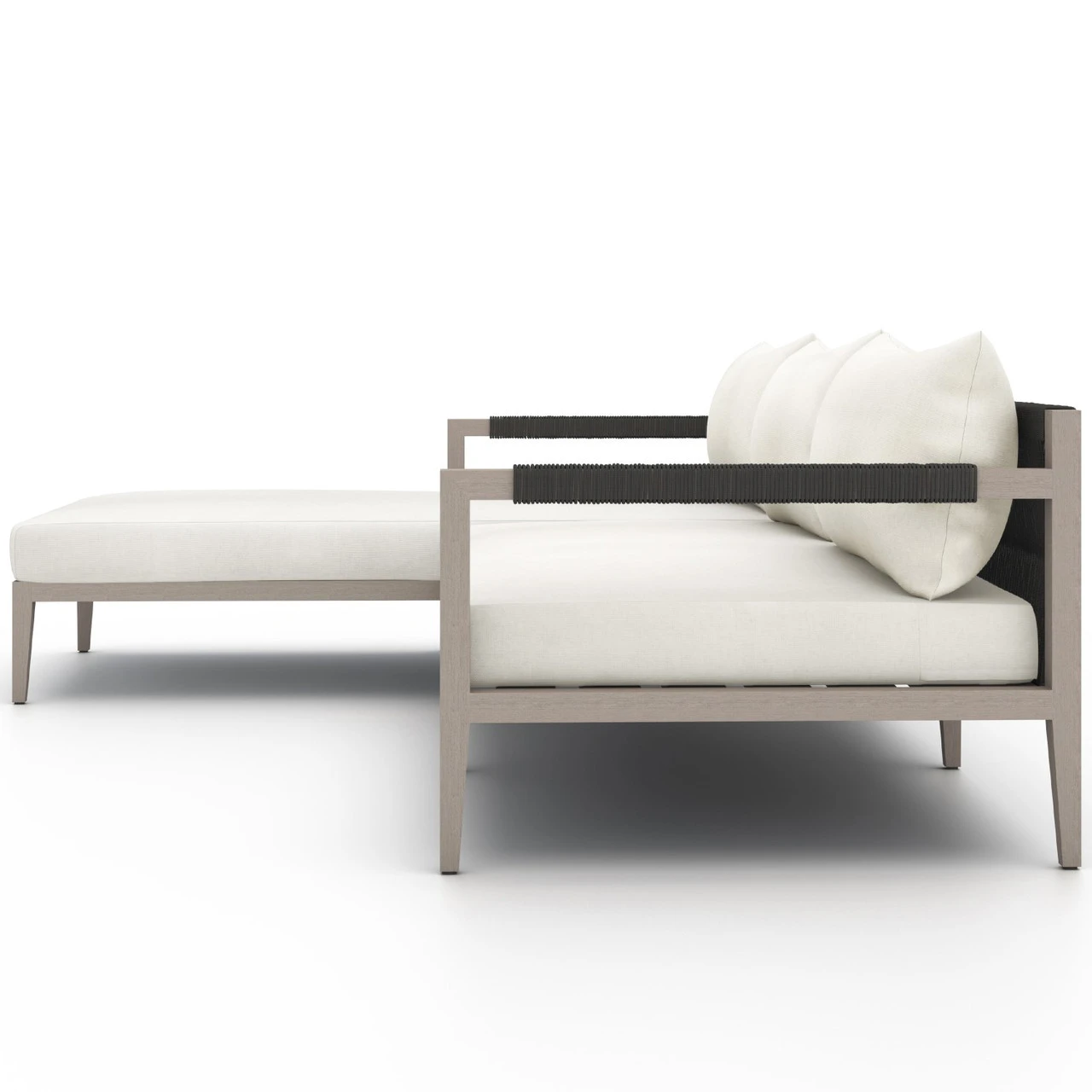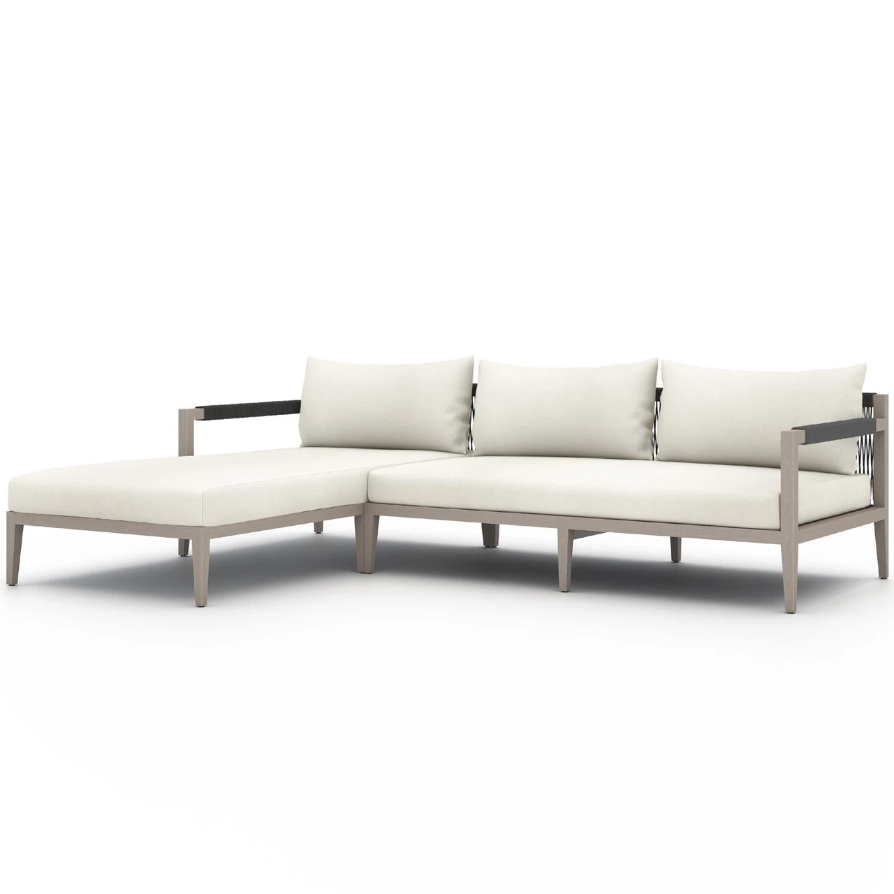 Modern materials ready a stylish silhouette for the outdoors. Solid FSC-certified teak forms a clean frame for UV-resistant, water-repellent Sunproof fabric on this two-piece outdoor sectional. Rope-wrapped armrests and rear cotton weaving add a textured finishing touch. Left arm facing chaise sectional. Cover or store indoors during inclement weather.