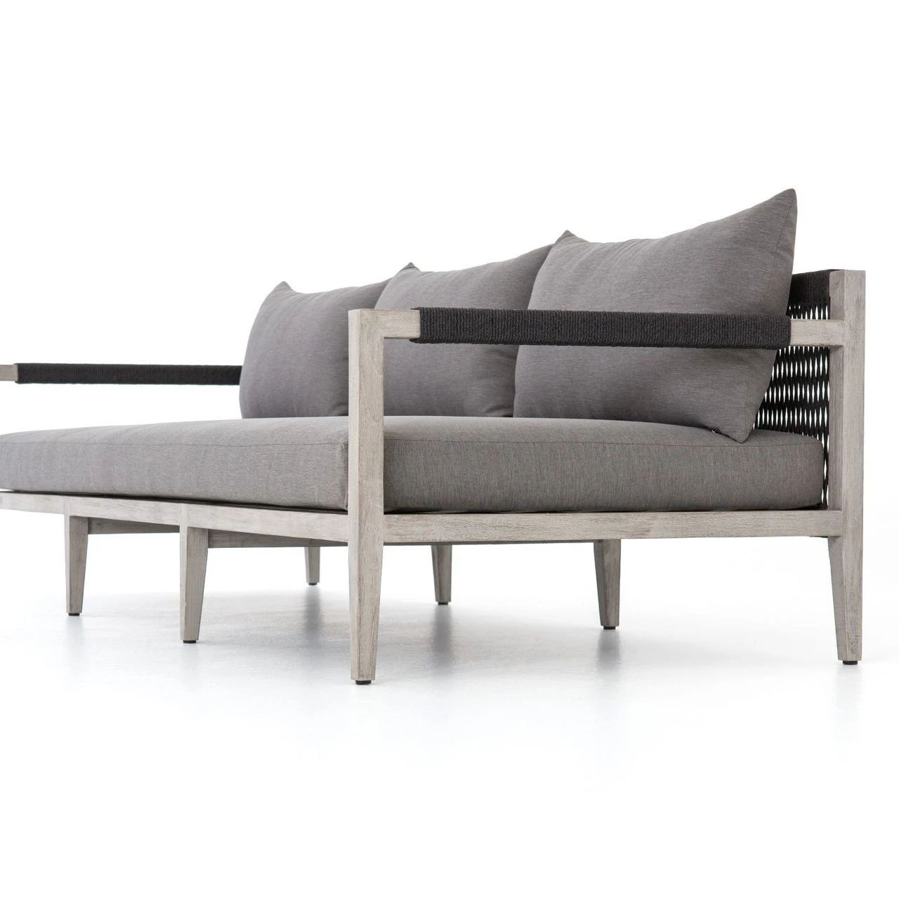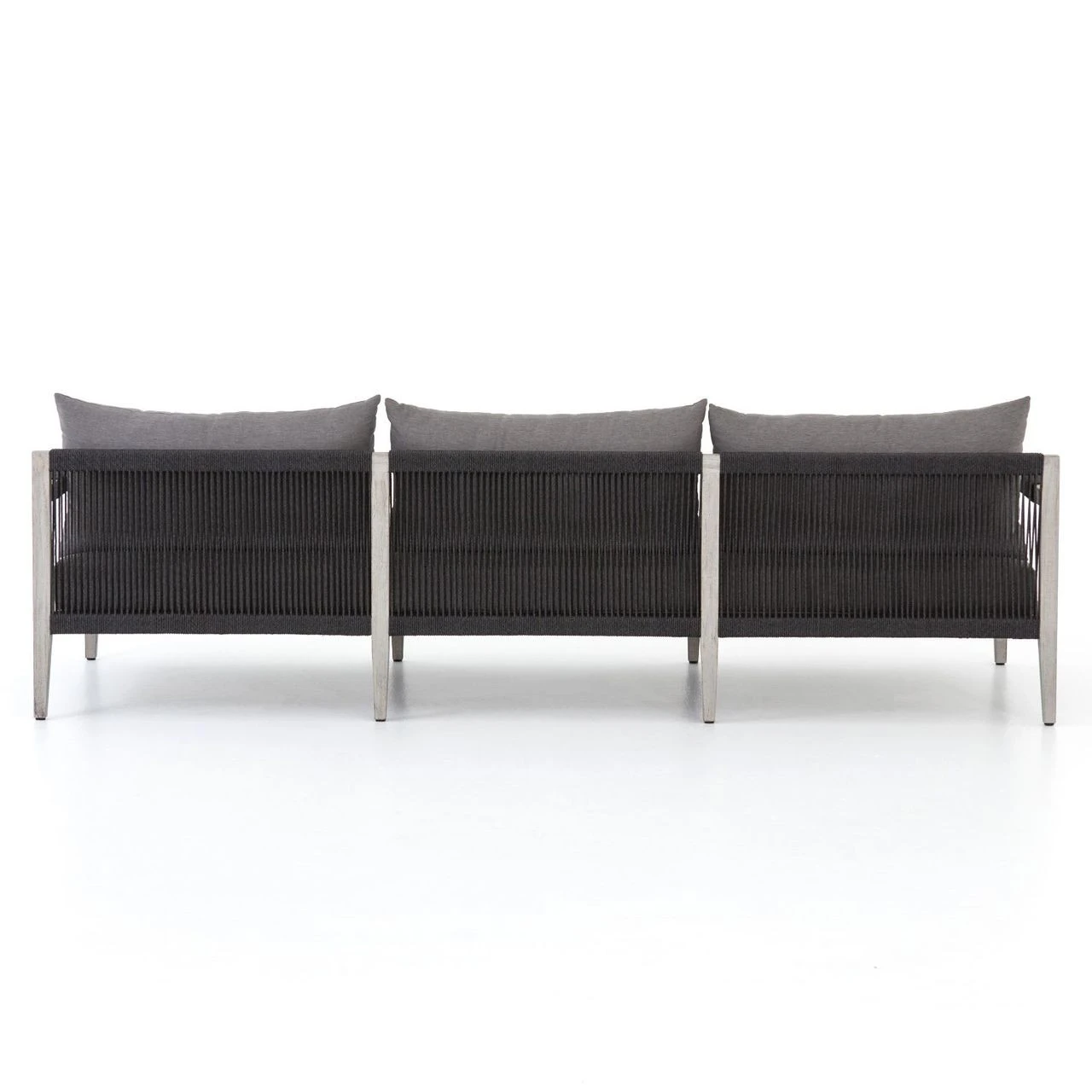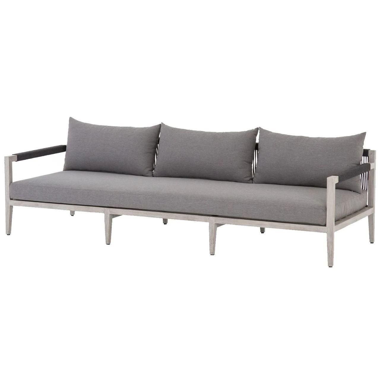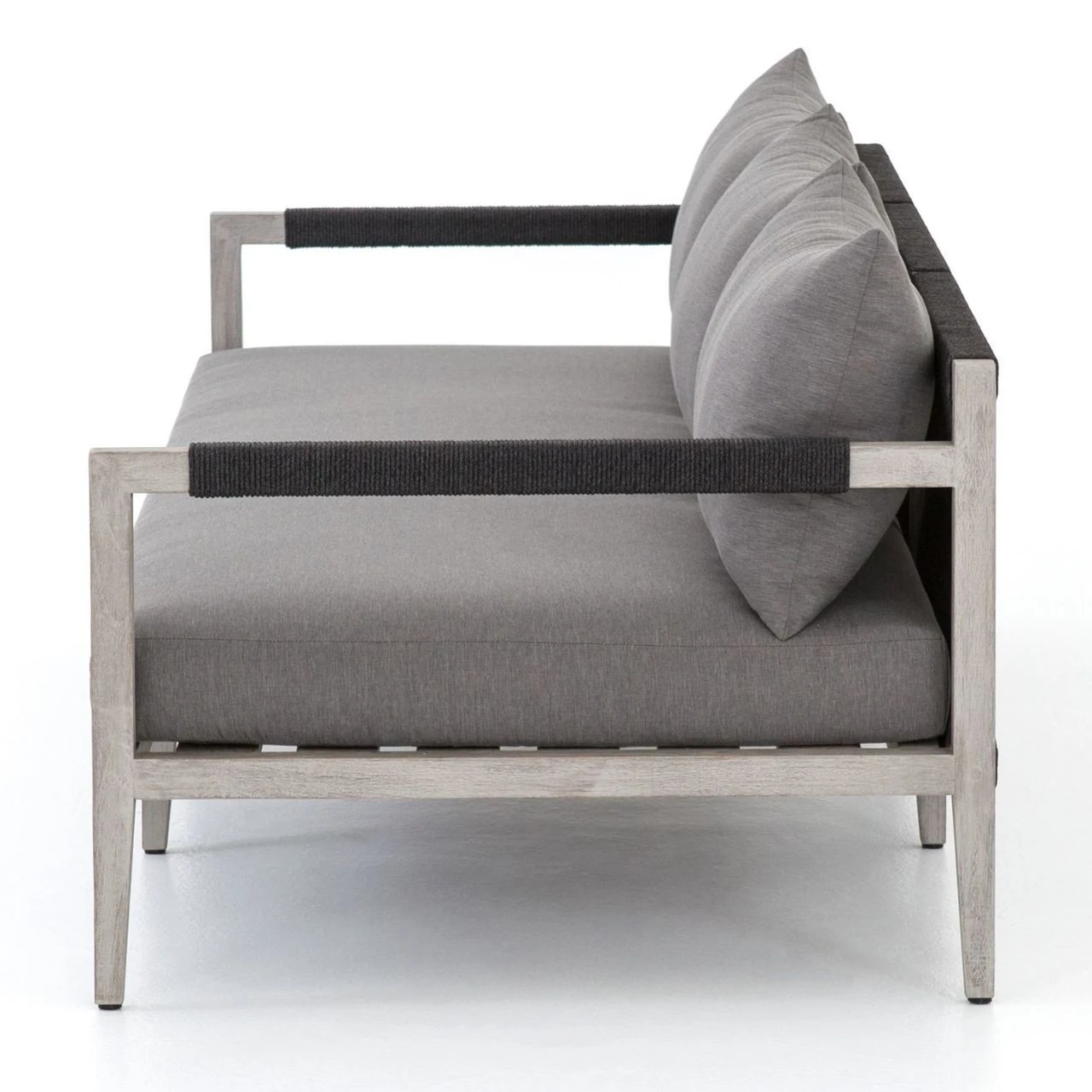 Weathered grey teak forms a linear three-seat sofa frame for UV-resistant and water-repellent Sunproof fabric in an inviting charcoal color. Rope-wrapped armrests and rear weaving add a textured touchย to mid century modern inspired large outdoor couch.ย Our Sherwood Grey Teak Outdoor 3 Seater Sofa is ready forย luxurious lounging for many summers to come.ย ย