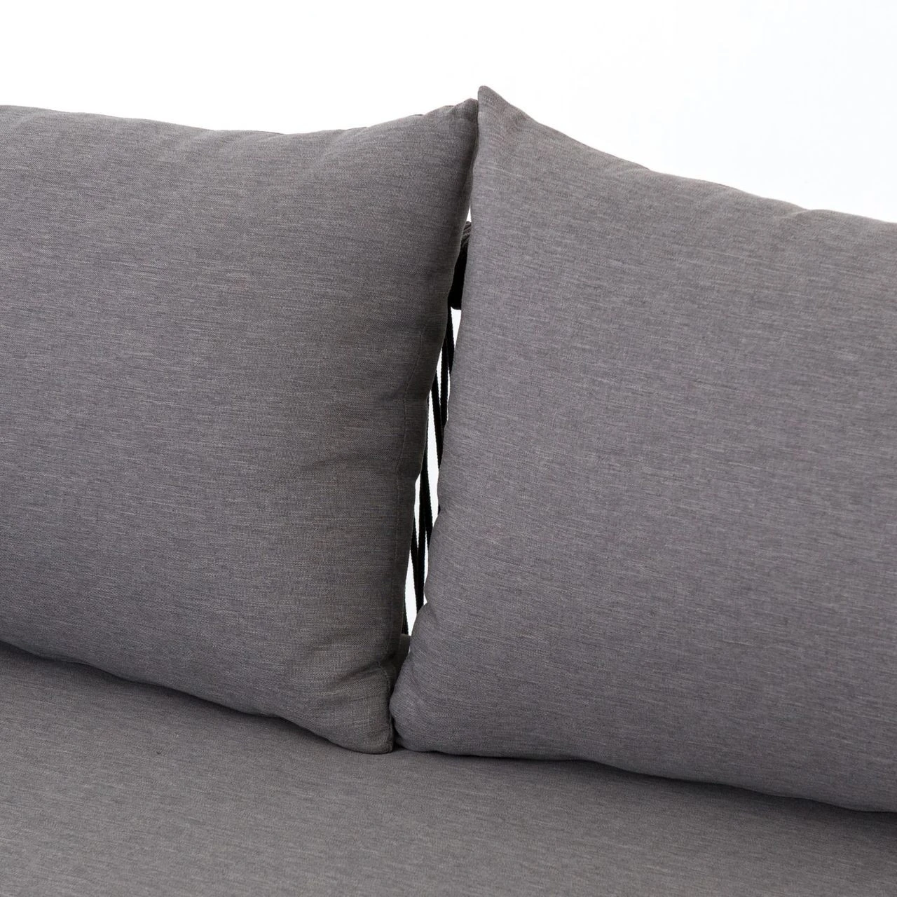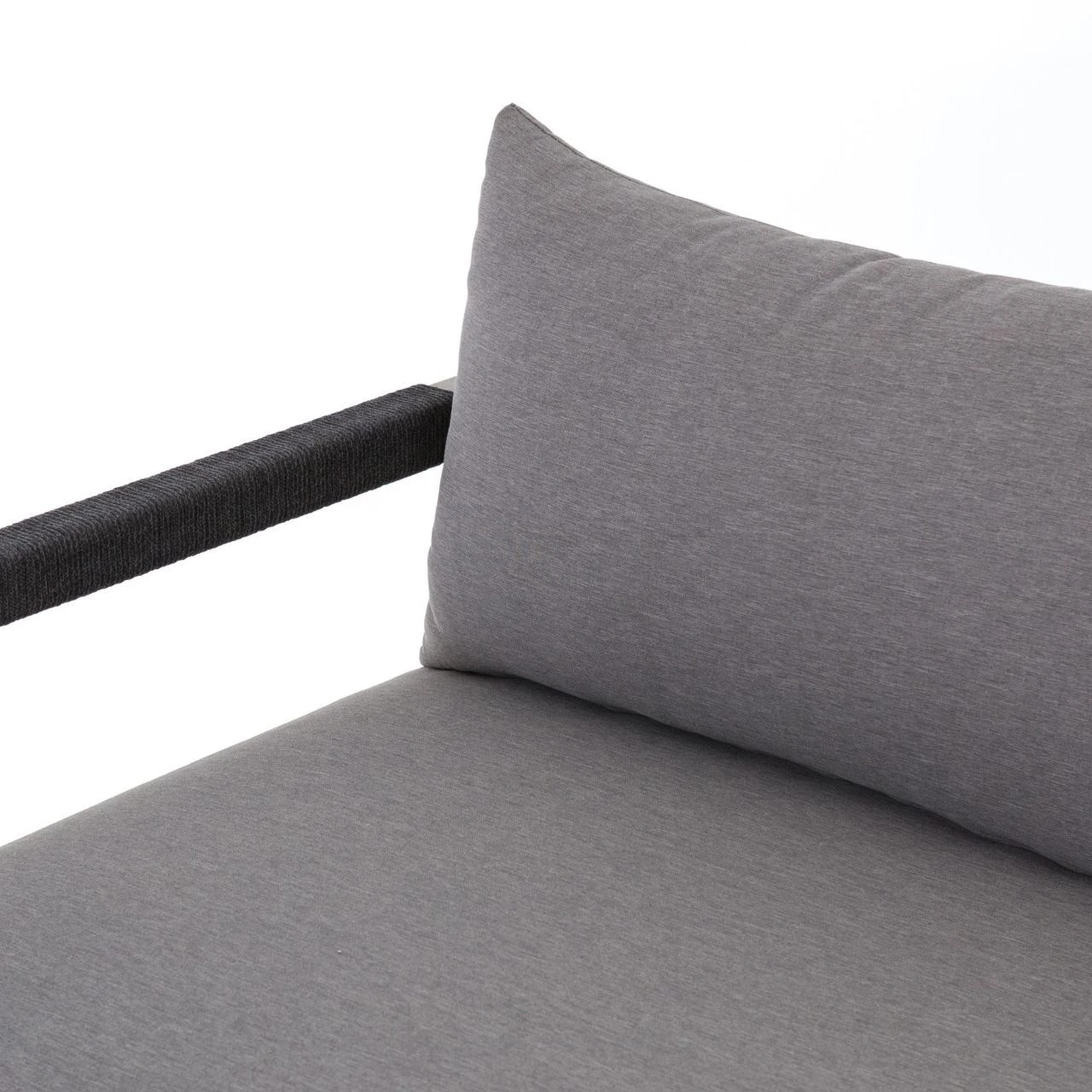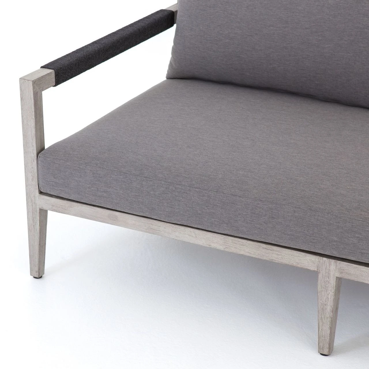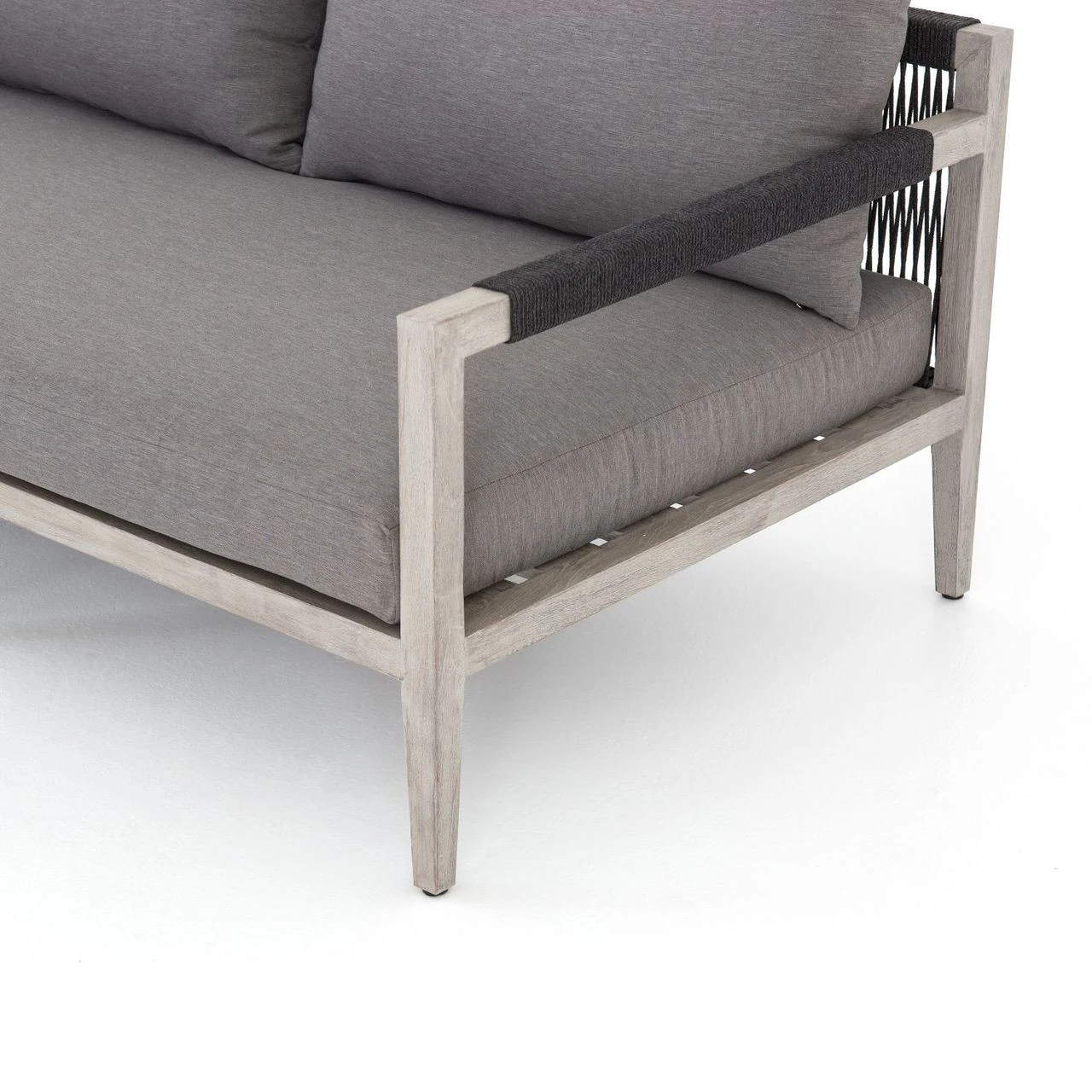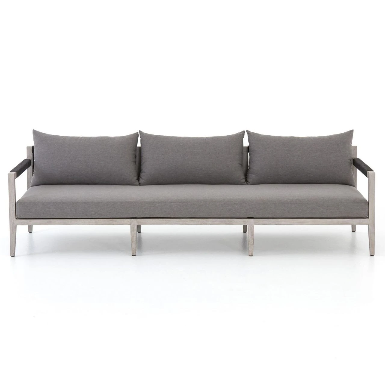 Weathered grey teak forms a linear three-seat sofa frame for UV-resistant and water-repellent Sunproof fabric in an inviting charcoal color. Rope-wrapped armrests and rear weaving add a textured touchย to mid century modern inspired large outdoor couch.ย Our Sherwood Grey Teak Outdoor 3 Seater Sofa is ready forย luxurious lounging for many summers to come.ย ย