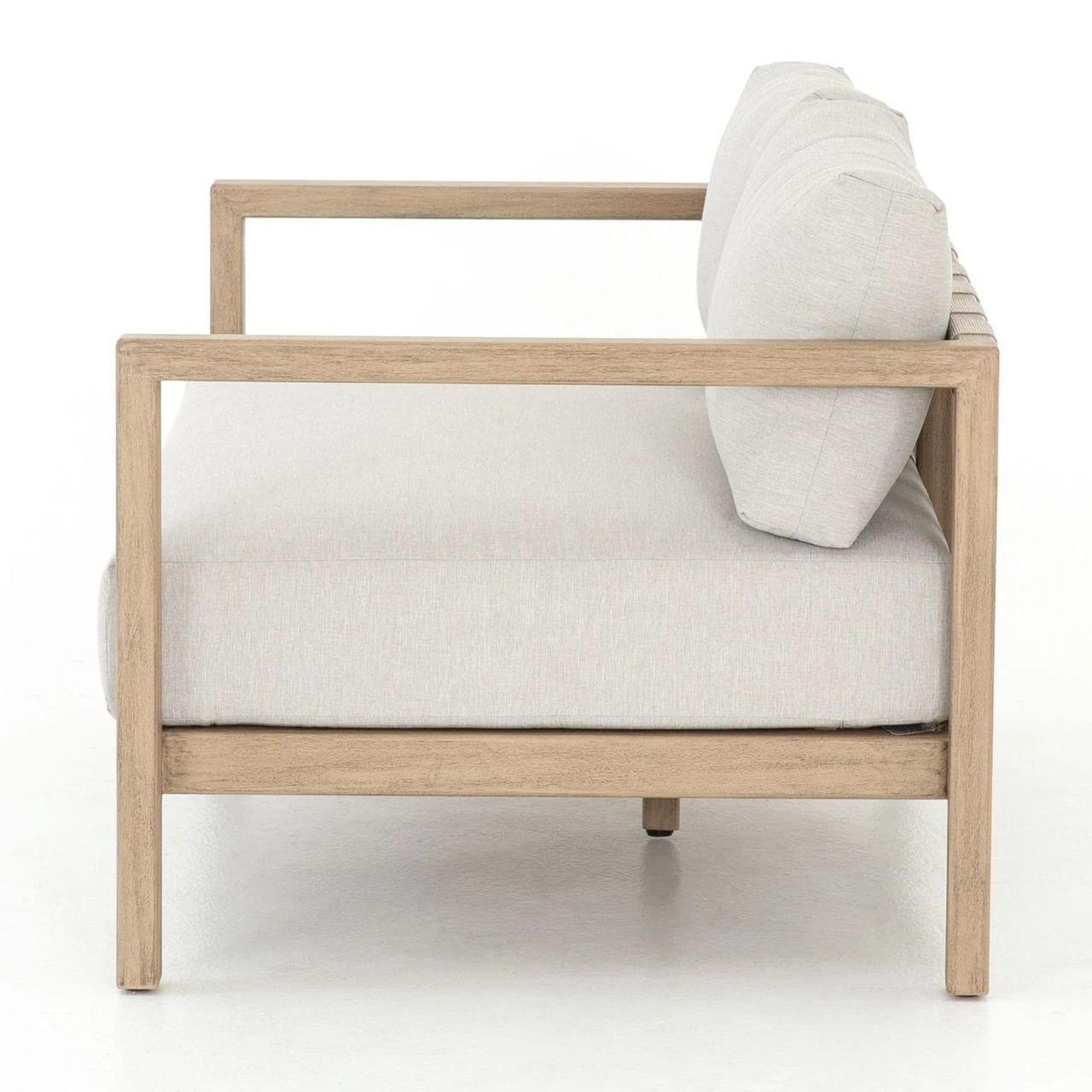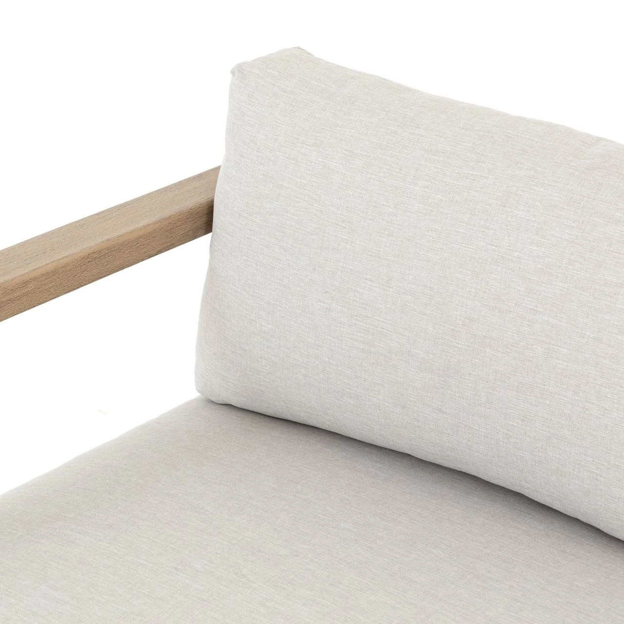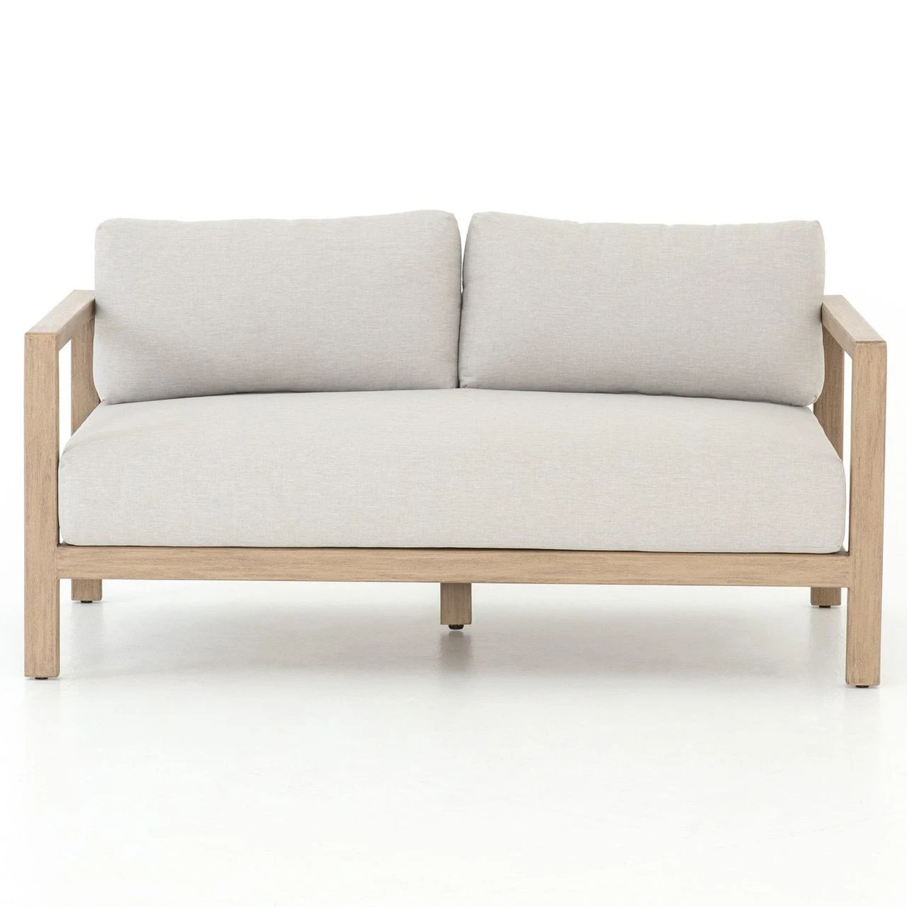 Modern materials ready a stylish silhouette for the outdoors. Washed brown teak wood forms a clean two-seat frame for UV-resistant and water-repellent Sunproof fabric plump cushions in an inviting Stone grey color. Back straps add intrigue to this modern outdoor loveseat couch. Our Sonoma Natural Teak Outdoor Sofa 60″built for luxurious lounging for many summers to come.