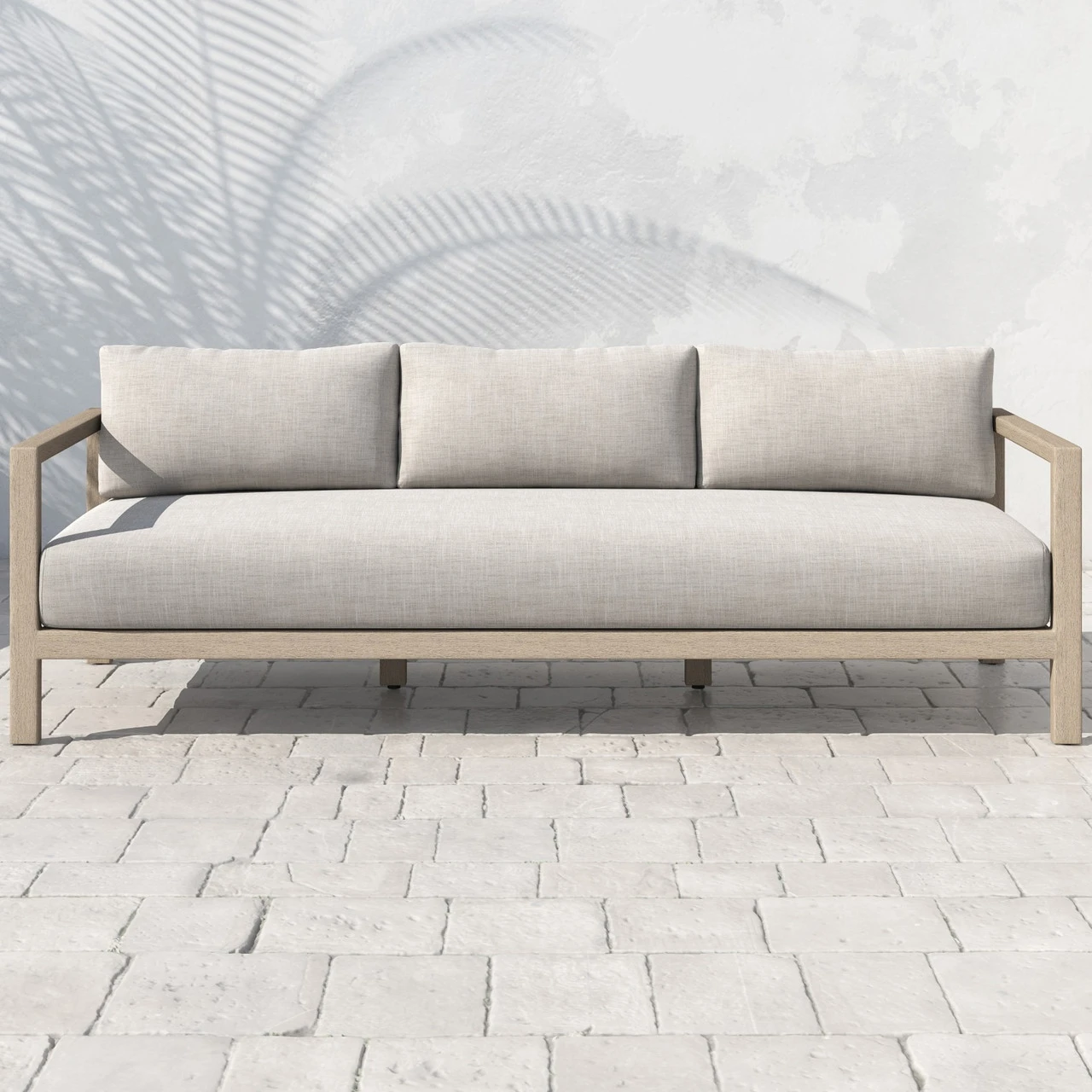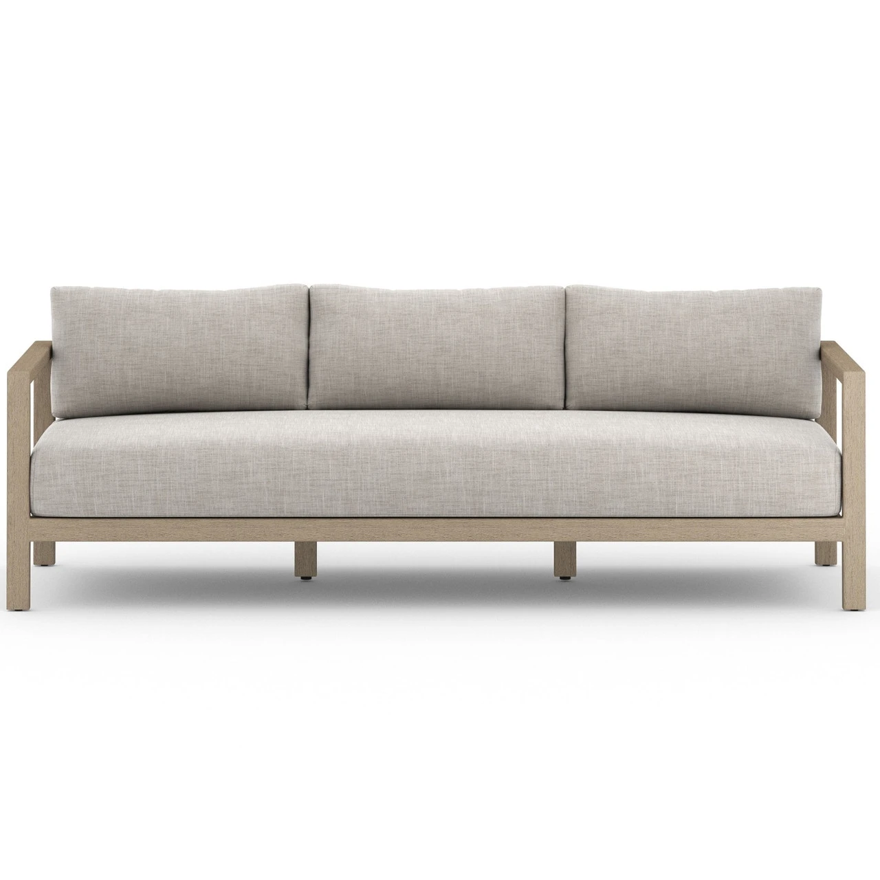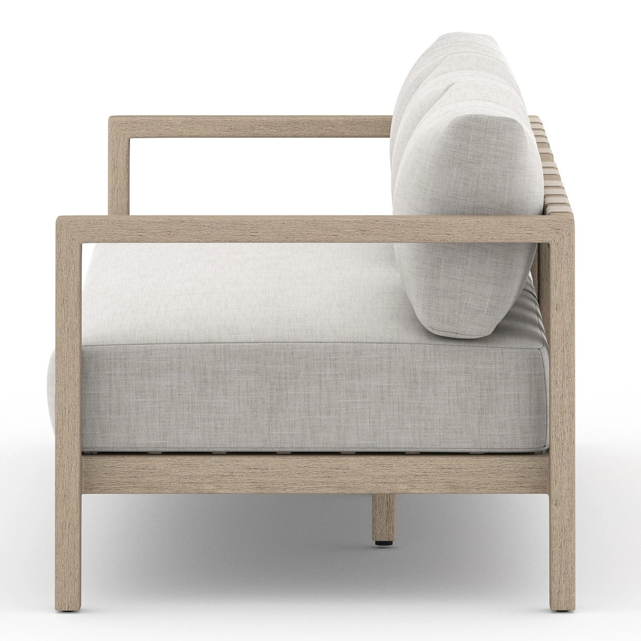 Modern materials ready a stylish silhouette for the outdoors. Washed brown teak forms a clean two-seat frame for UV-resistant and water-repellent Sunproof fabric in stone grey. Architectural arms and midcentury modern design add intrigue to our modern wooden outdoor couch. Our Monterey Natural Teak Outdoor 2 Seater Sofa is built to last and makes a stunning yet comfortable addition to any luxurious lounging outdoor space.