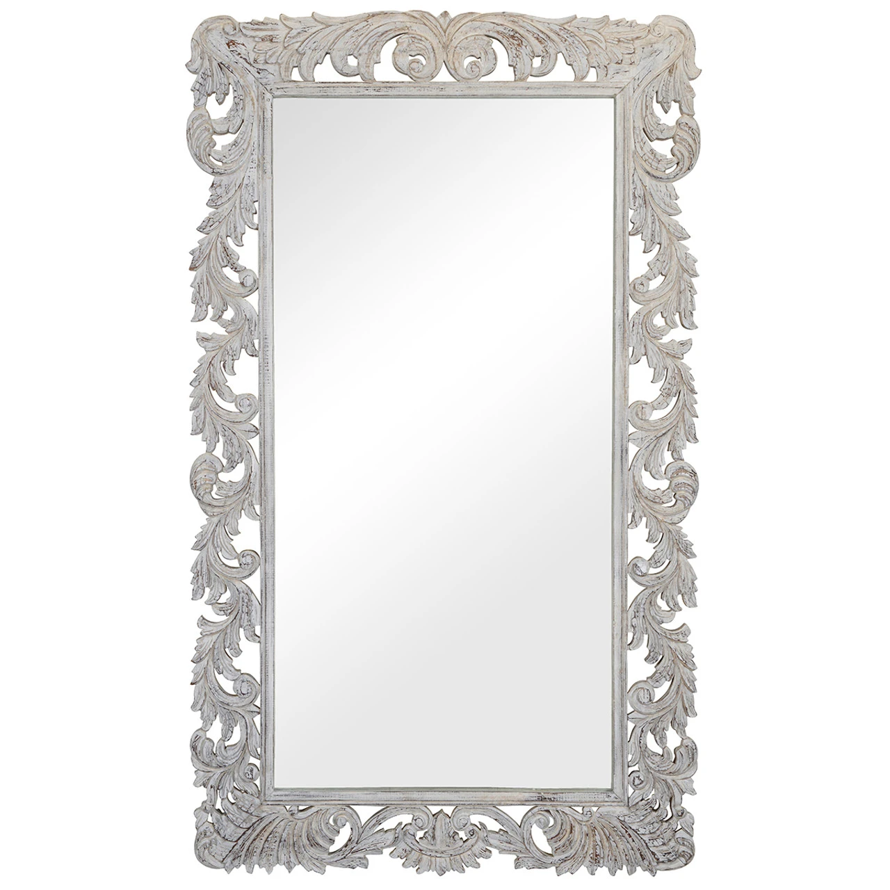 Define your space with this floor mirror framed by intricate floral carvings. Oversized yet elegant, this mirror makes a stunning addition to any well-appointed room. A light whitewash finish highlights the natural beauty of the solid mango wood frame.