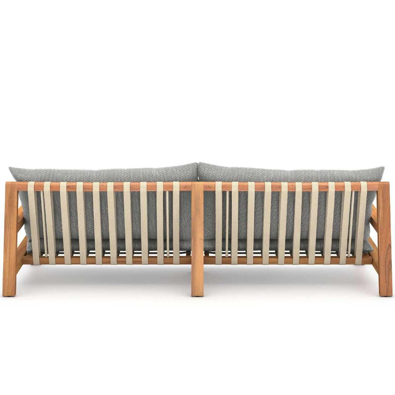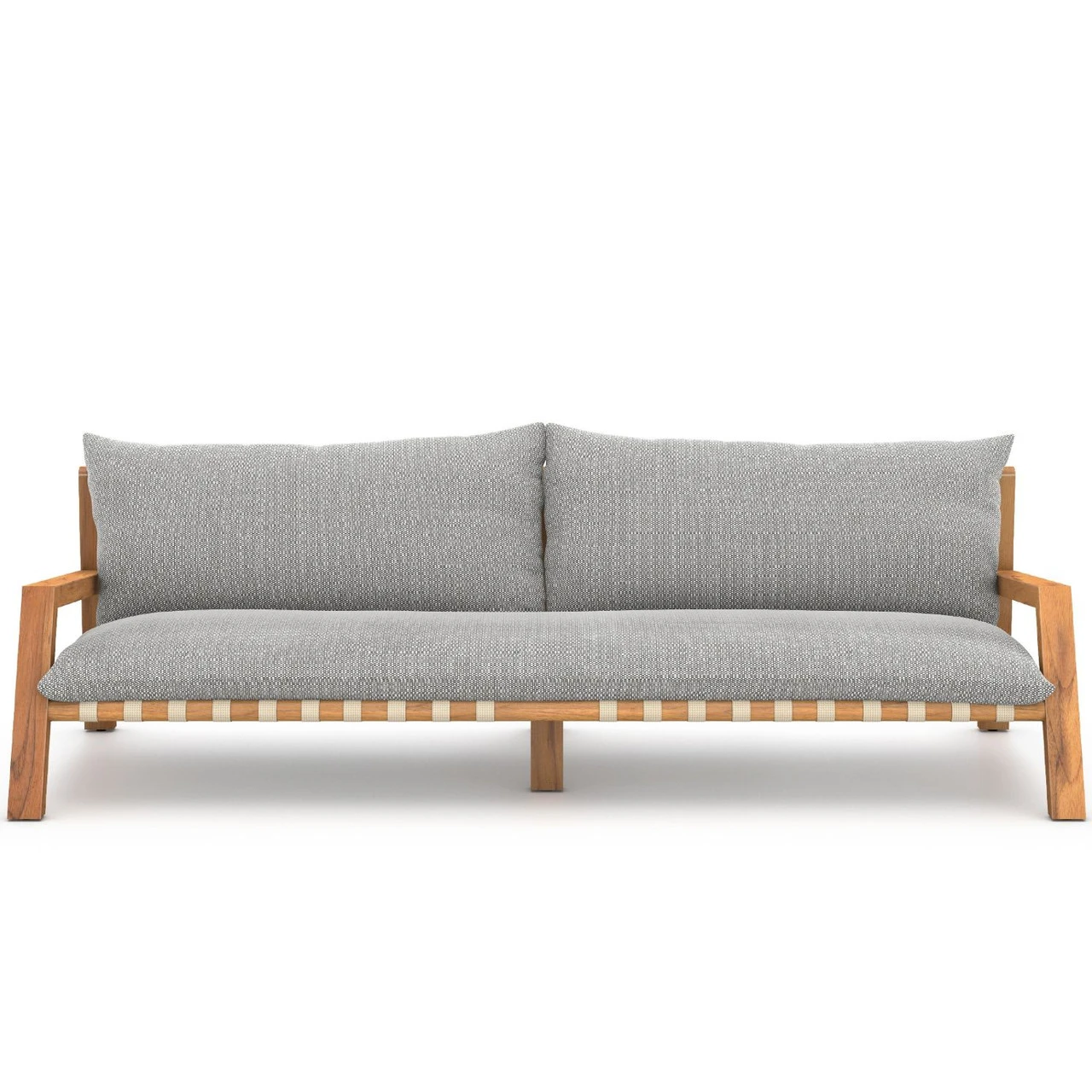 Bring sophistication to the great outdoors. Clean, wide framing of FSC-certified teak splays for angular intrigue, with ash-colored seating and ivory strap detailing. Cover or store indoors during inclement weather and when not in use.