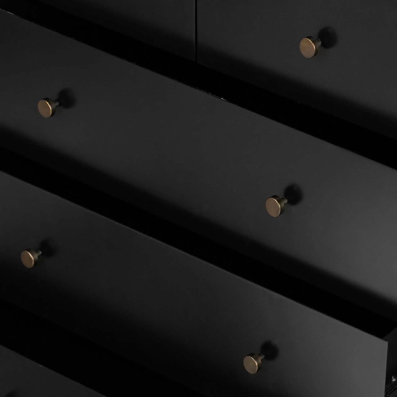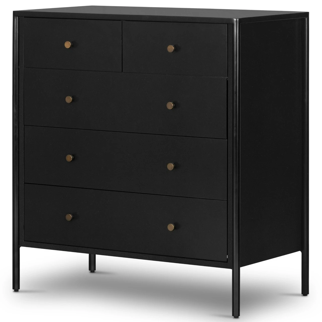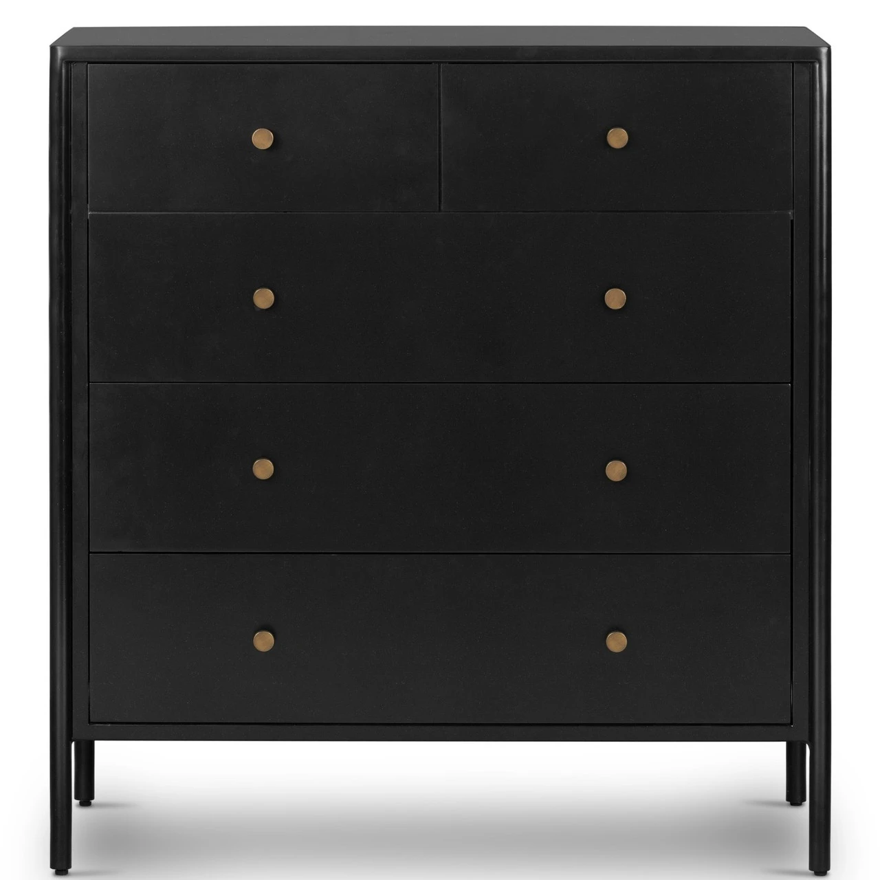 Bring a clean, beautifully industrial look to the bedroom with a roomy five-drawer dresser made from black-finished iron, featuring bronzed iron hardware.