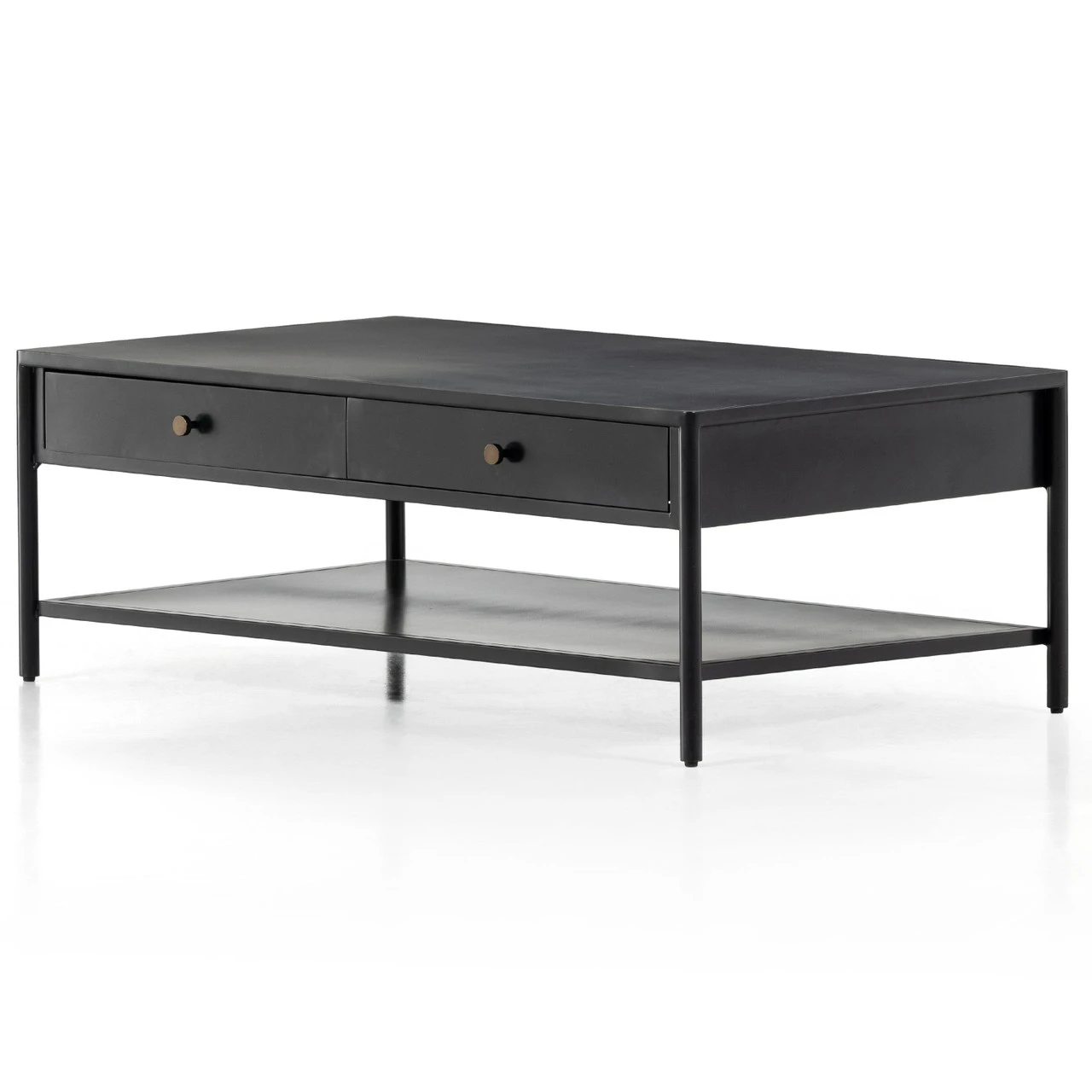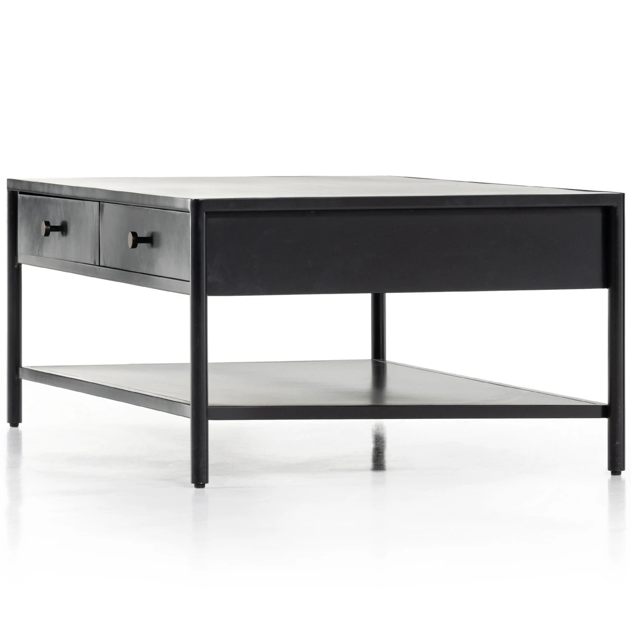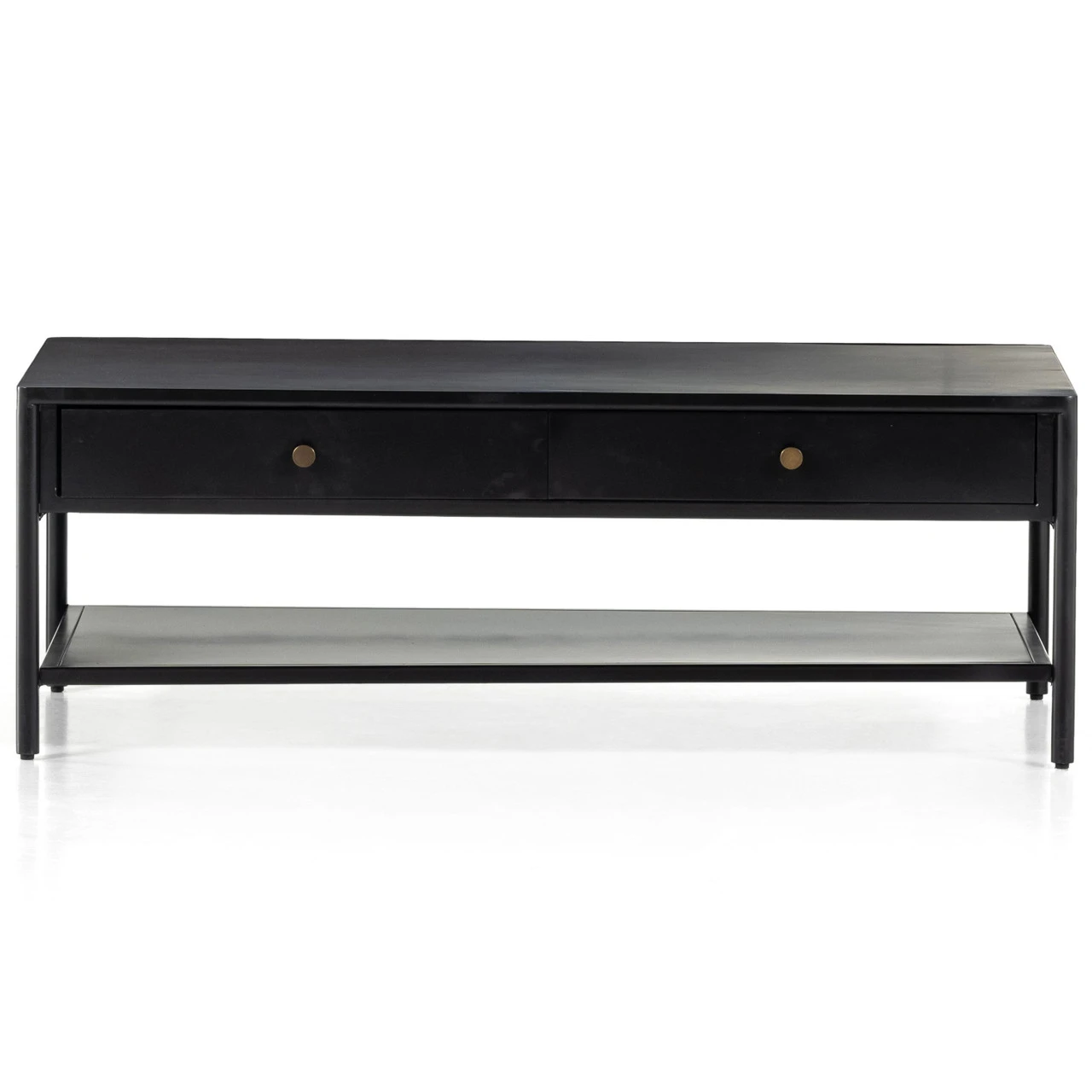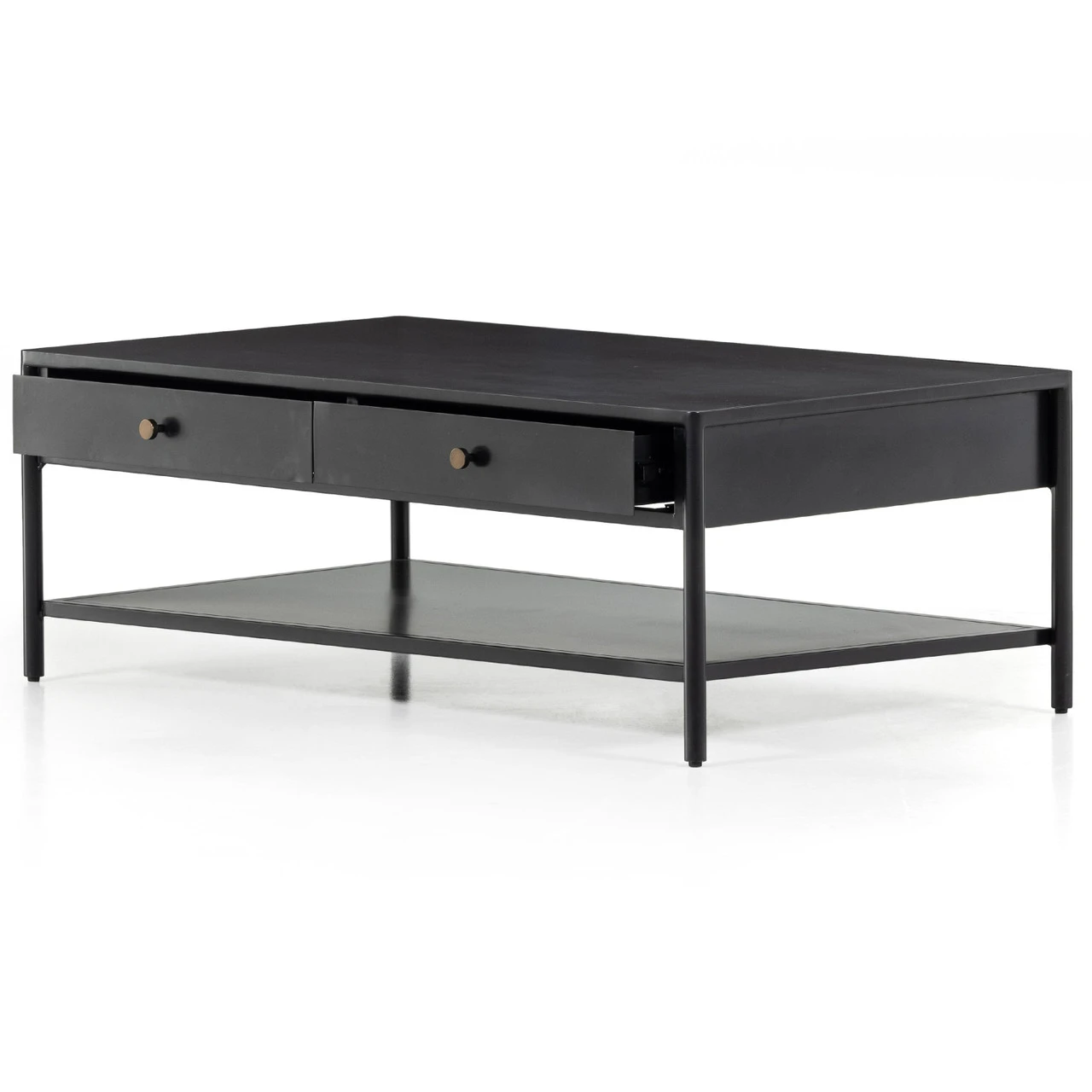 Bring a softened industrial look to the living room with a simple black-finished iron coffee table featuring bronzed iron hardware for modernity. Drawers and lower shelving add bonus storage space.
