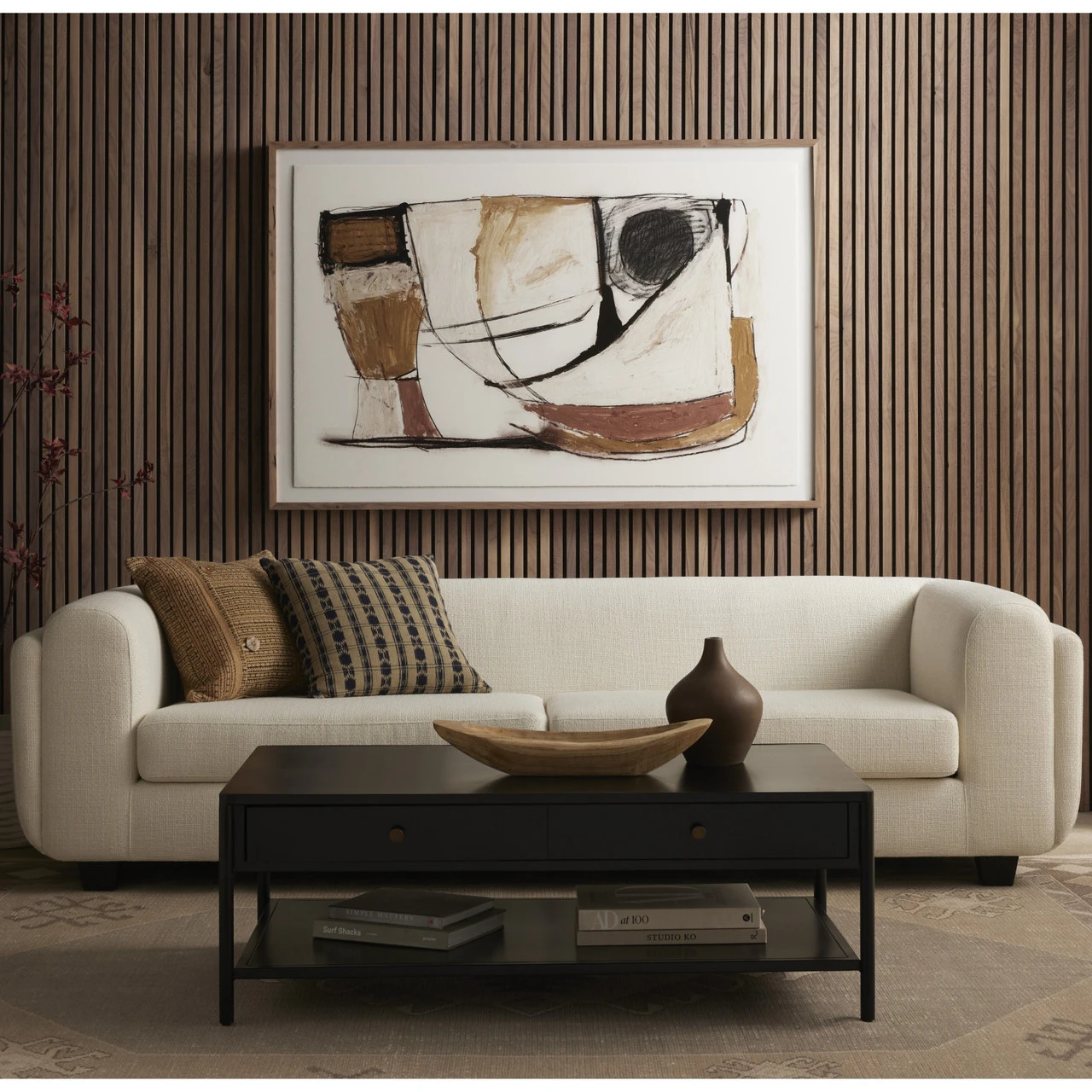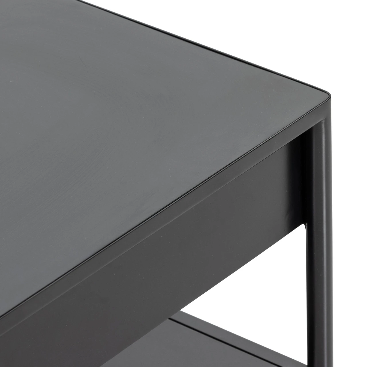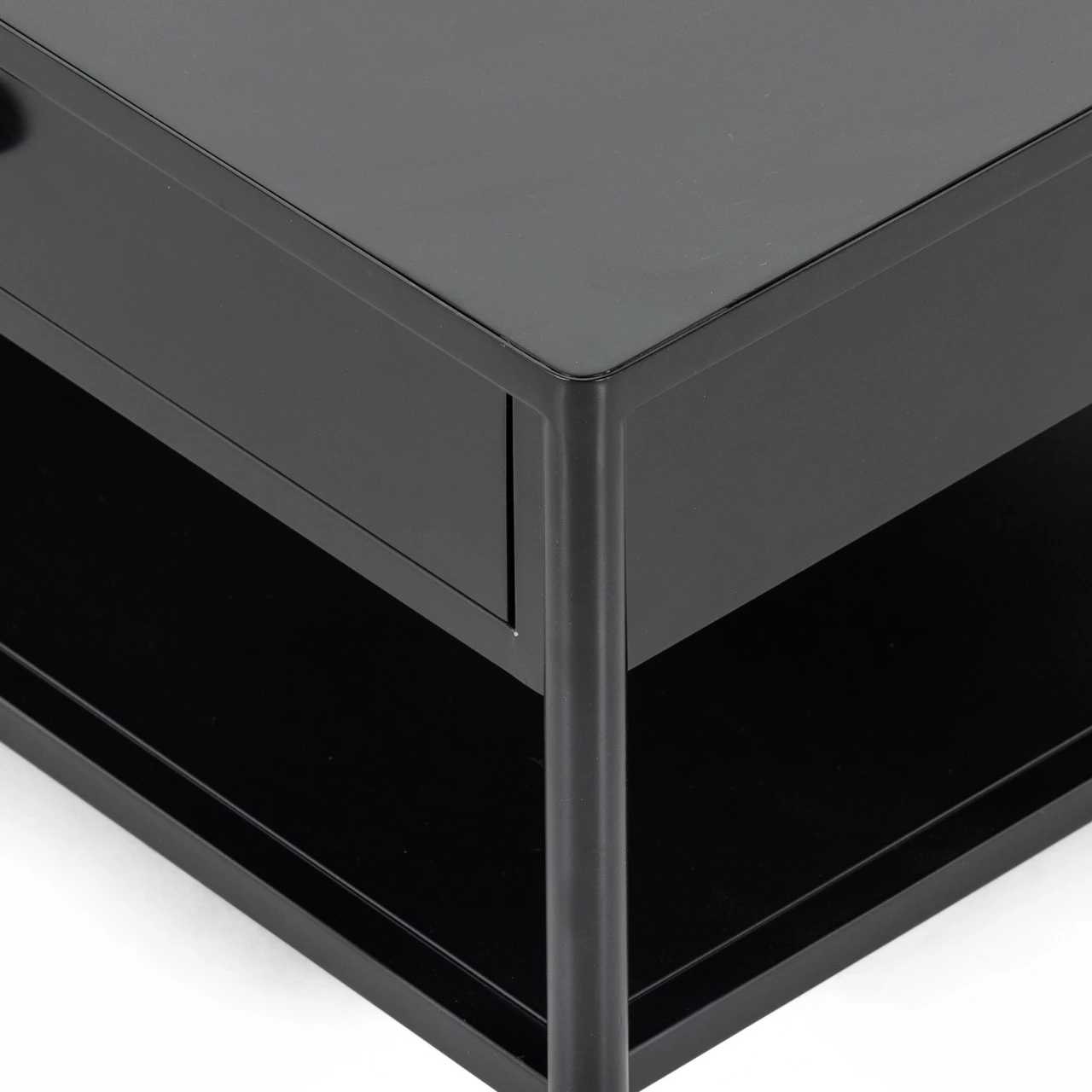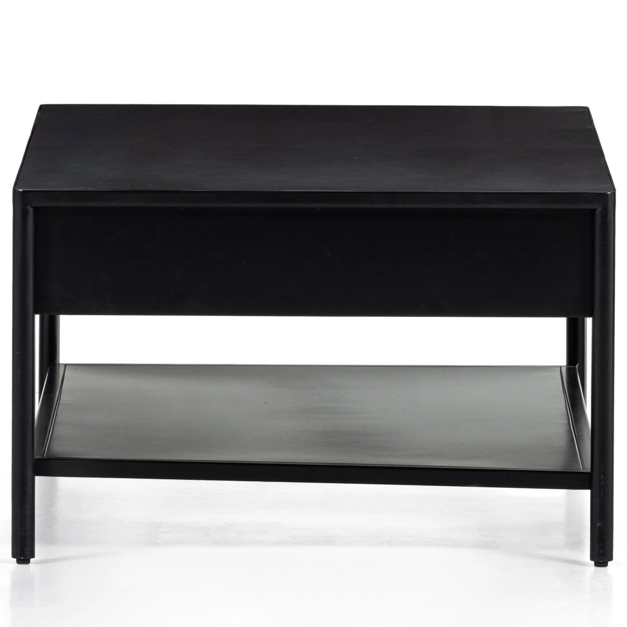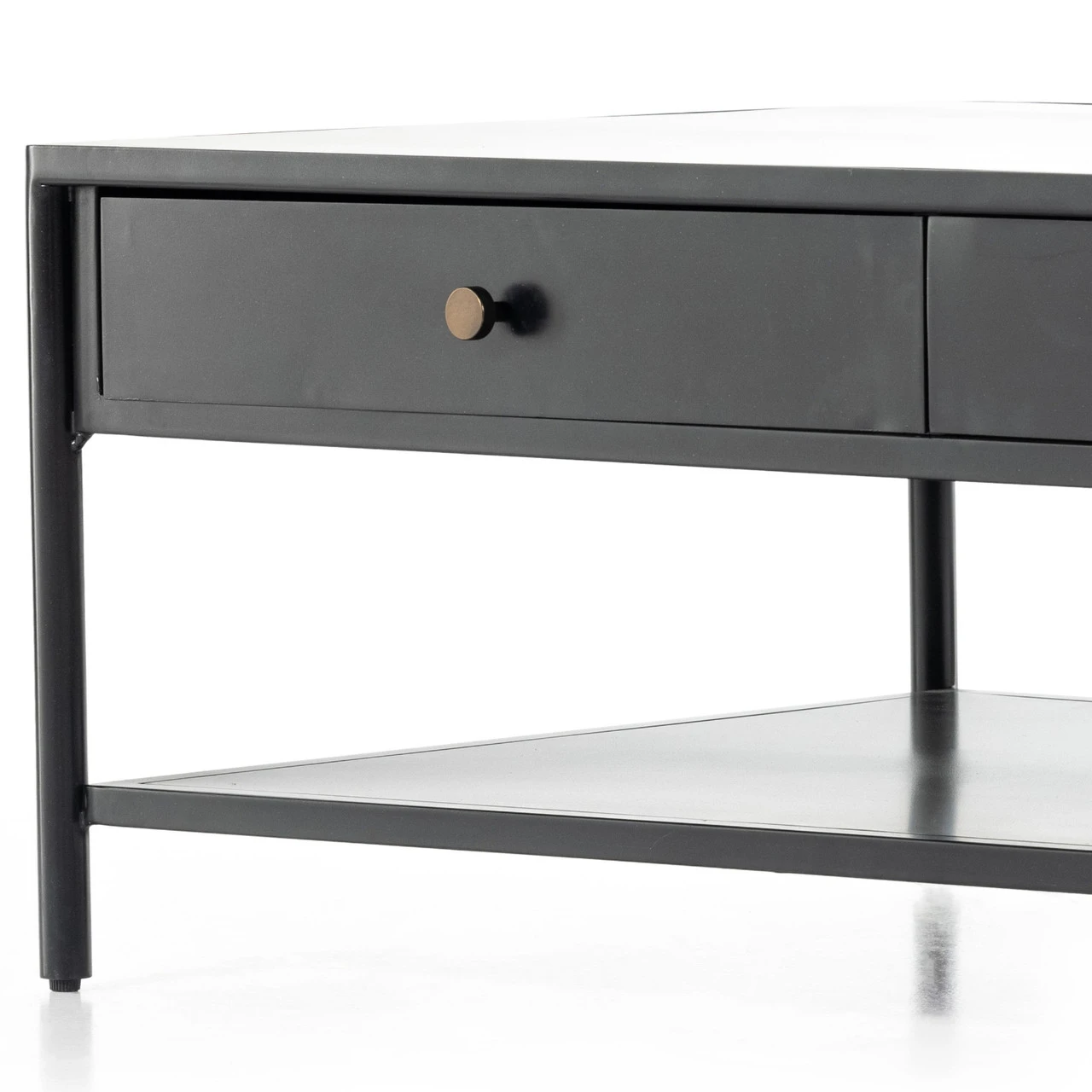 Bring a softened industrial look to the living room with a simple black-finished iron coffee table featuring bronzed iron hardware for modernity. Drawers and lower shelving add bonus storage space.