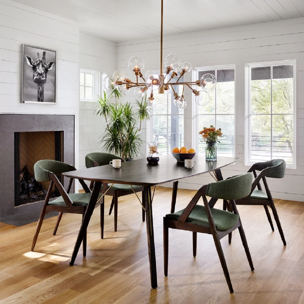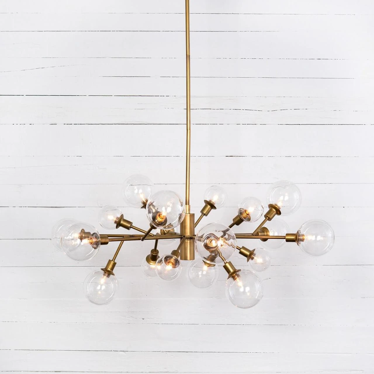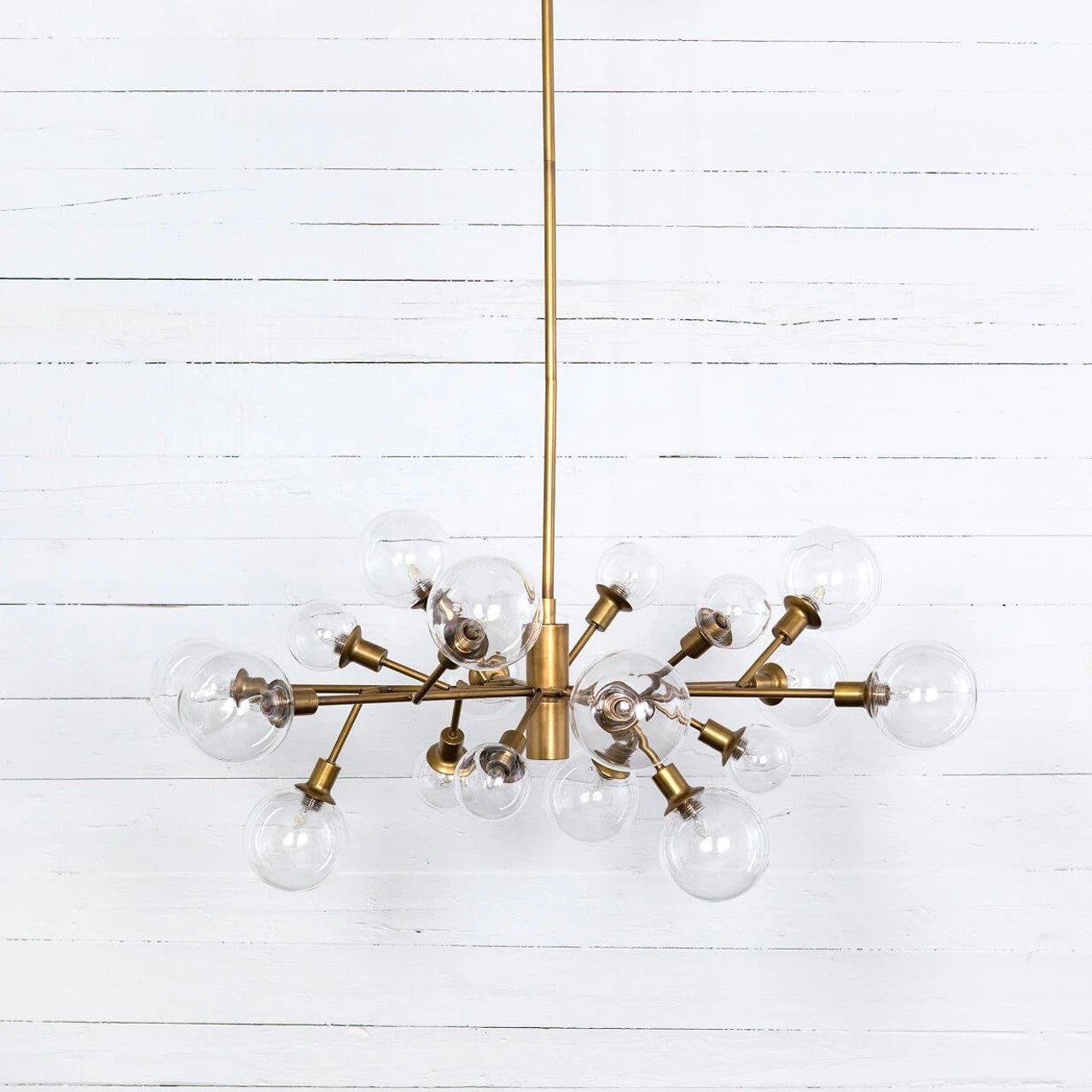 Slim iron arms are finished in flat brass for edgy elegance. Sculptural minimalist form modernizes mid-century-inspired clear glass globes. Vendor-supplied bulbs plus three 12” pipes included. Body length adjustable from 9” to “24”.