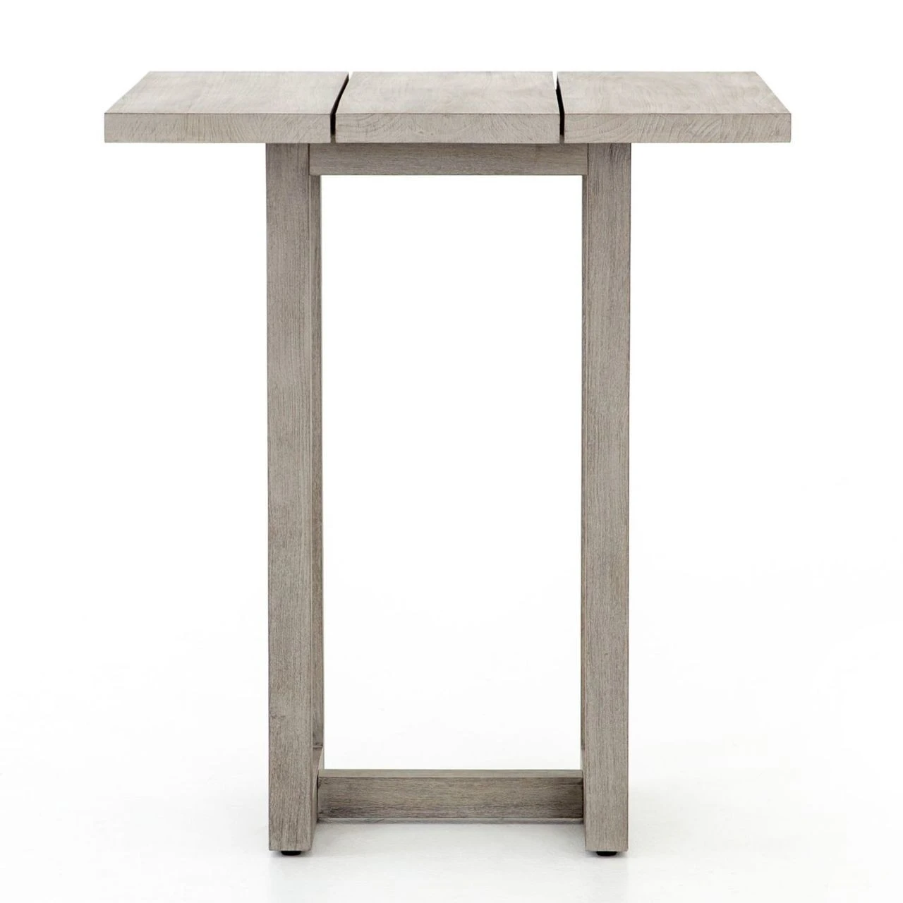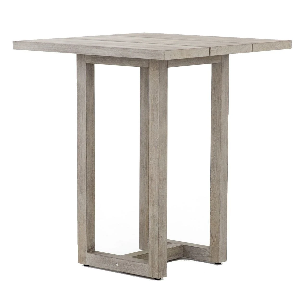 Simple and streamlined lines from Weathered grey teak wood give this square outdoor pub table warm modern style. Wide planked table top is thoughtfully designed with narrow spaces in between to let water drain through. Classic parsons design and durable construction make this inviting square teak patio bar table stunning yet comfortable addition to outdoor dining spaces.
