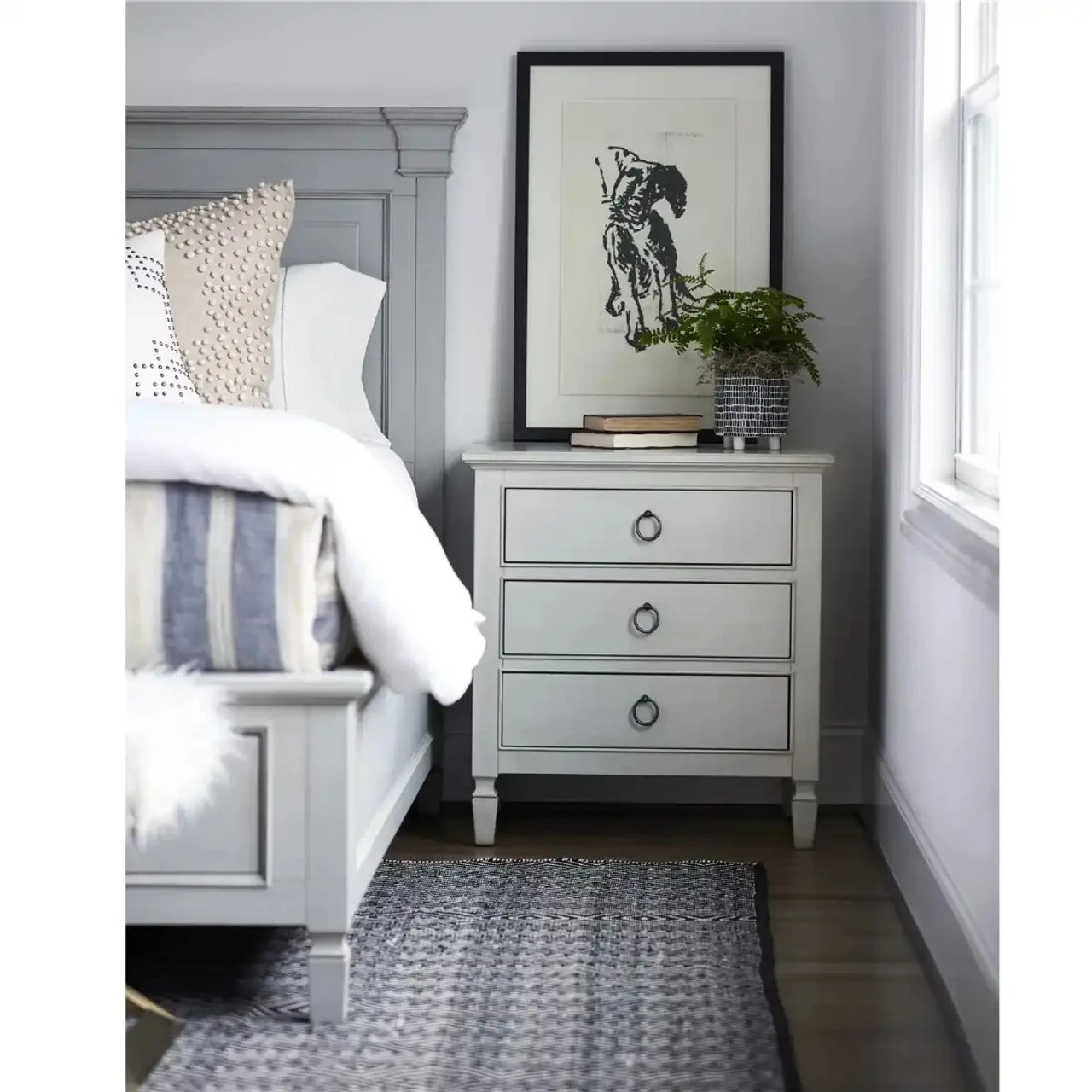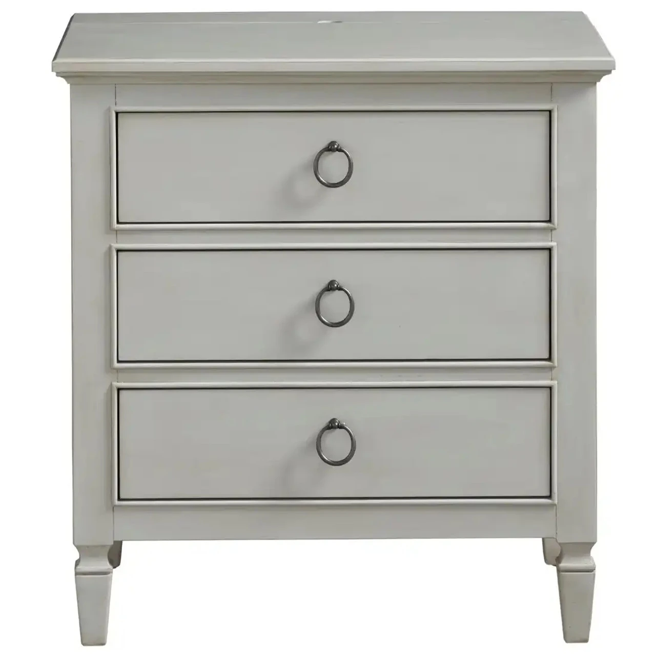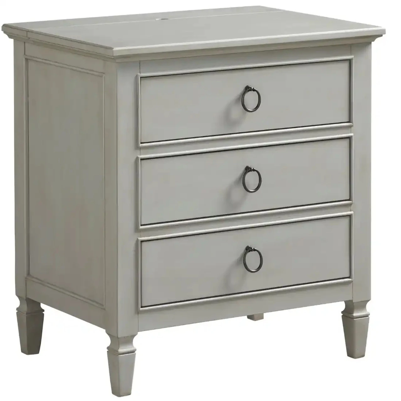 Built with three spacious drawers, chic ring pull hardware and finished in a soft gray tone, the Summer Hill Nightstand is an ideal and convenient complement to any bed frame.