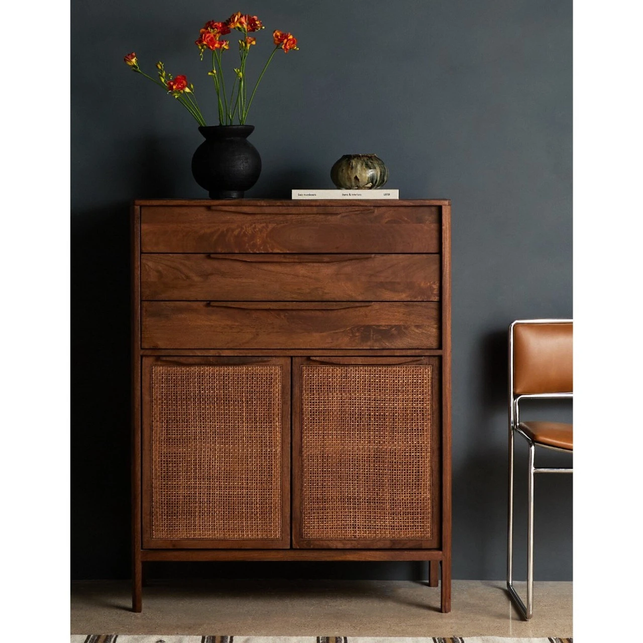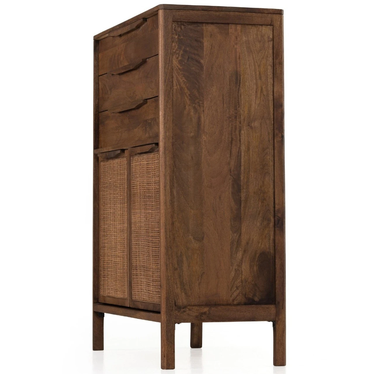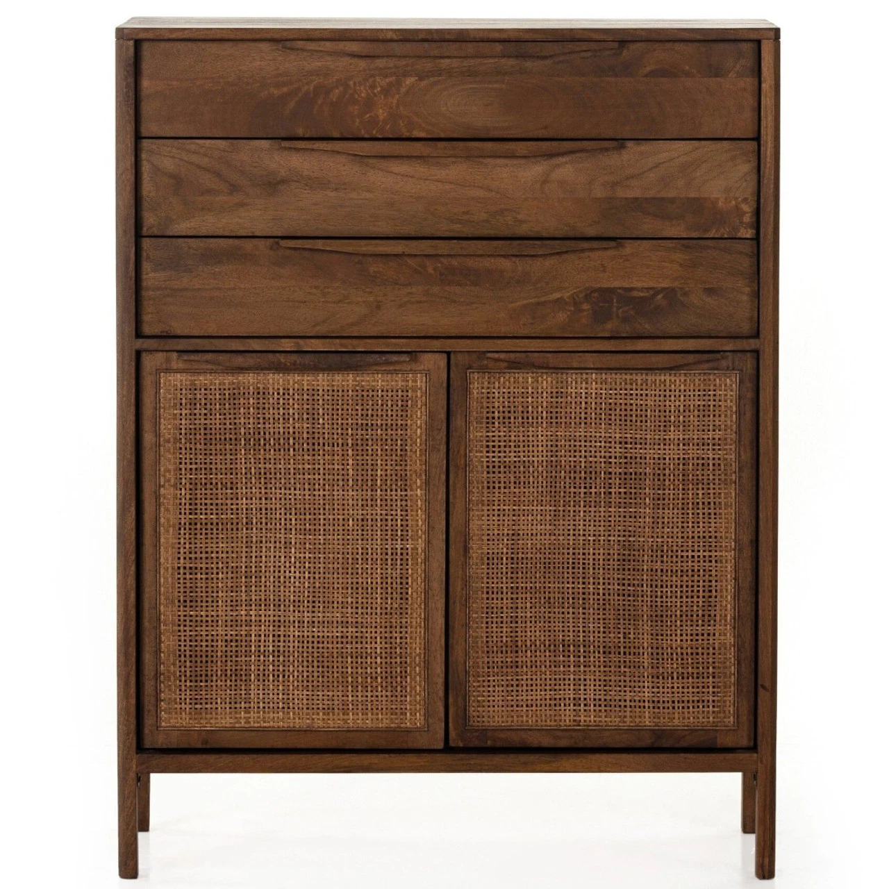 Brown-washed mango framing features front cabinetry of woven cane, for a light, textural look with monochromatic vibes. A top trio of drawers brings plenty of storage space to the bedroom. Our Sydney Woven Cane Tall Chest Of Drawers brings a relaxed coastal beach look to any bedroom decor.