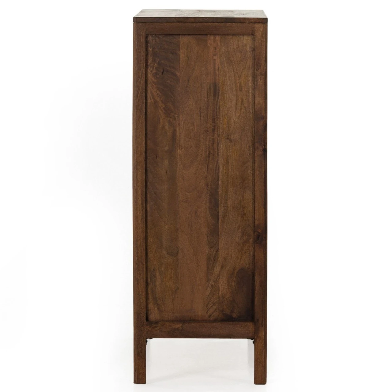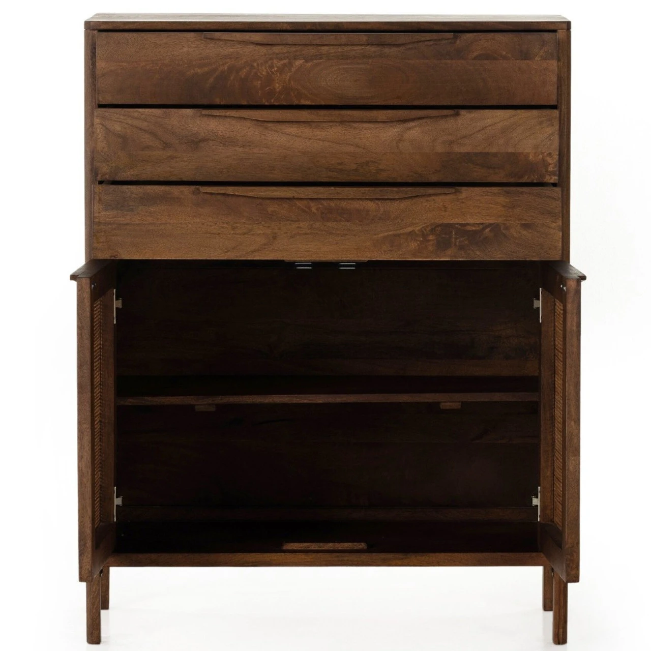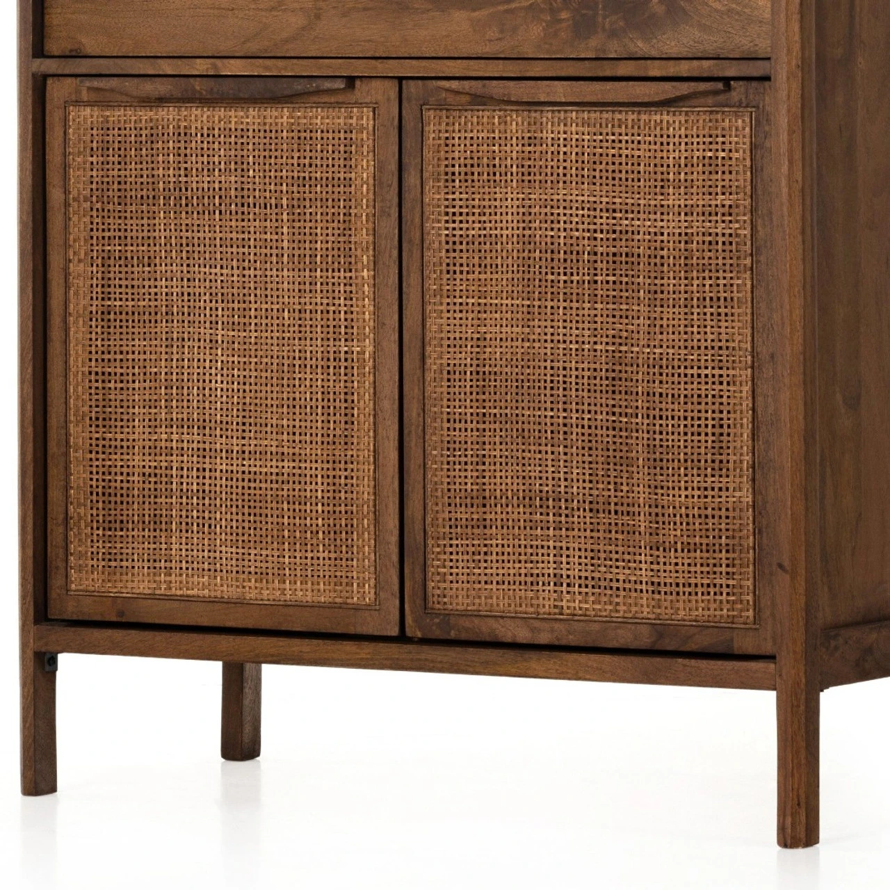 Brown-washed mango framing features front cabinetry of woven cane, for a light, textural look with monochromatic vibes. A top trio of drawers brings plenty of storage space to the bedroom. Our Sydney Woven Cane Tall Chest Of Drawers brings a relaxed coastal beach look to any bedroom decor.