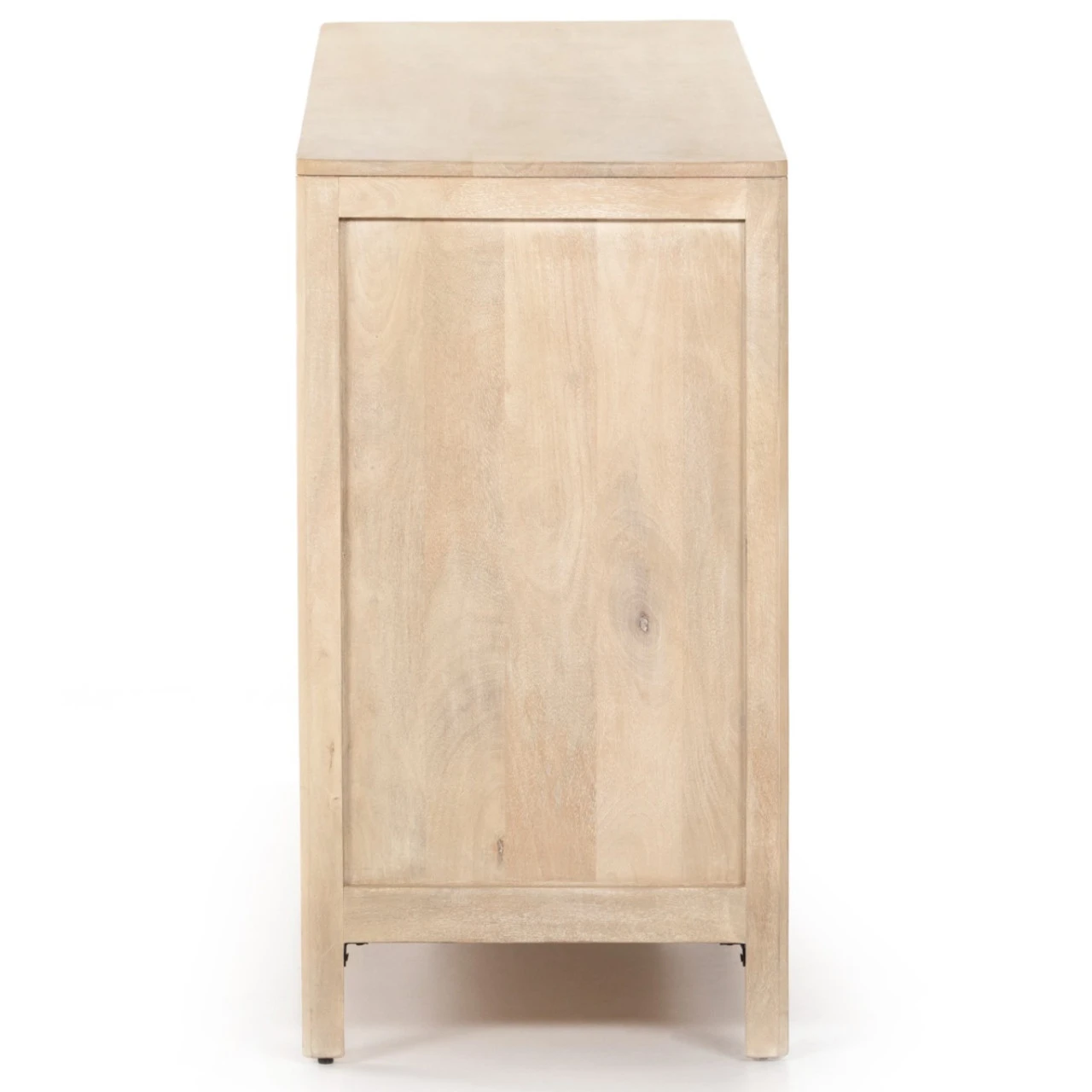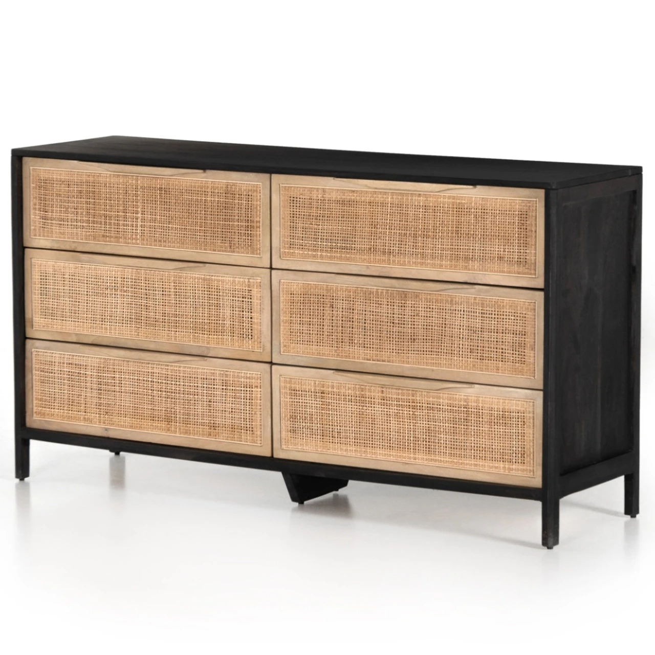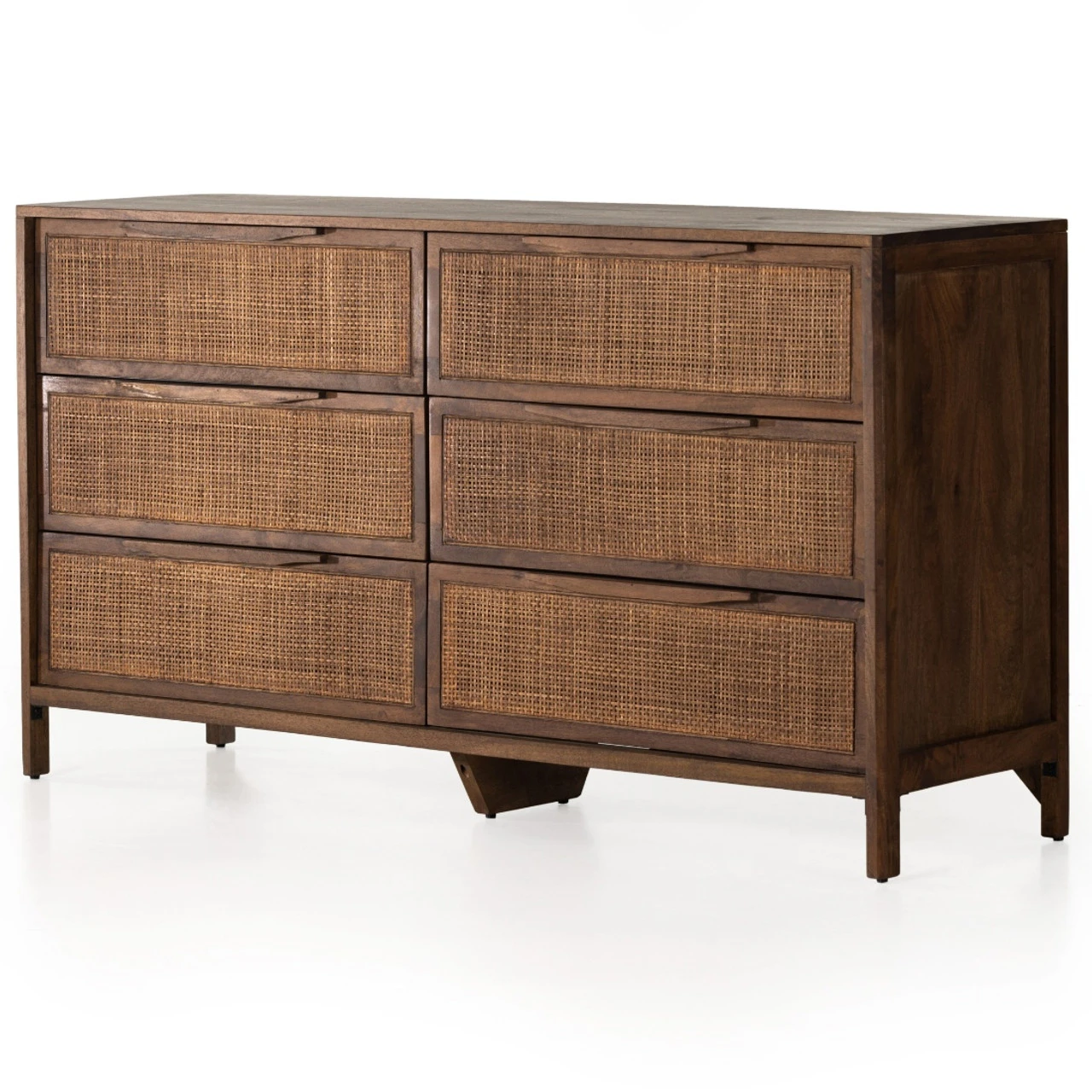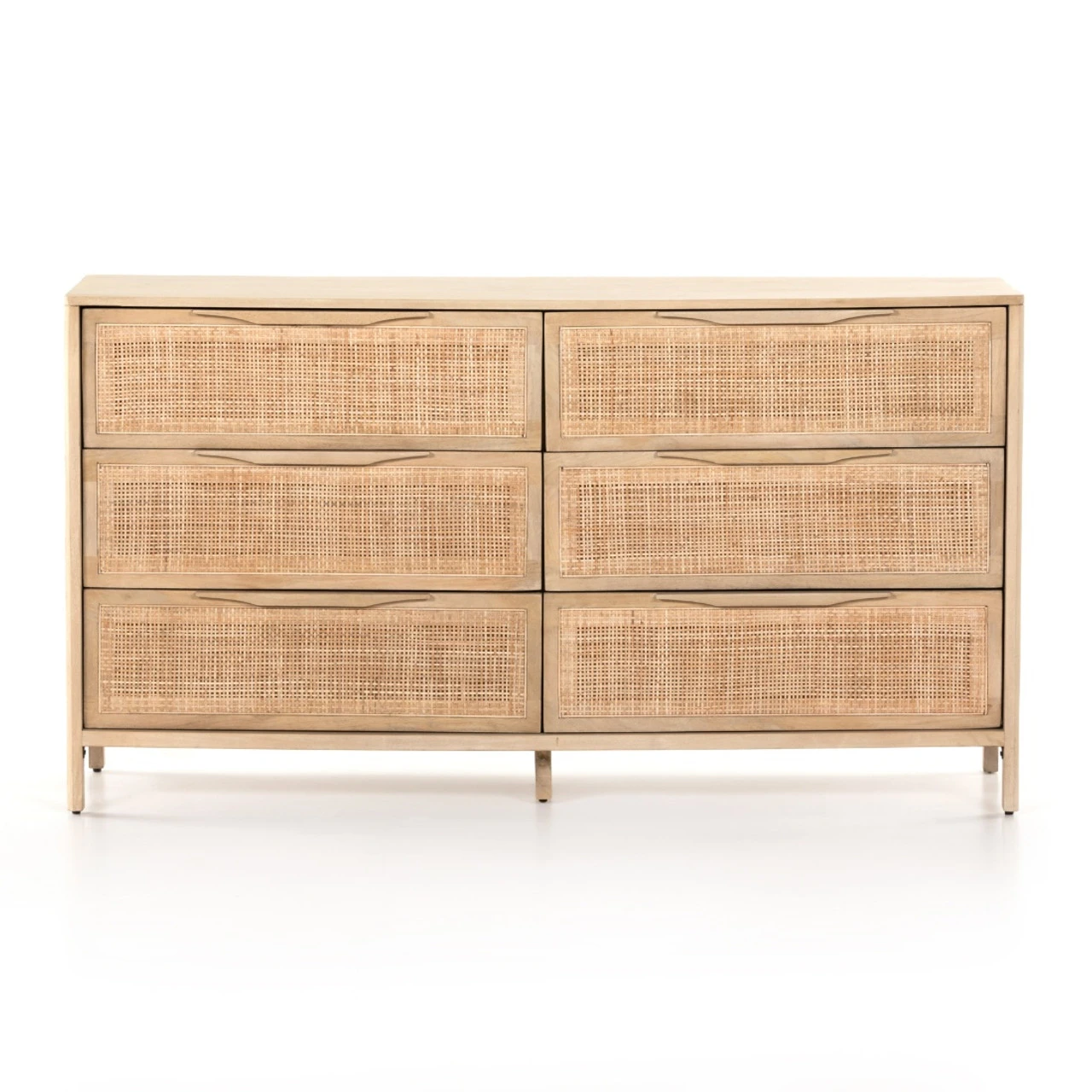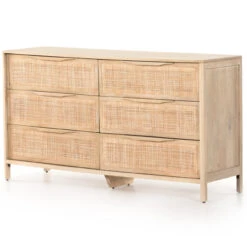 Natural mango framing features front cabinetry of woven cane, for a light, textural look with fresh organic allure. Natural mango encases six spacious drawers of woven cane, for a textural look with eye-catching contrast. Our Sydney Woven Cane 6 Drawers Dresser brings a relaxed coastal beach look to any bedroom decor.