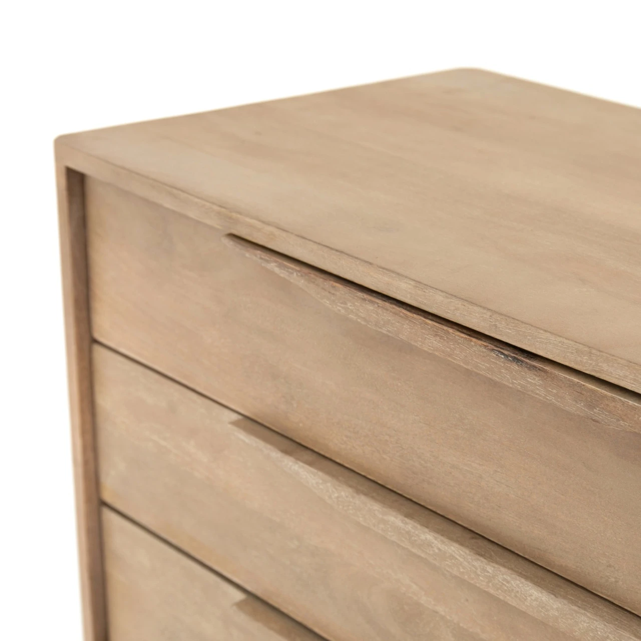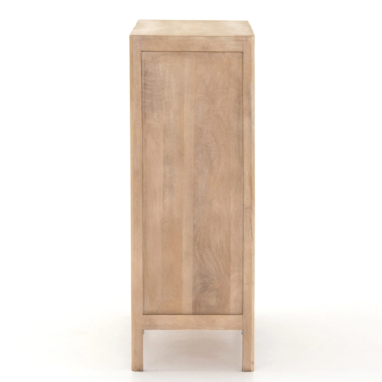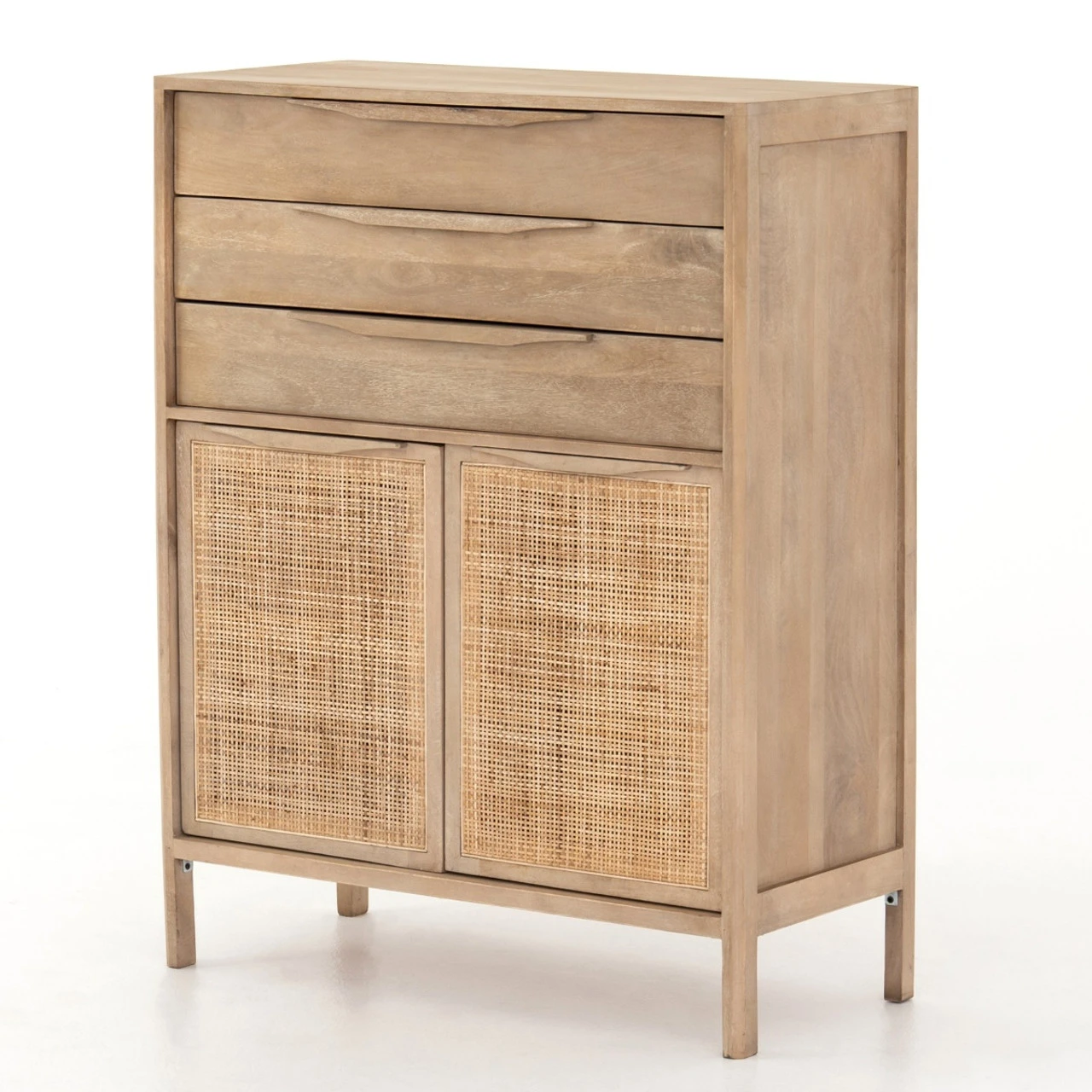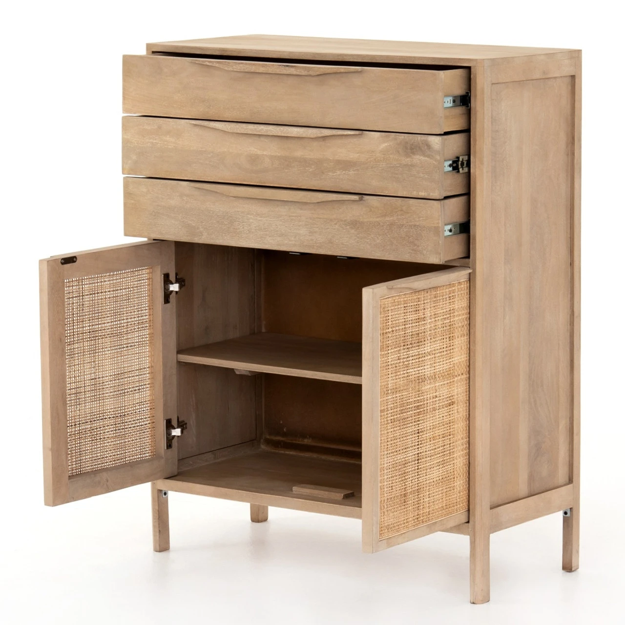 Natural mango framing features front cabinetry of woven cane, for a light, textural look with fresh organic allure. A top trio of drawers brings plenty of storage space to the bedroom. Our Sydney Woven Cane Tall Chest Of Drawers brings a relaxed coastal beach look to any bedroom decor.