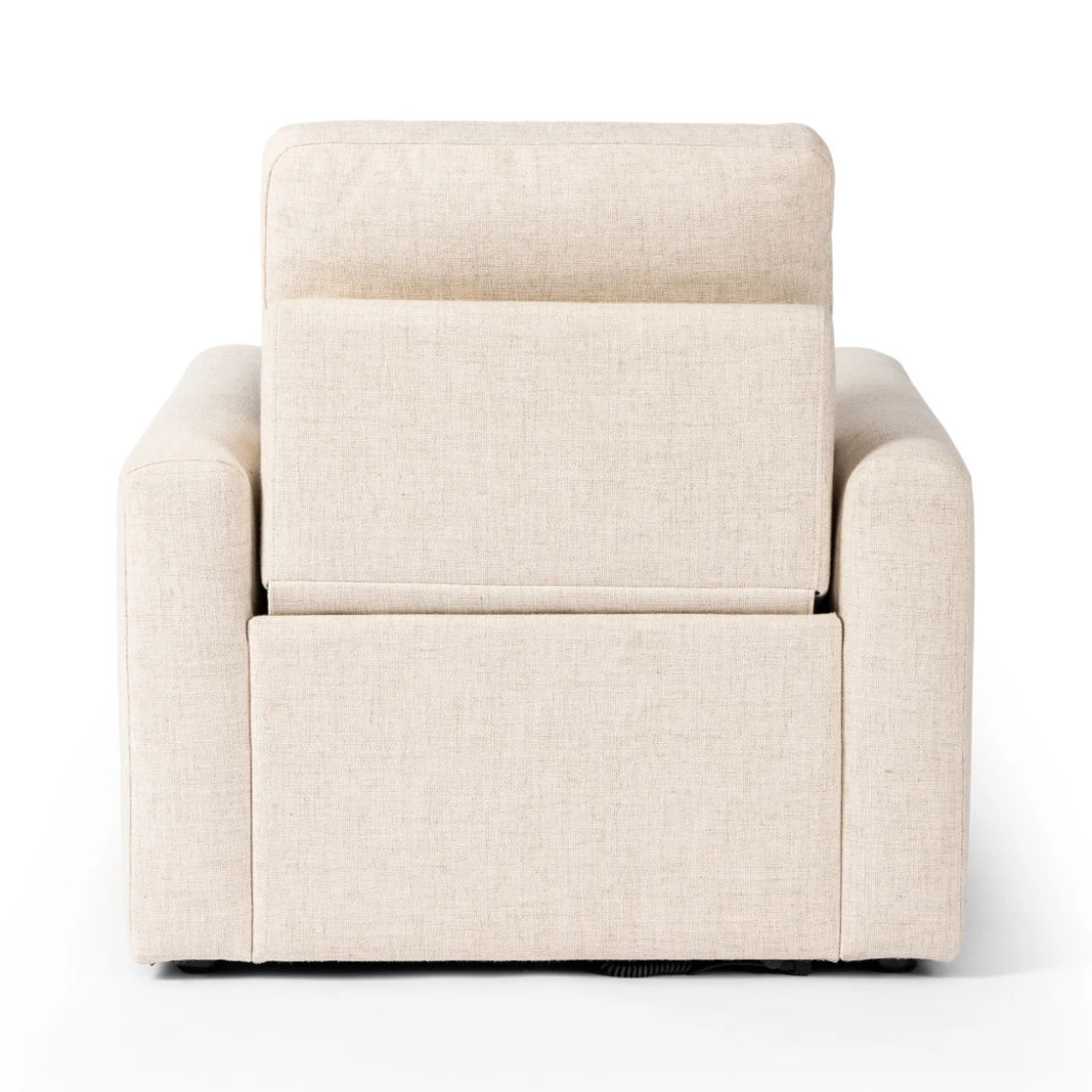 A modern, elevated take on the traditional recliner chair. Customize your comfort level with the push of discrete buttons with our Power Motion collection. Recliner Chair features a slightly higher seat and backrest with loose cushions, low, sleek arms, and a motion footrest. Upholstered in a classic linen fabric for a effortless, lived-in look. Includes 9’5″ power cord.