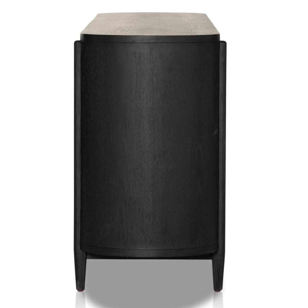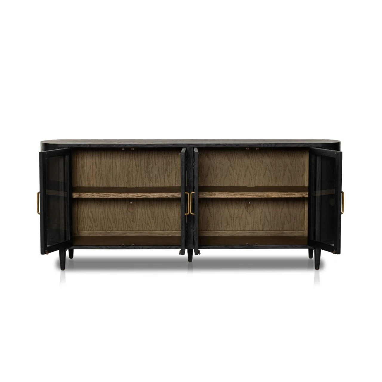 Elevate the aesthetics of your living space with this sophisticated and chic buffet sideboard. Its Solid oak wood rounded frame and glass doors create a distinctive and captivating look that will become your room’s focal point. The metal is finished with antique brass, exuding a timeless aura that will endure the test of time. This modern oak sideboard features ample storage space, with two generous shelves concealed behind each door, providing an ideal spot to store everything from plates to novels. Keeping your belongings out of sight maintains the room’s tidy and streamlined look.