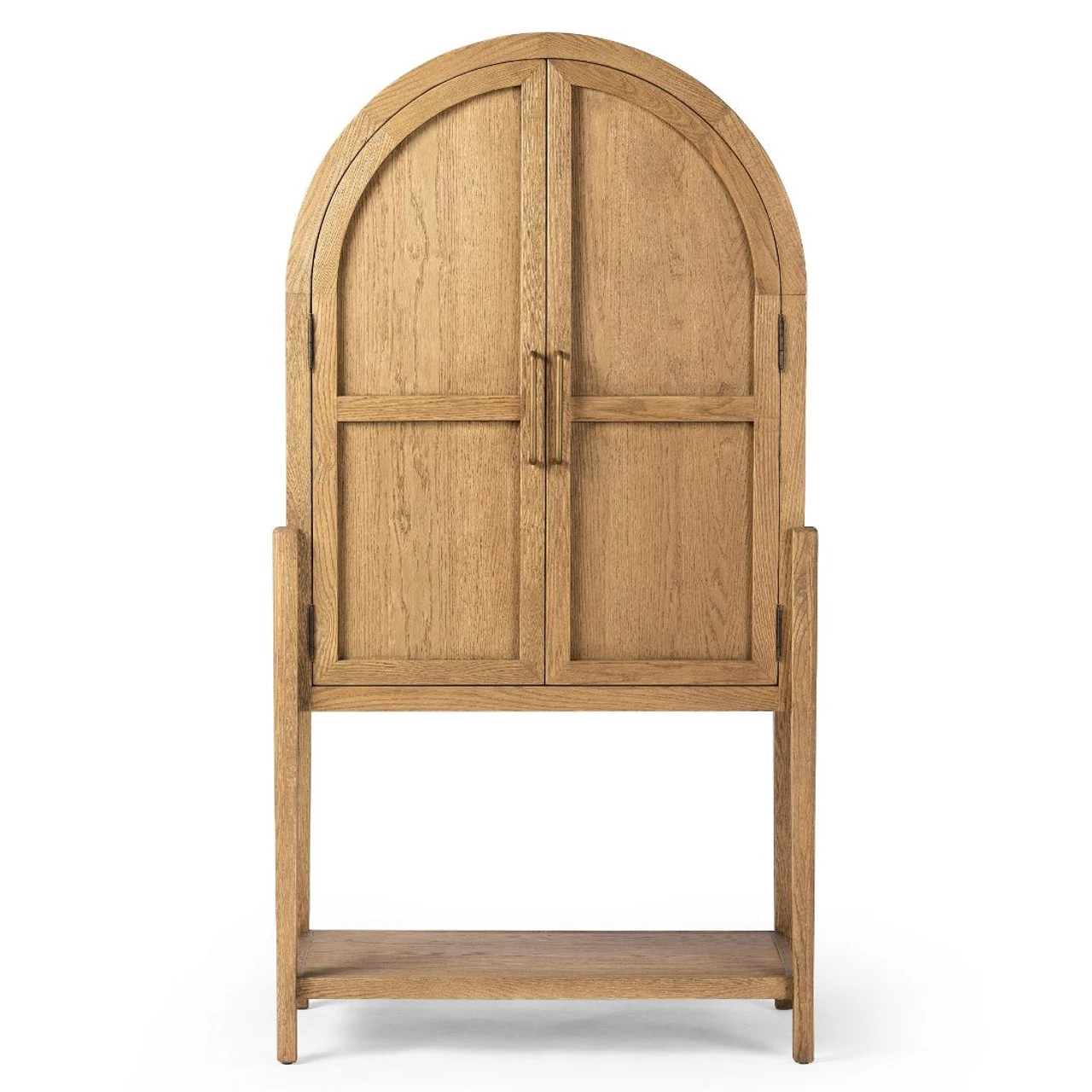 Looking for a stylish and functional piece to complete your home bar? Store it in style. Arched shaped bar cabinet crafted of Drifted finished solid oak wood with recessed wood panels and iron hardware in an antique brass finish. Features thick, spacious shelves to store all your favorite spirits, mixers, and bar accessories,convenient stemware rack that keeps your wine glasses within easy reach.