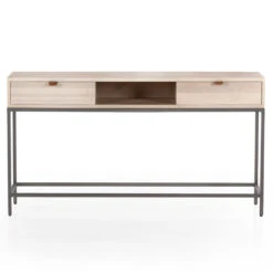 Inspired by clean midcentury design, solid poplar offers media storage and more by way of a center cubby and dual side drawers. Metal-secured leather pulls add a textural element of surprise.