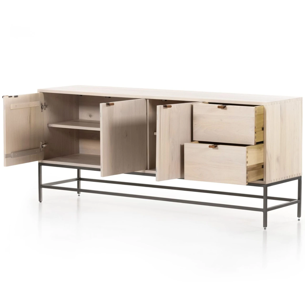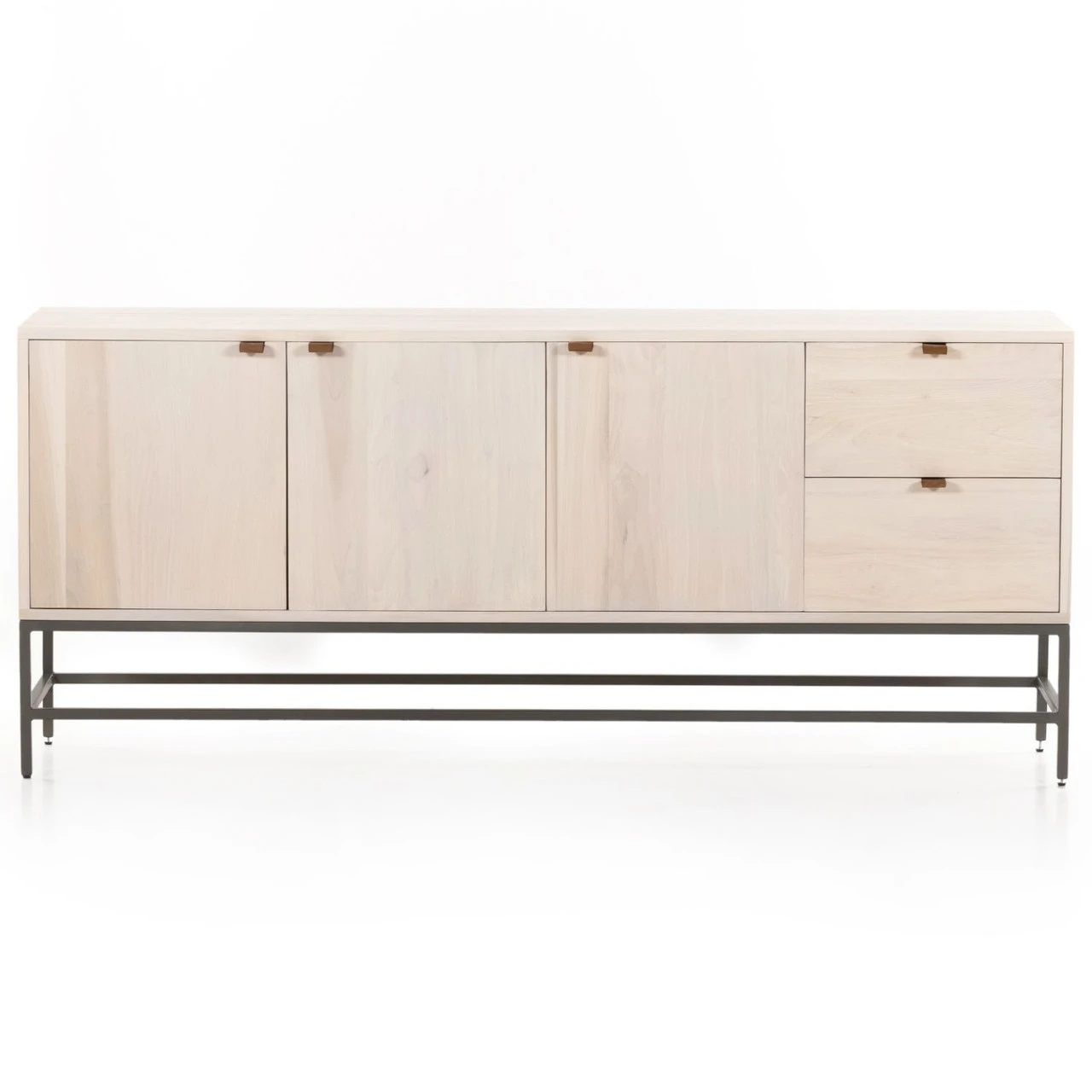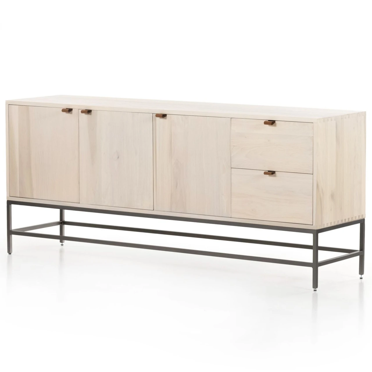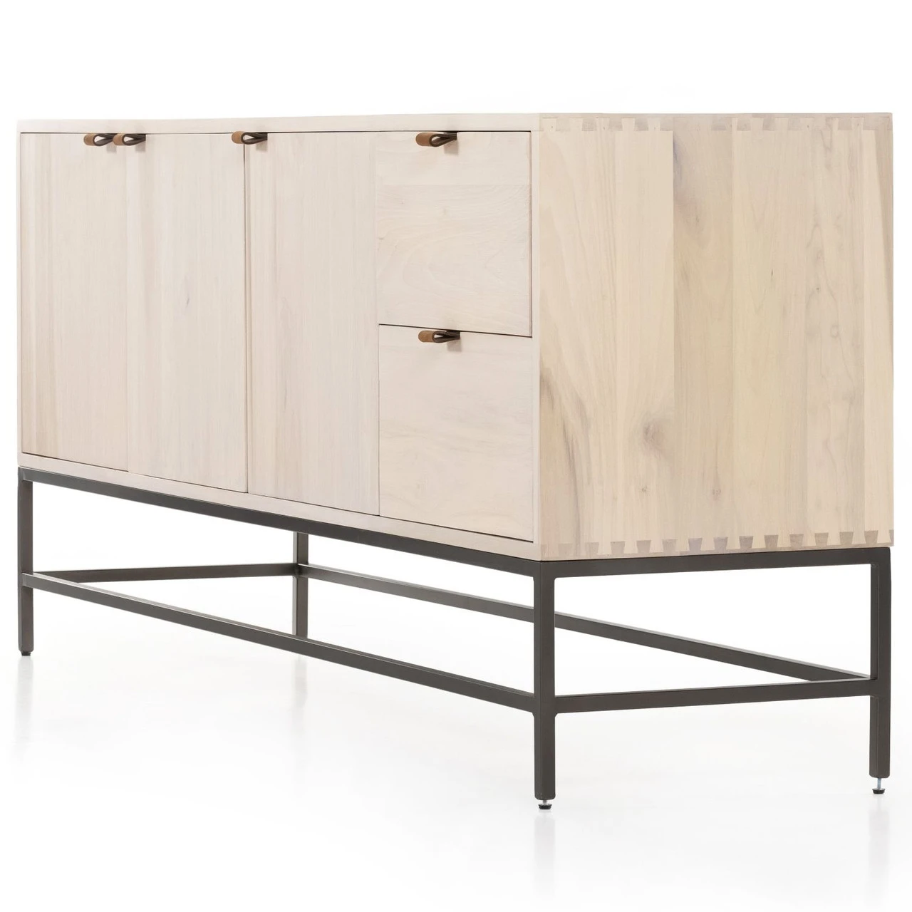 Inspired by clean midcentury design, a stylish sideboard of light-washed solid poplar offers plenty of storage space thanks to roomy cabinetry plus dual drawers. Metal-secured pulls of top-grain leather add a textural element of surprise.