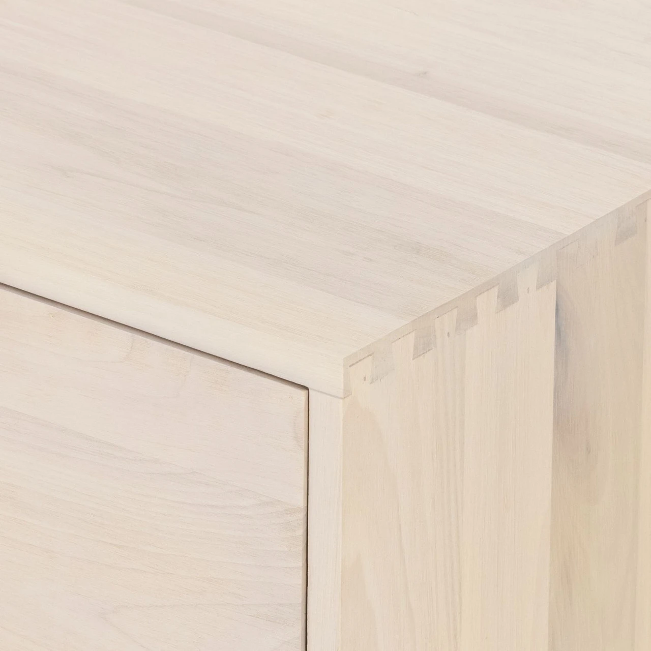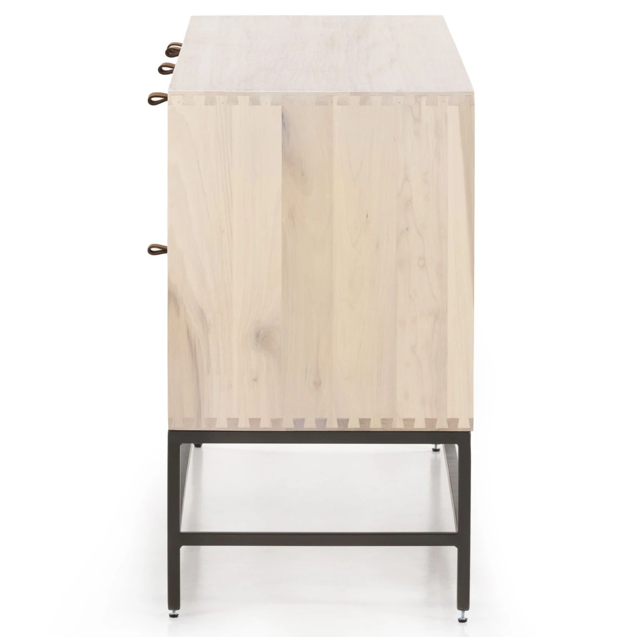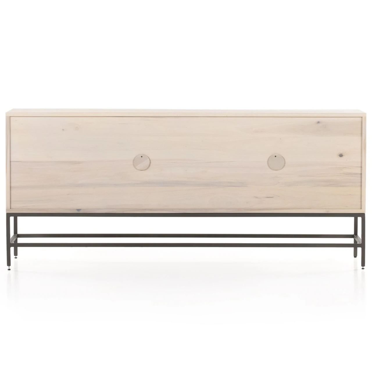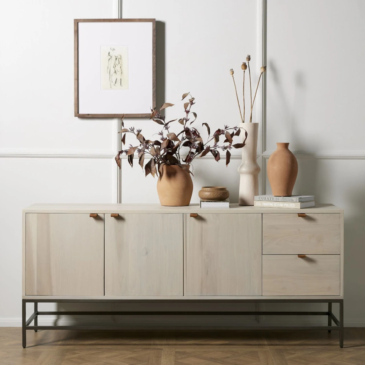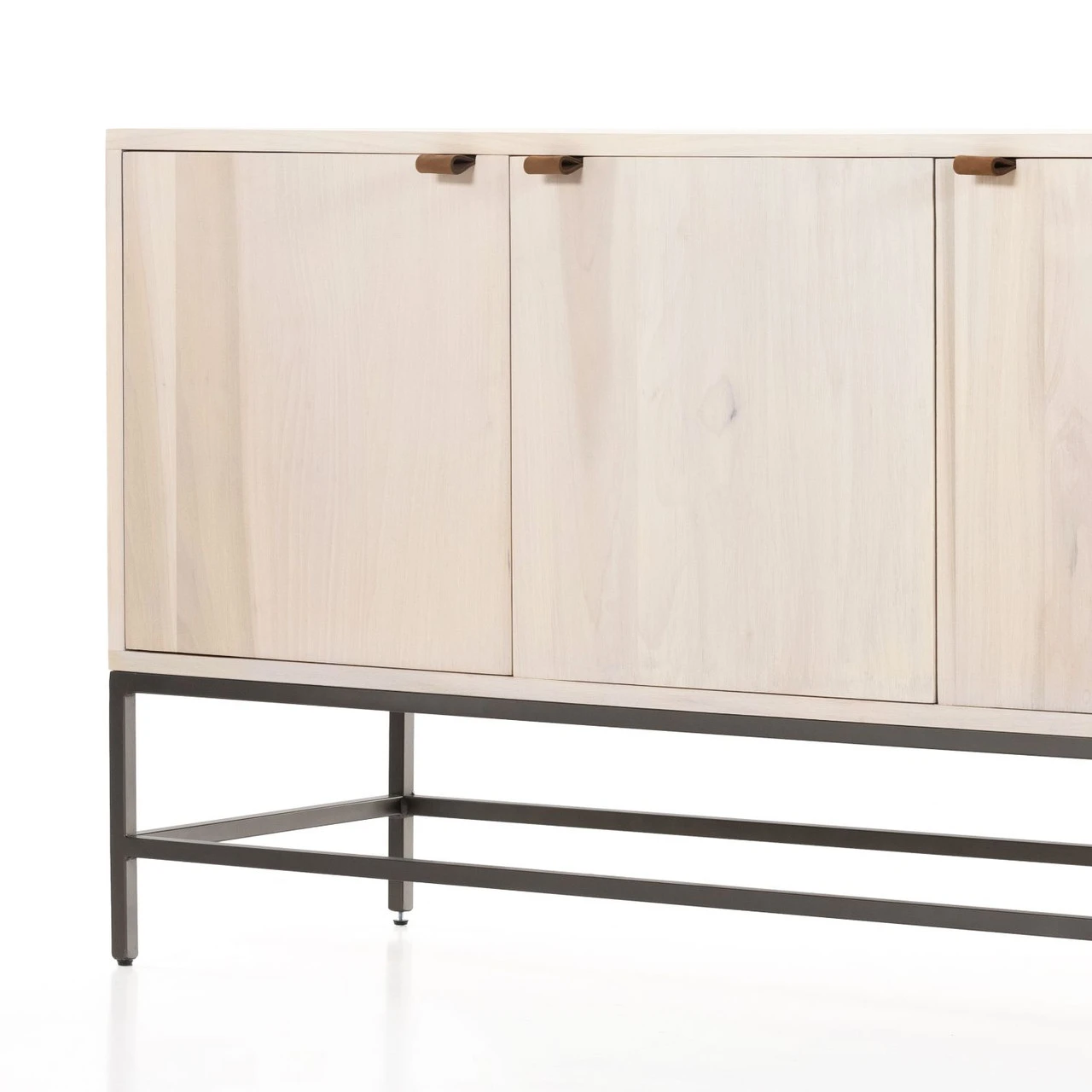 Inspired by clean midcentury design, a stylish sideboard of light-washed solid poplar offers plenty of storage space thanks to roomy cabinetry plus dual drawers. Metal-secured pulls of top-grain leather add a textural element of surprise.
