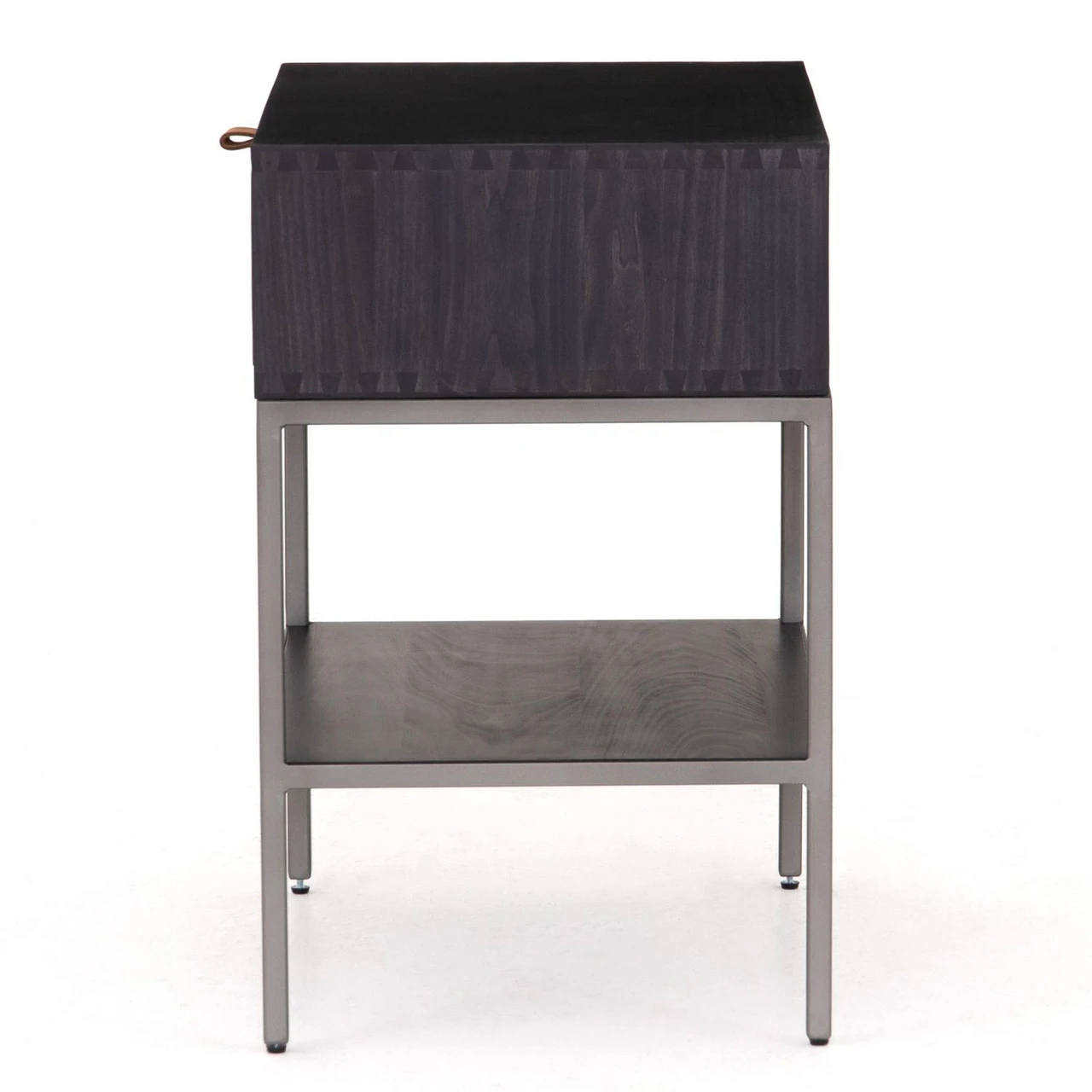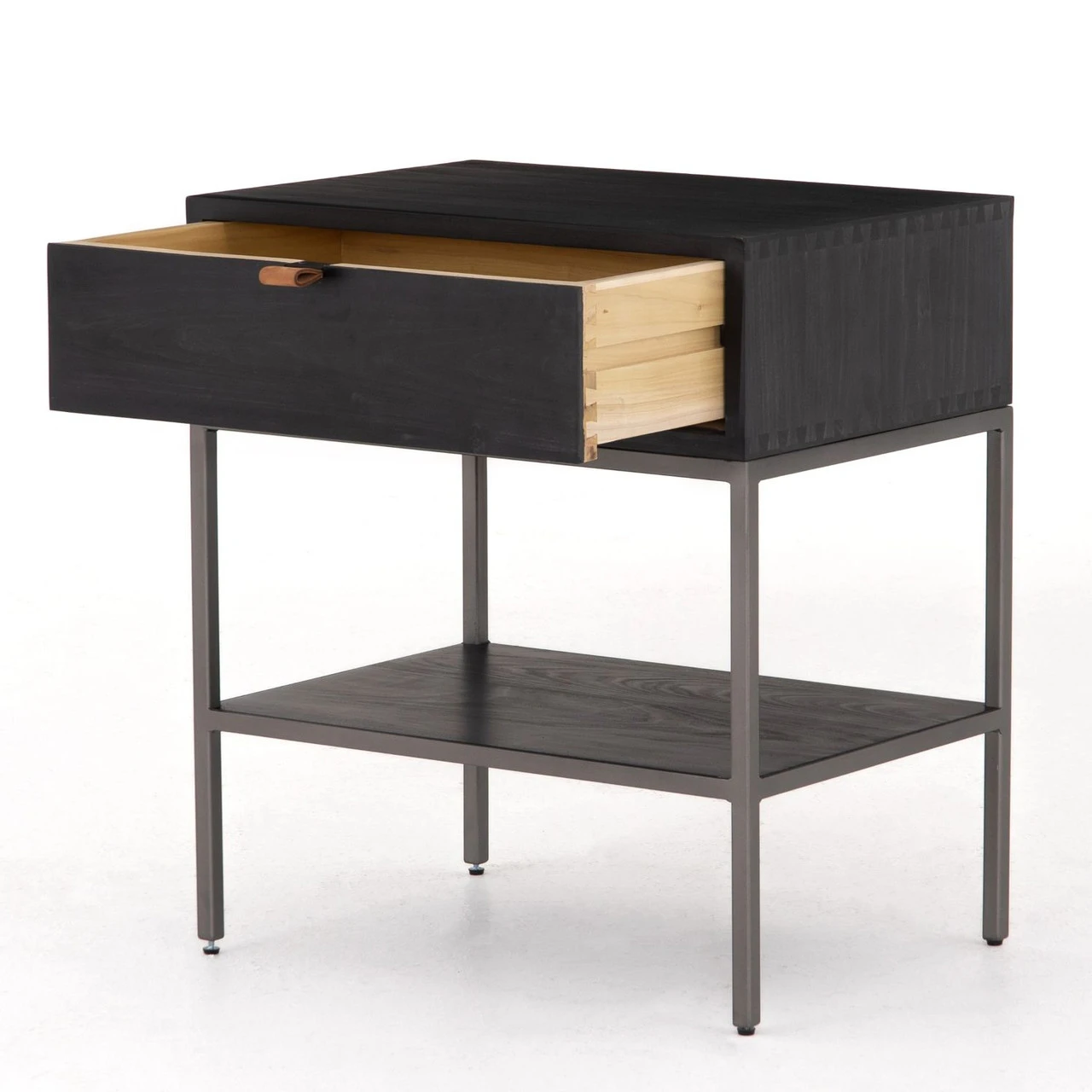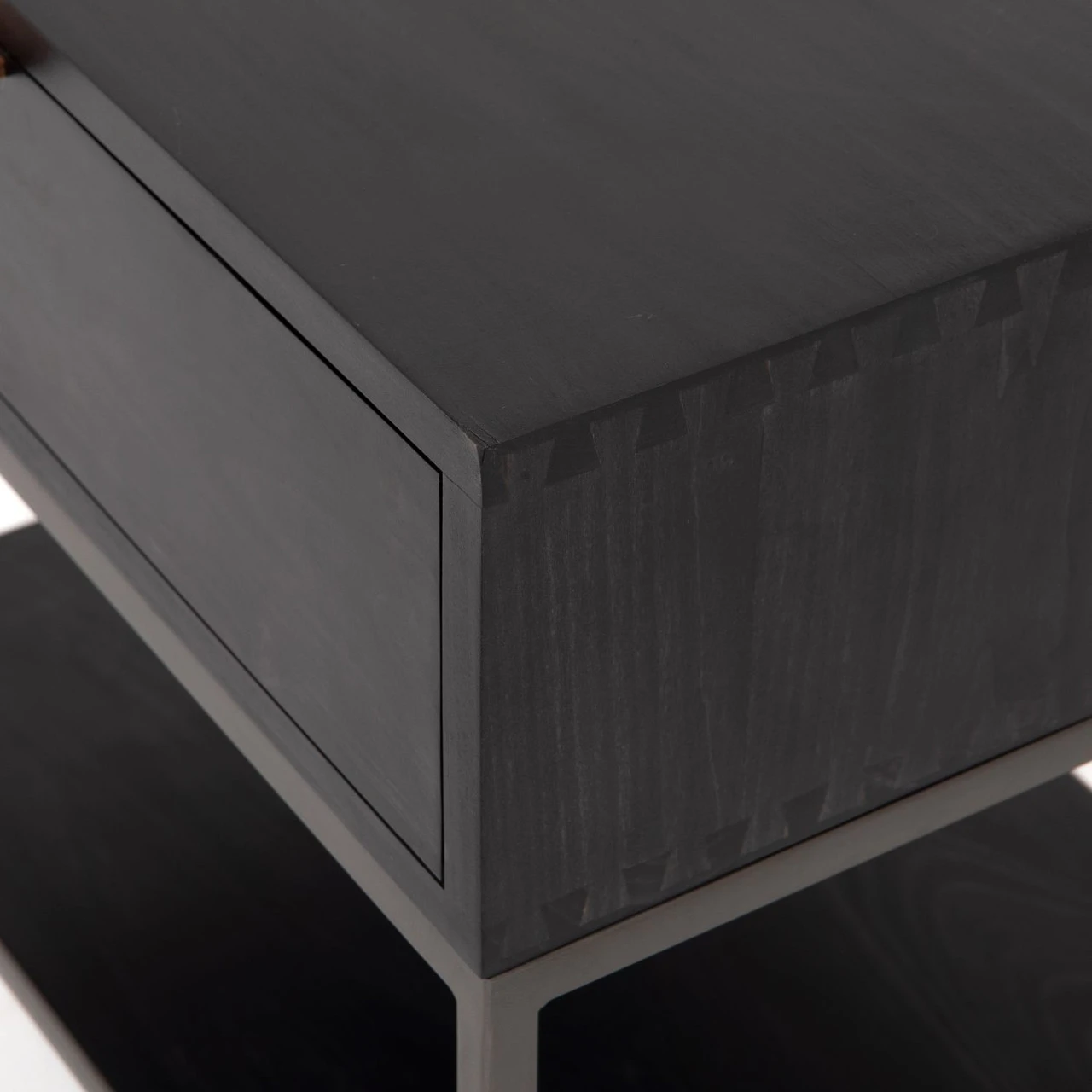 Inspired by clean mid-century design, a stylish nightstand of solid black/auburn-washed poplar brings extra space to bedside storage. Metal-secured leather pull adds a textural element of surprise.